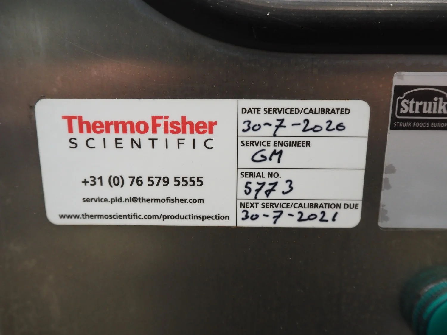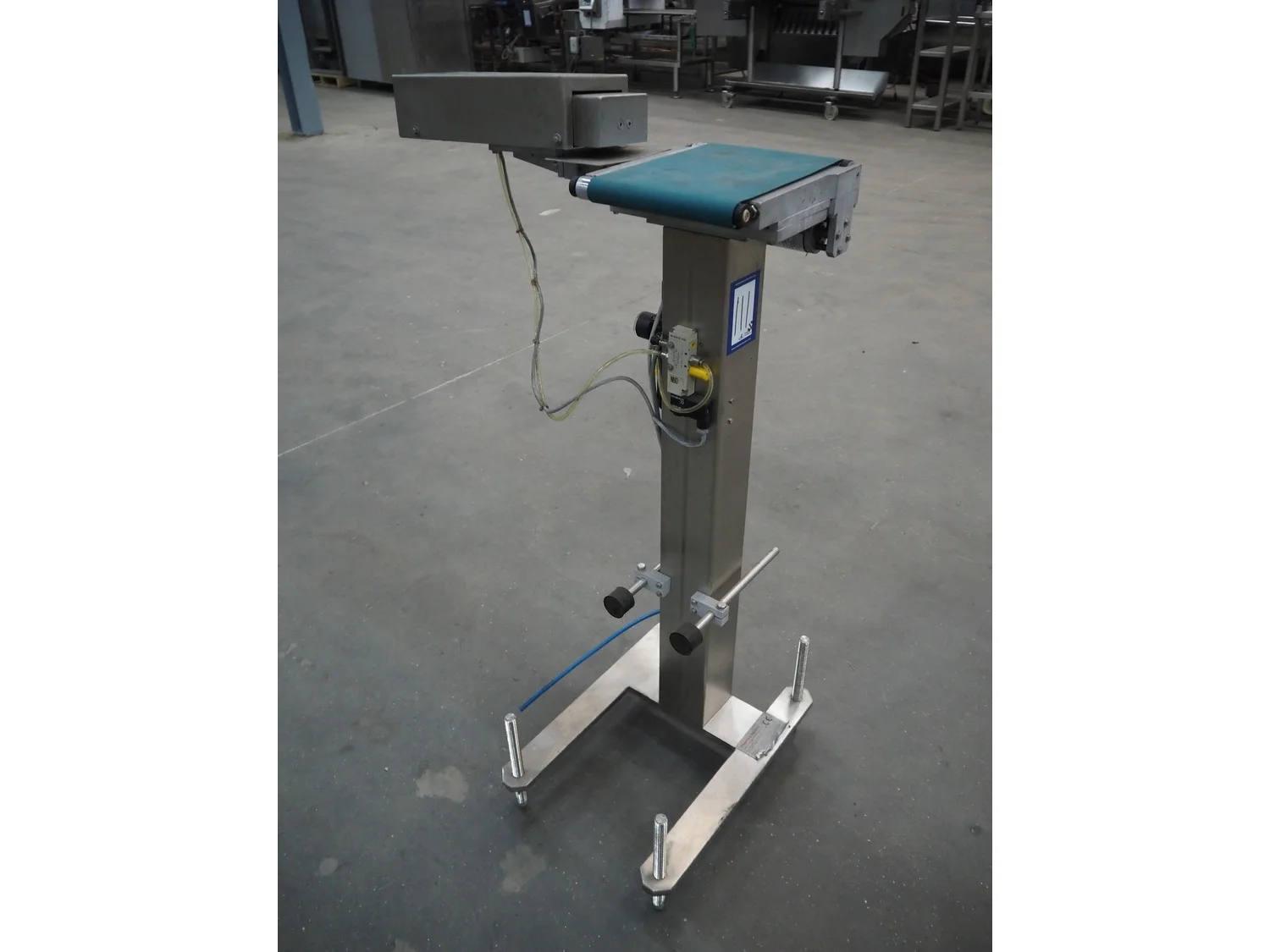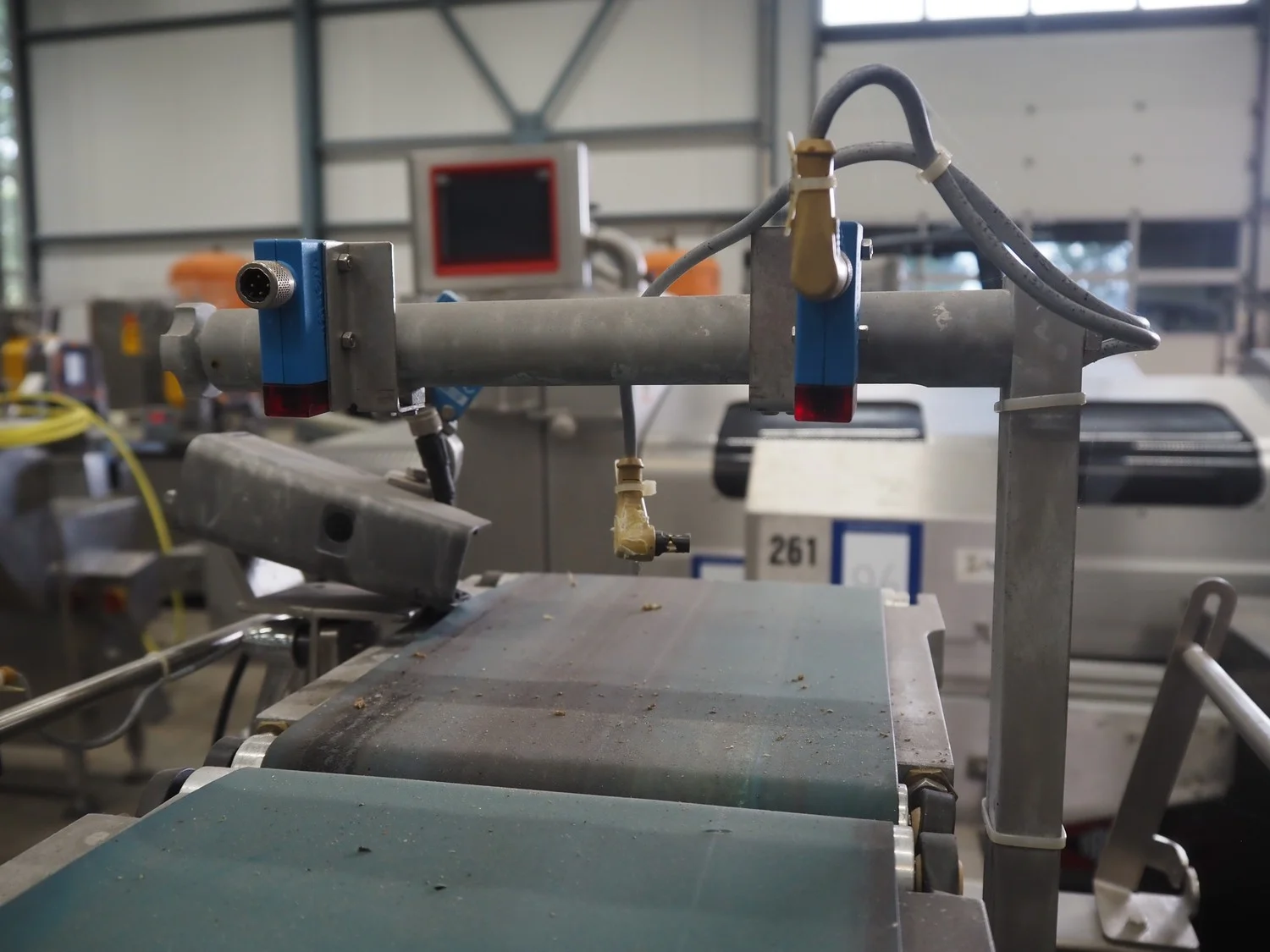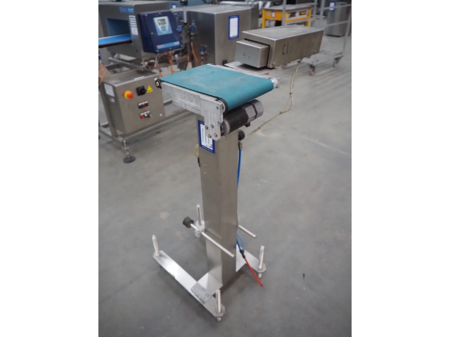 Thermo Ramsey checkweigher with rejecter, model: Sentron C, serial number: 5773, year of construction: 2003, 230 V, 50 Hz, 0.6 kVA, maximum weight: 1500 gram, minimum weight: 35 gram, e=: 0.5 gram, plastic belt, belt width: 195 mm, total dimensions: 900 mm x 800 mm x 1250 mm. With Thermo Ramsey control panel, dimensions: 500 mm x 430 mm x 1770 mm.