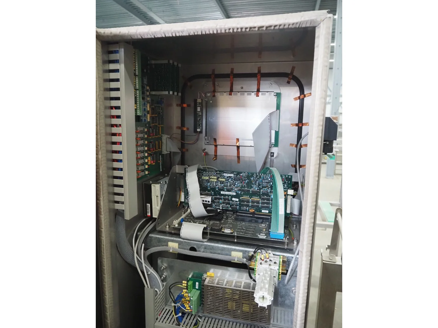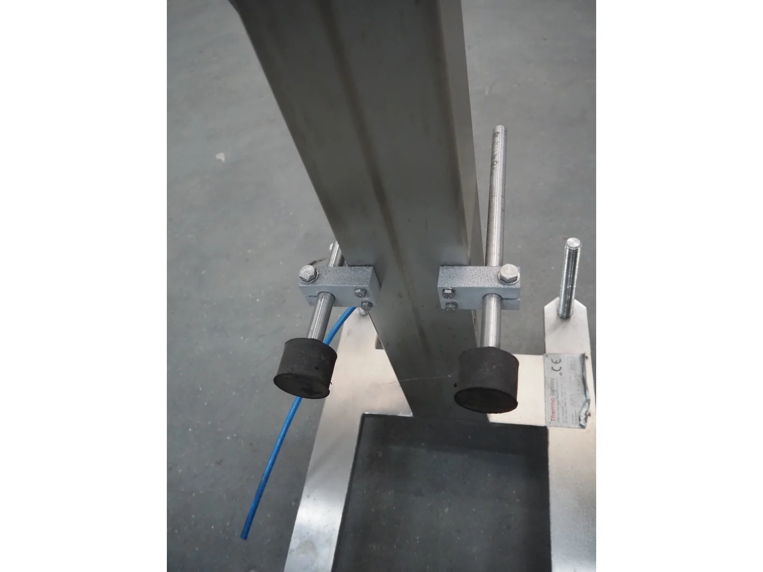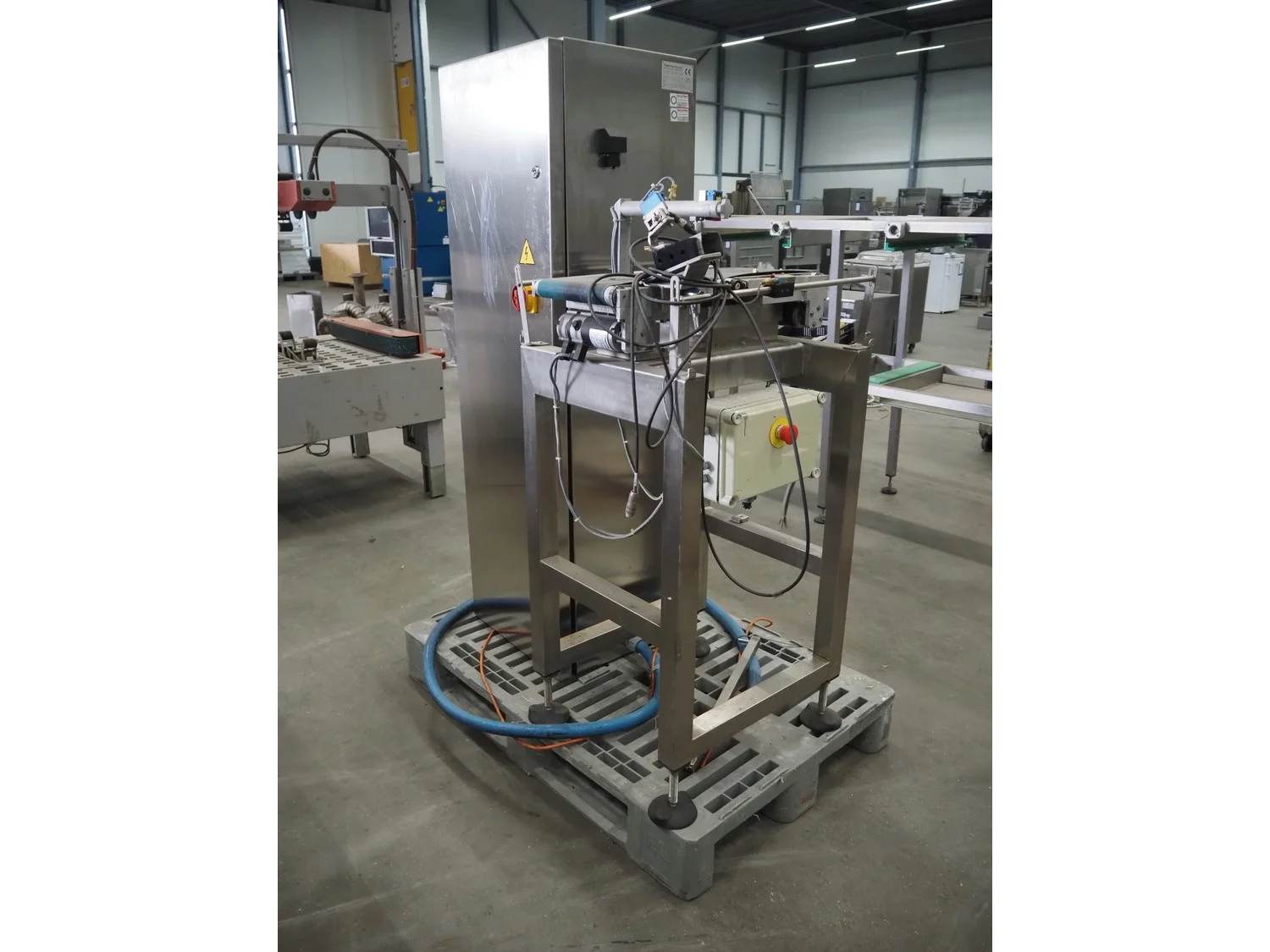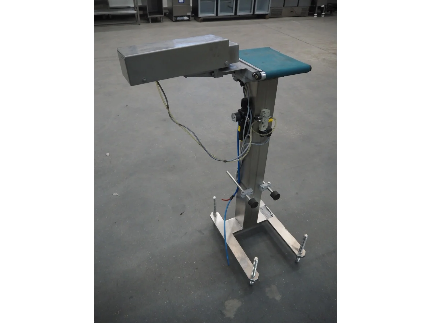 Thermo Ramsey checkweigher with rejecter, model: Sentron C, serial number: 5773, year of construction: 2003, 230 V, 50 Hz, 0.6 kVA, maximum weight: 1500 gram, minimum weight: 35 gram, e=: 0.5 gram, plastic belt, belt width: 195 mm, total dimensions: 900 mm x 800 mm x 1250 mm. With Thermo Ramsey control panel, dimensions: 500 mm x 430 mm x 1770 mm.