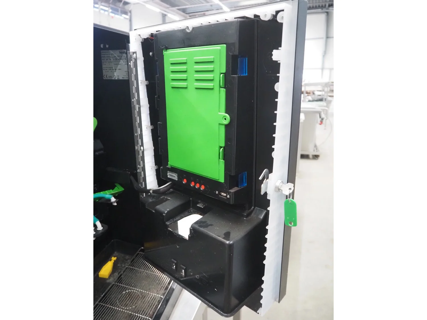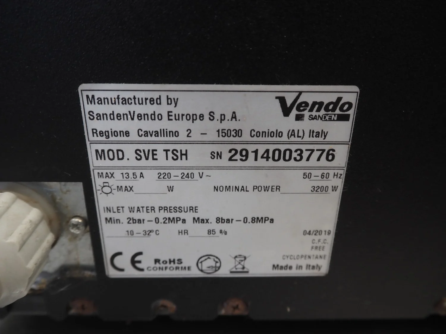 SandenVendo Europe S.p.A. coffee machine, model: SVE TSH, serial number: 2914003776, year of construction: 04/2019, 220-240 V, 50-60 Hz, 3200 Watt, dimensions: 420 mm x 490 mm x 365 mm.
