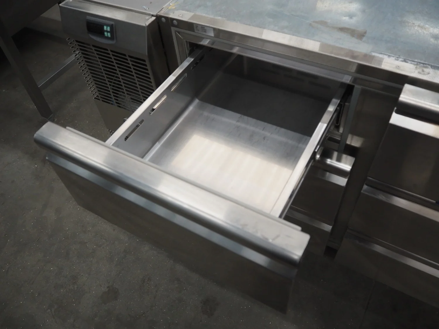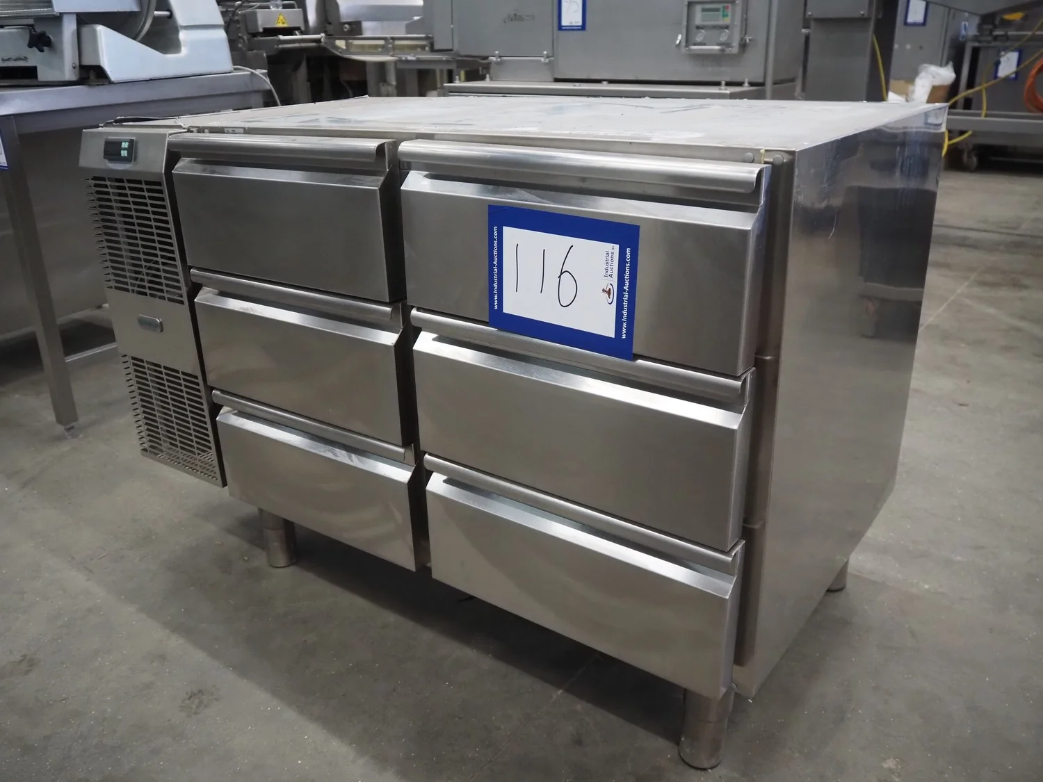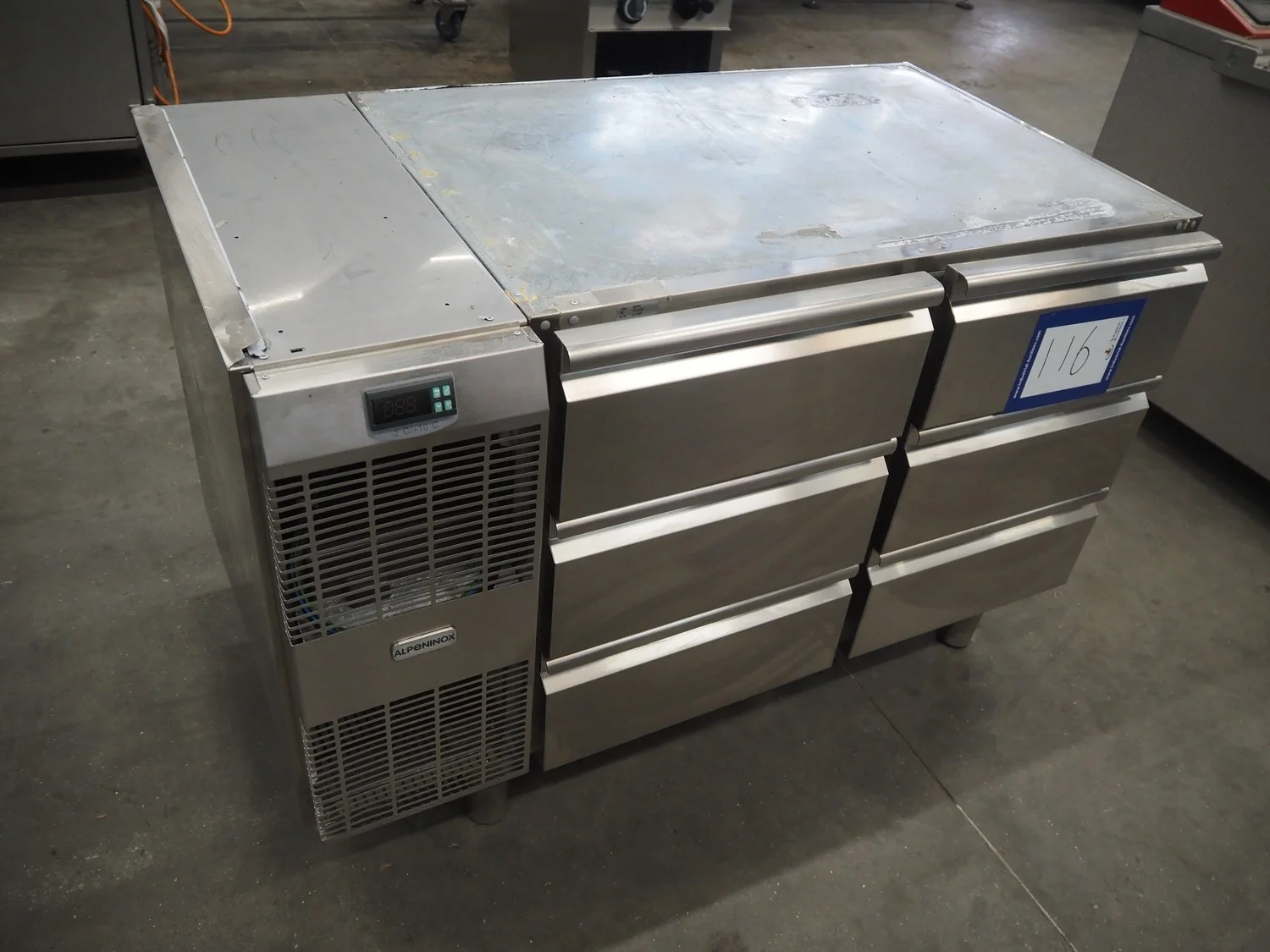 Alpeninox refrigerated counter with 6 drawers, model: HB2PNT, serial number: 61510001, inside dimensions: (6x) 300 mm x 520 mm x 100 mm, total dimensions: 1220 mm x 700 mm x 820 mm.