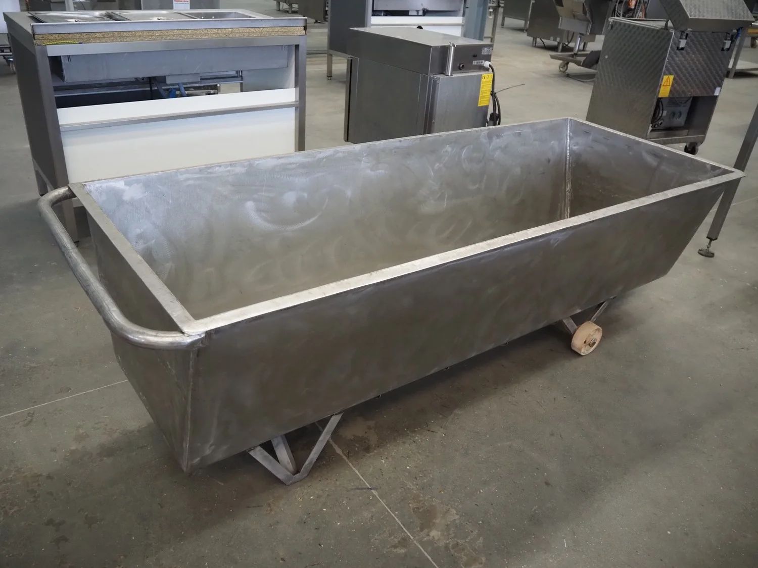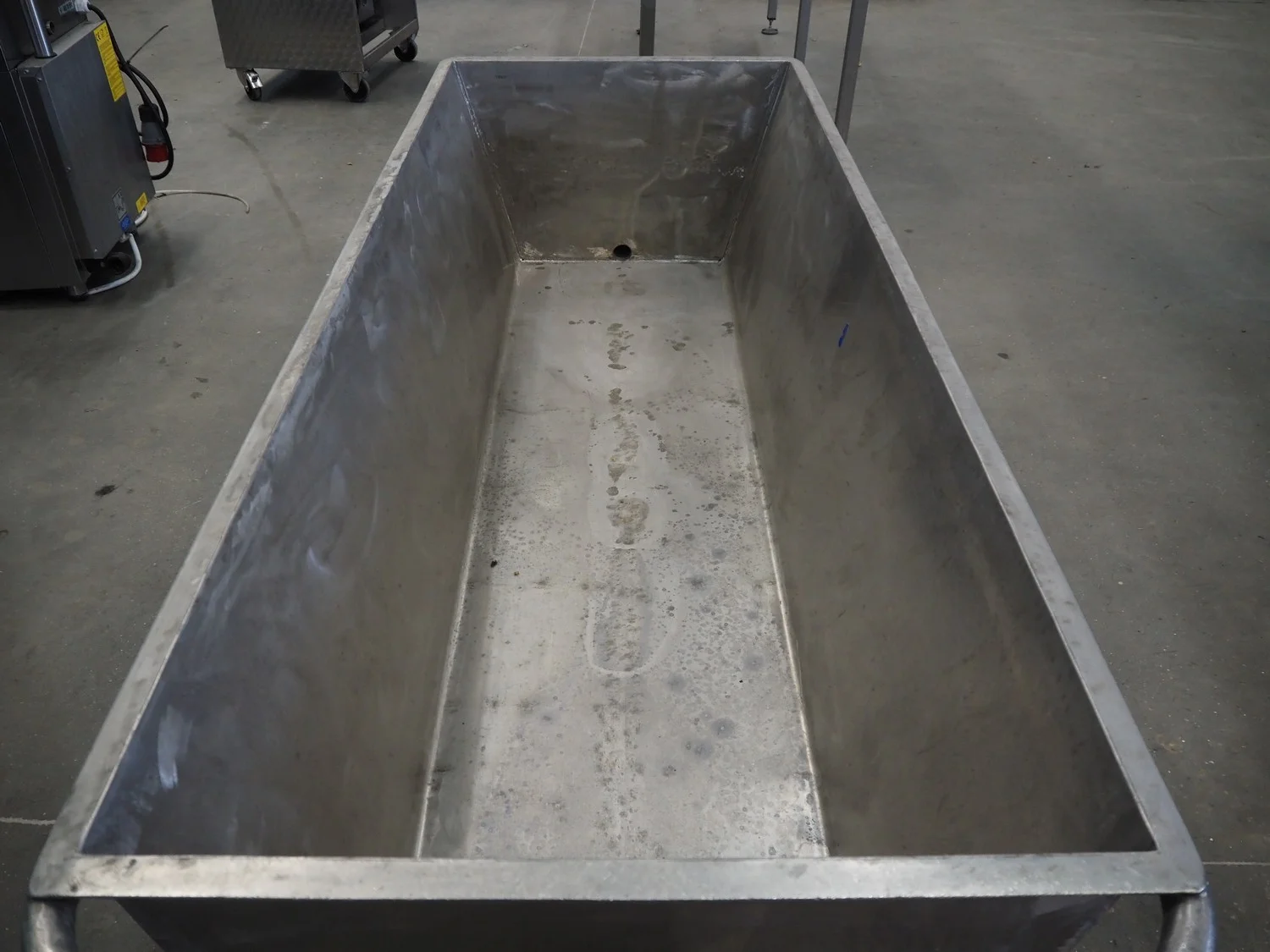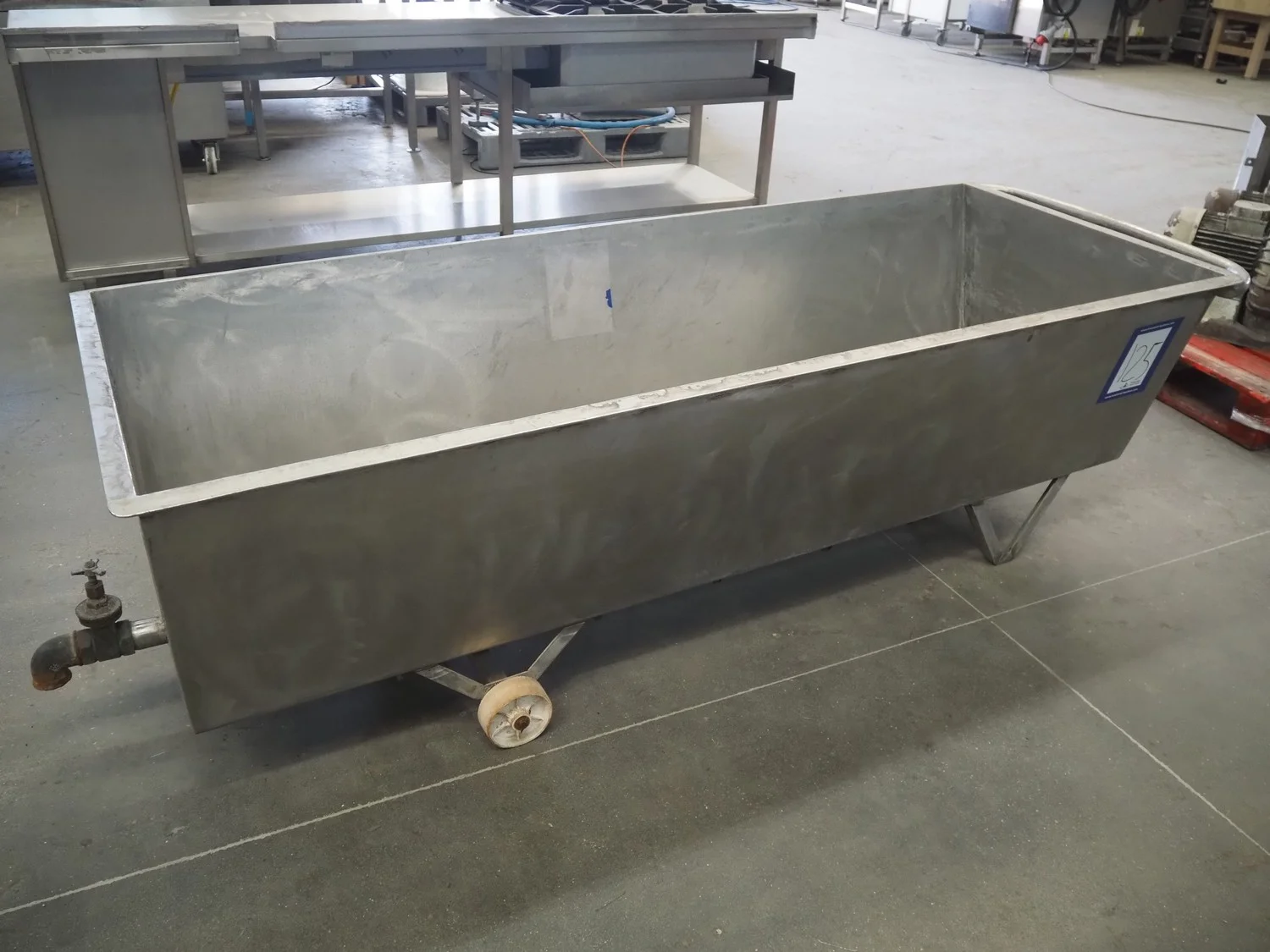Mobile s/s tub with drain, dimensions: 2160 mm x 810 mm x 700 mm.