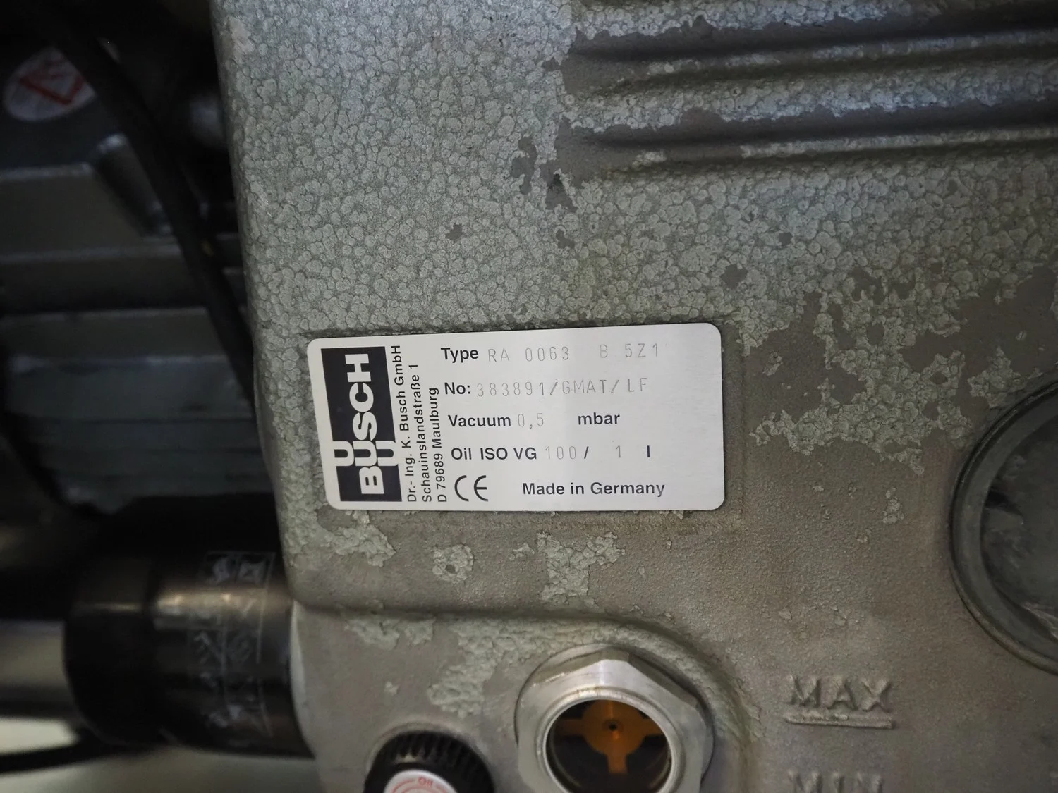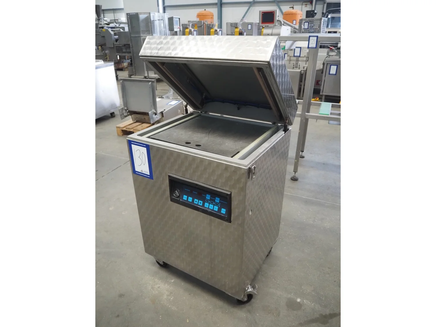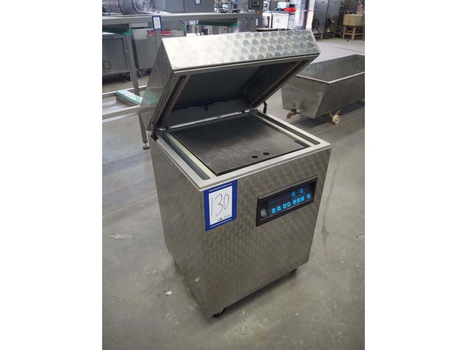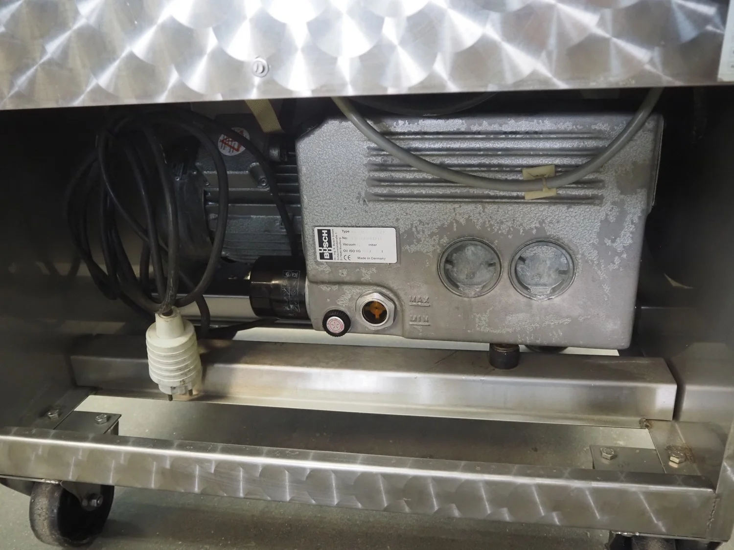 Henkovac mobile vacuum machine, seal length: (2x) 500 mm, dimensions chamber: 610 mm x 510 mm, built-in Busch vacuum pump, type: RA 0063, capacity: 63 m³ per hour, total dimensions: 680 mm x 600 mm x 1070 mm.