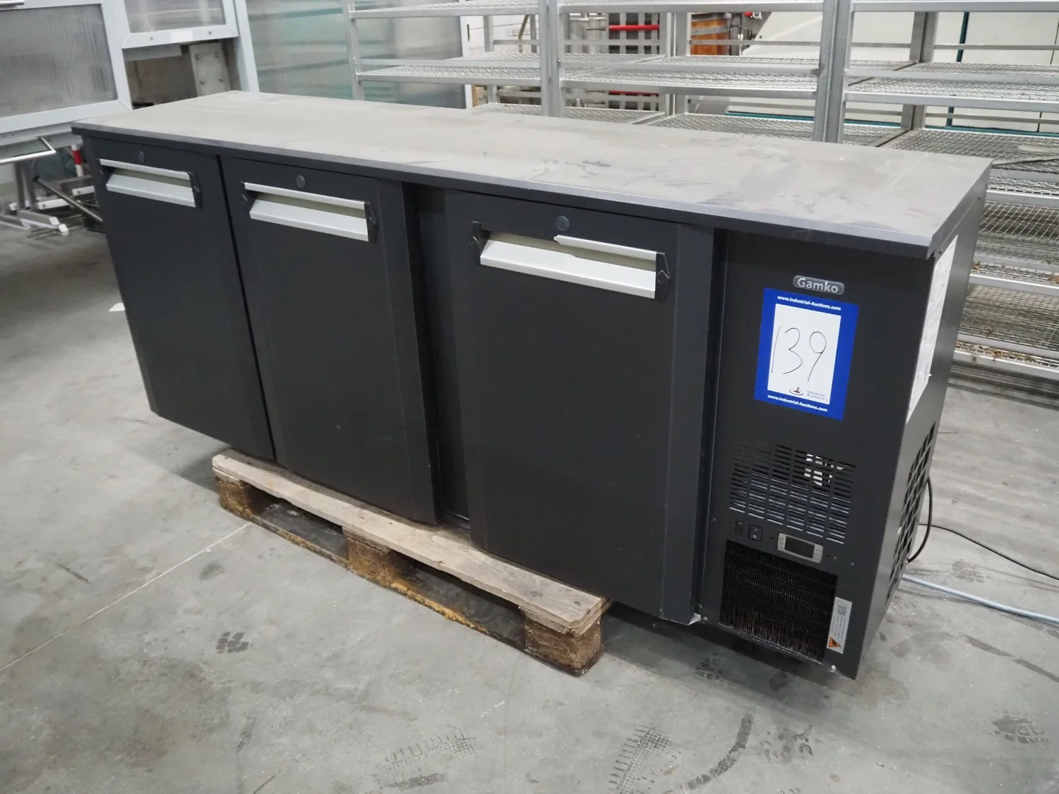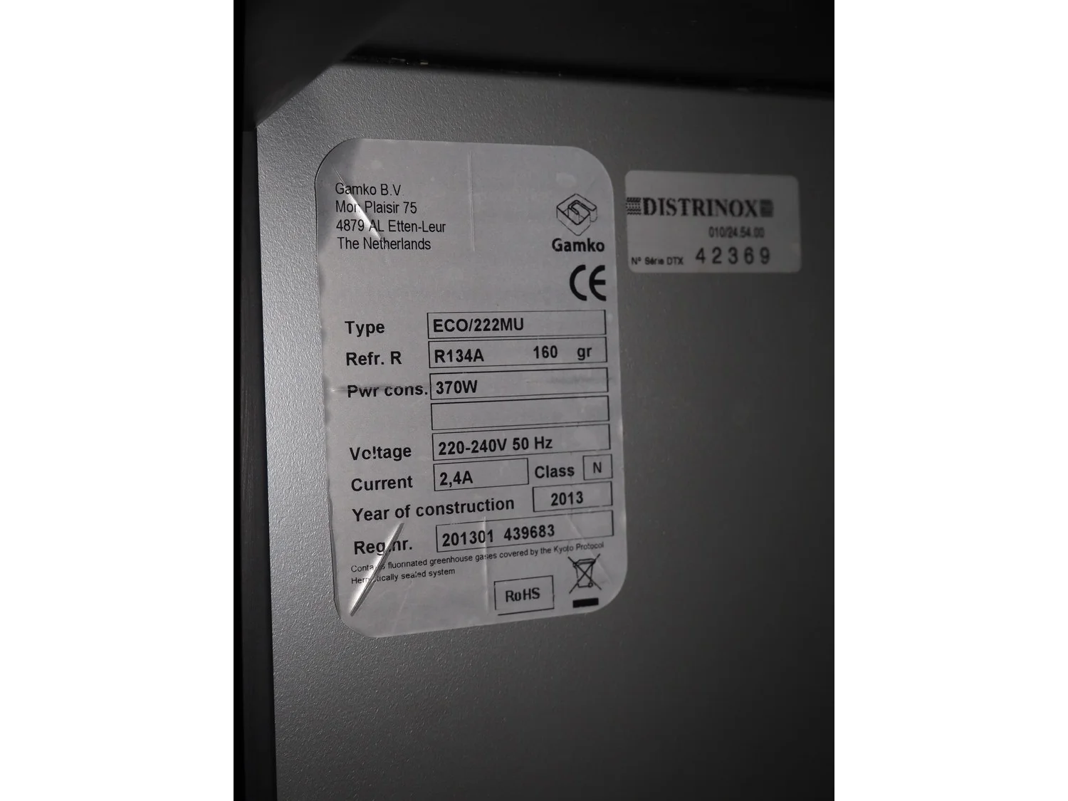 Gamko refrigerator, type: ECO/222MU, year of construction: 2013, 220-240 V, 50 Hz, 370 Watt, refrigerant: R134A, 160 gram, floor dimensions: 370 mm x 480 mm, total dimensions: 800 mm x 2000 mm x 1040 mm.