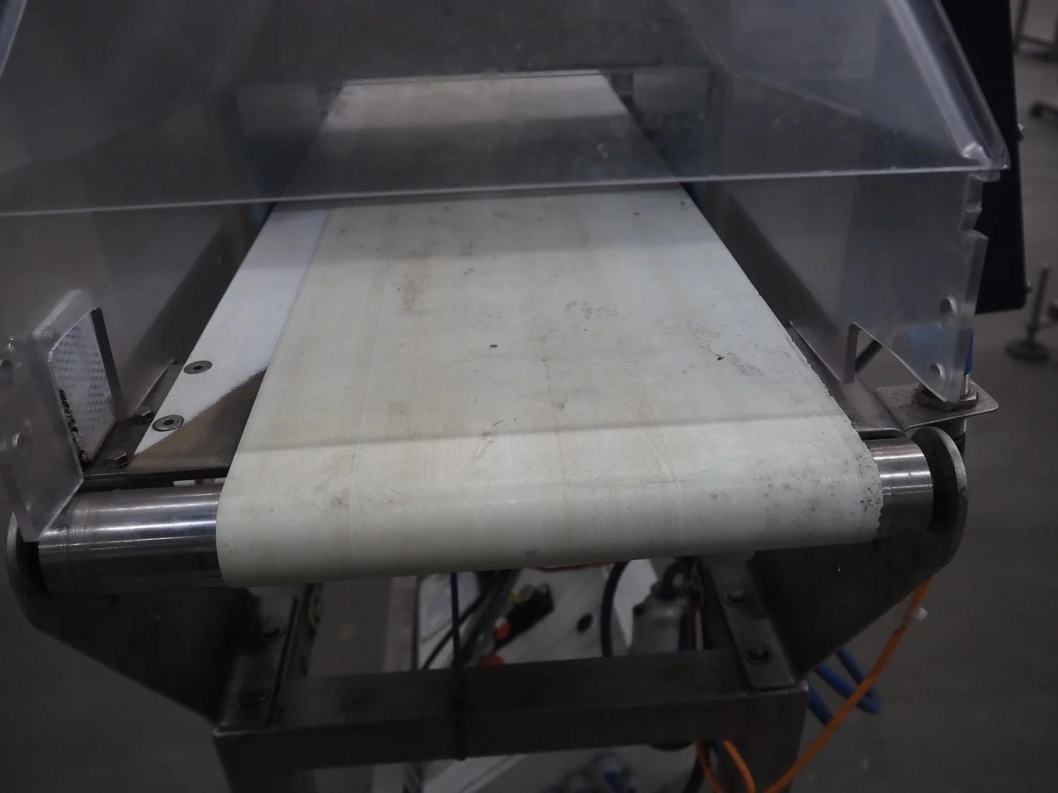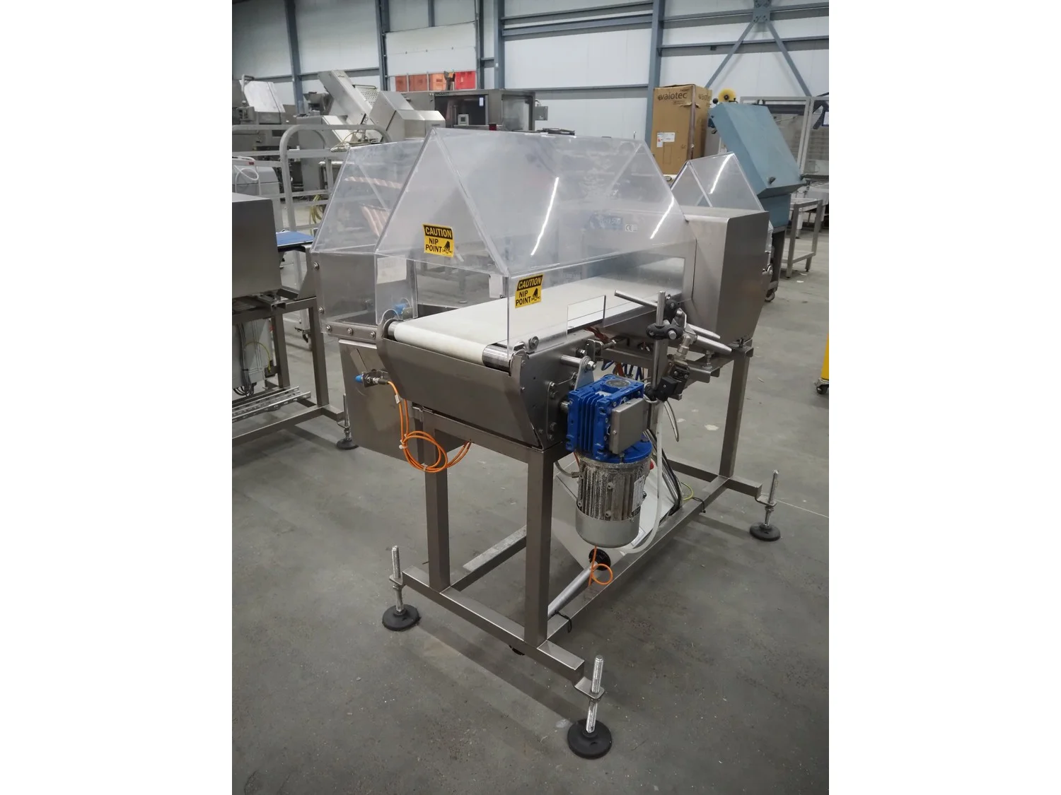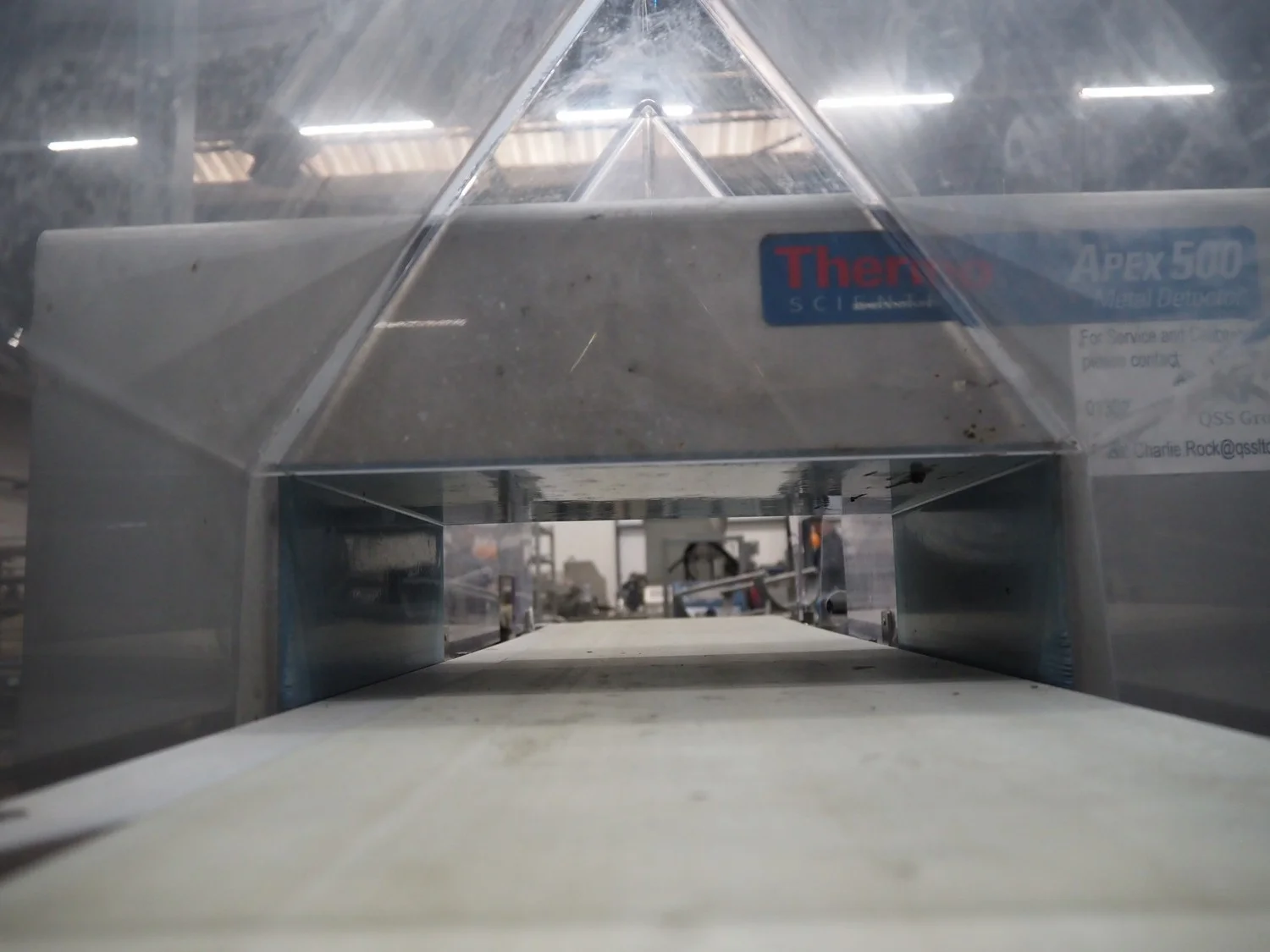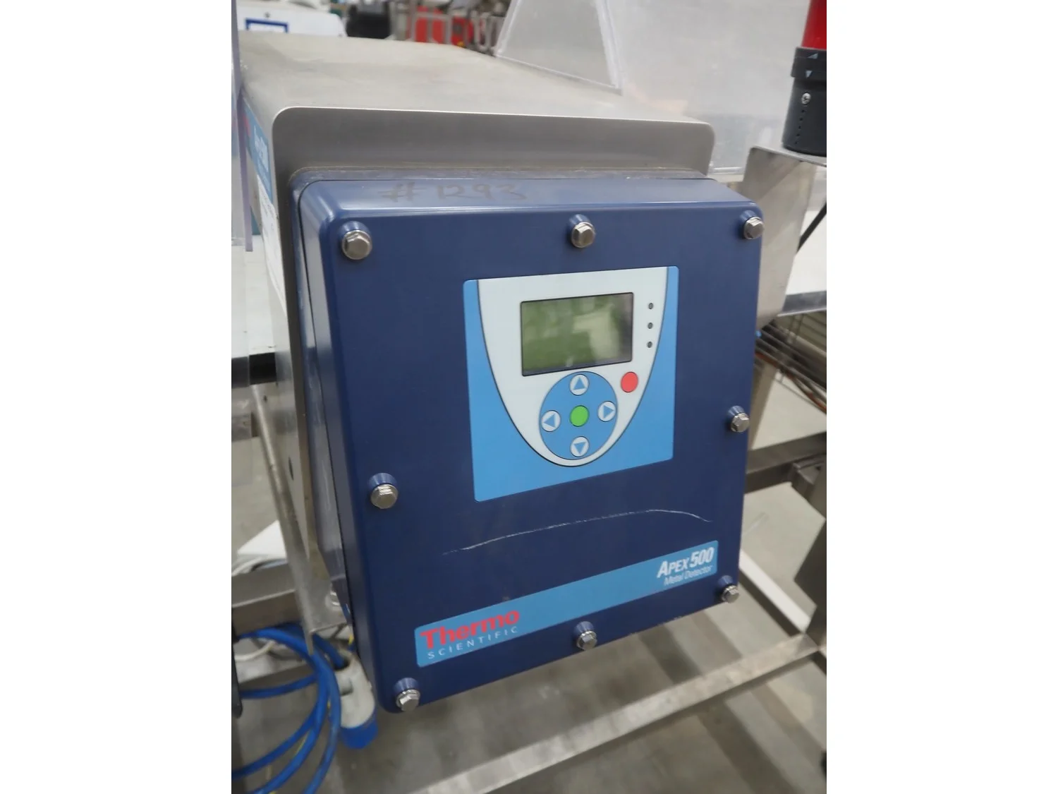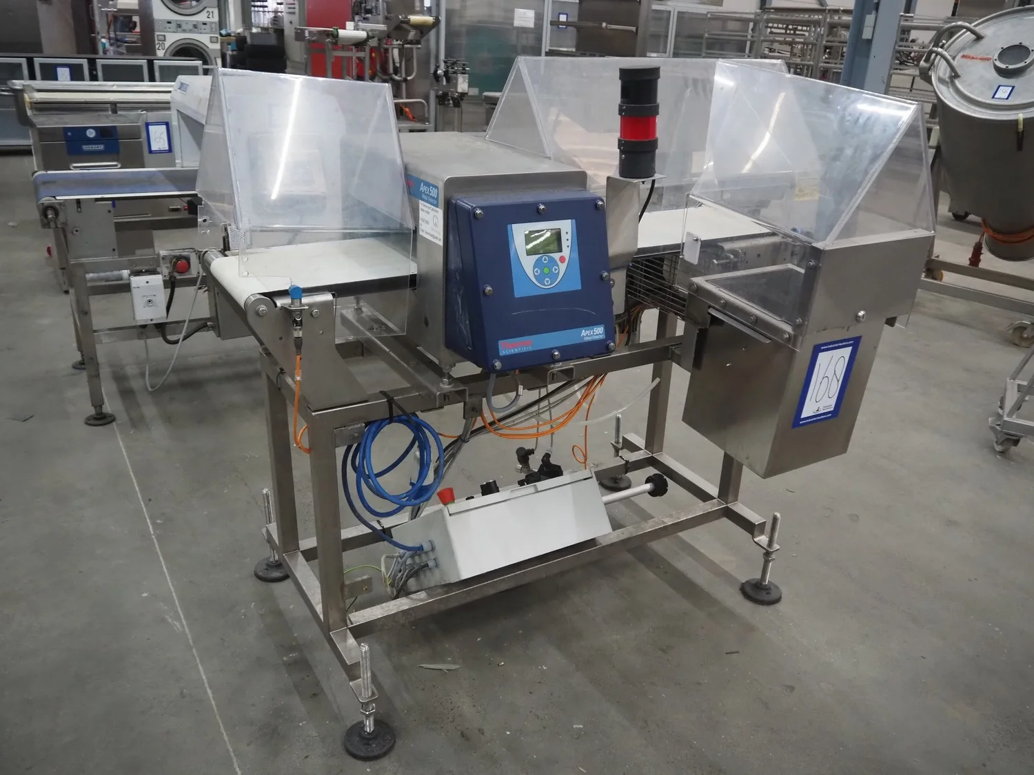 Thermo Fischer metal detector with rejector, model: Apex500, serial number: 9627, year of construction: 2012, 230 V, 50 Hz, plastic belt, belt width: 250 mm, clearance: 300 mm x 100 mm, total dimensions: 1400 mm x 1100 mm x 1350 mm.