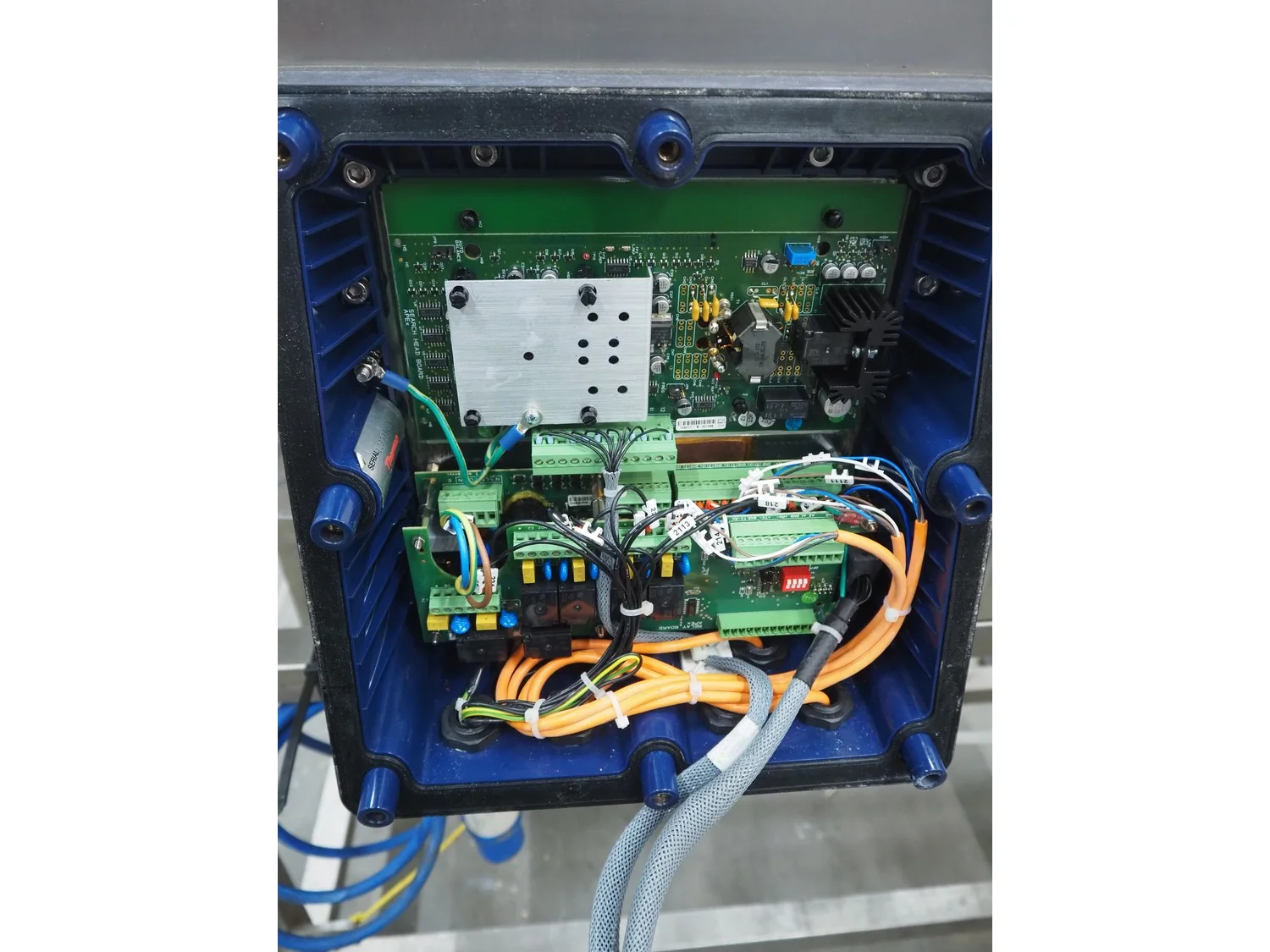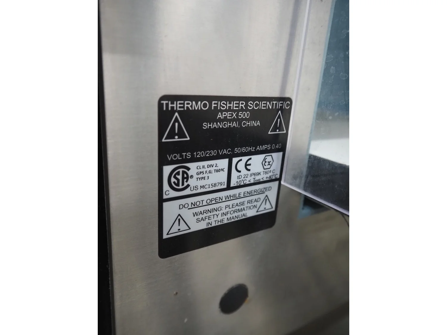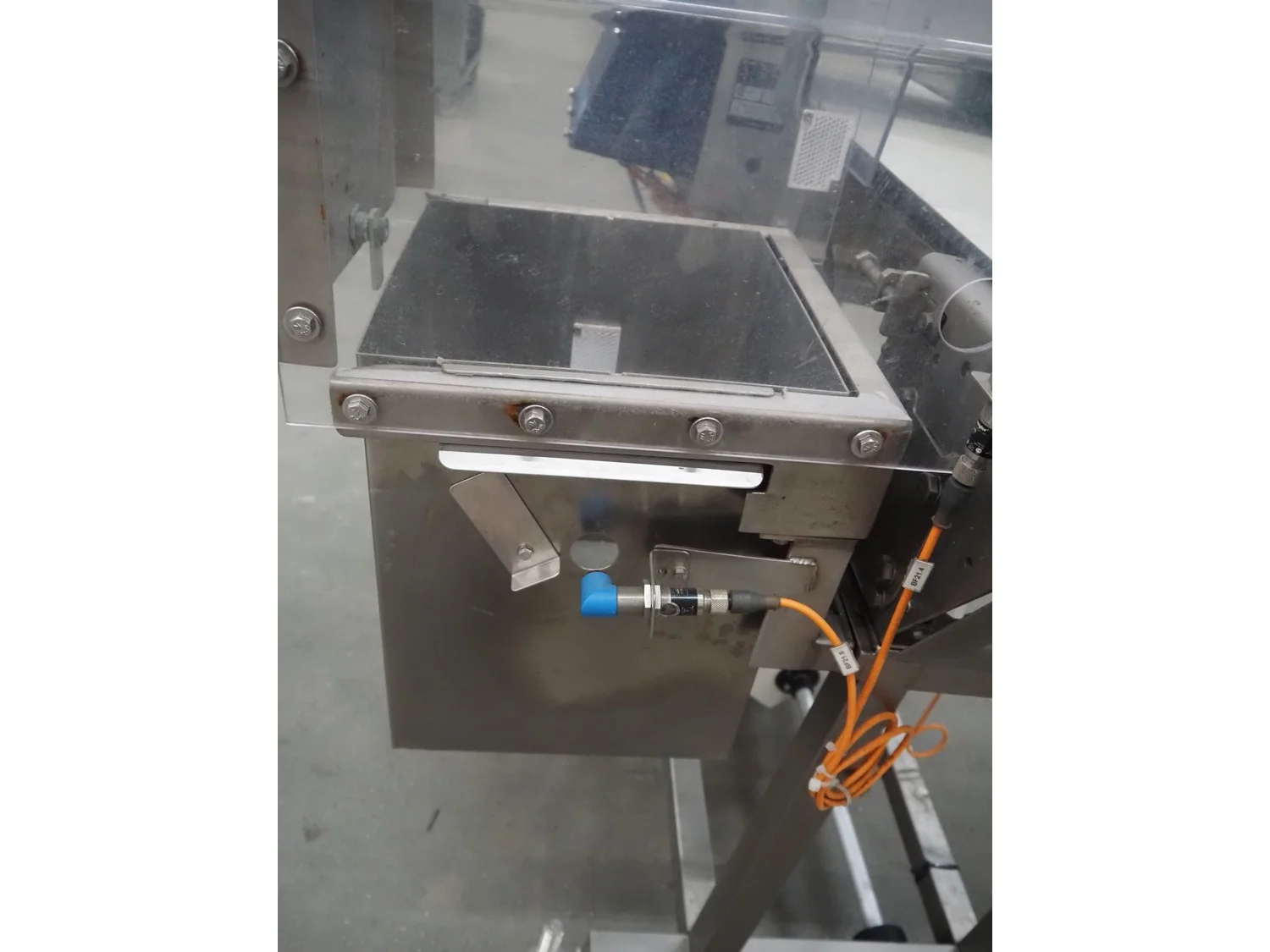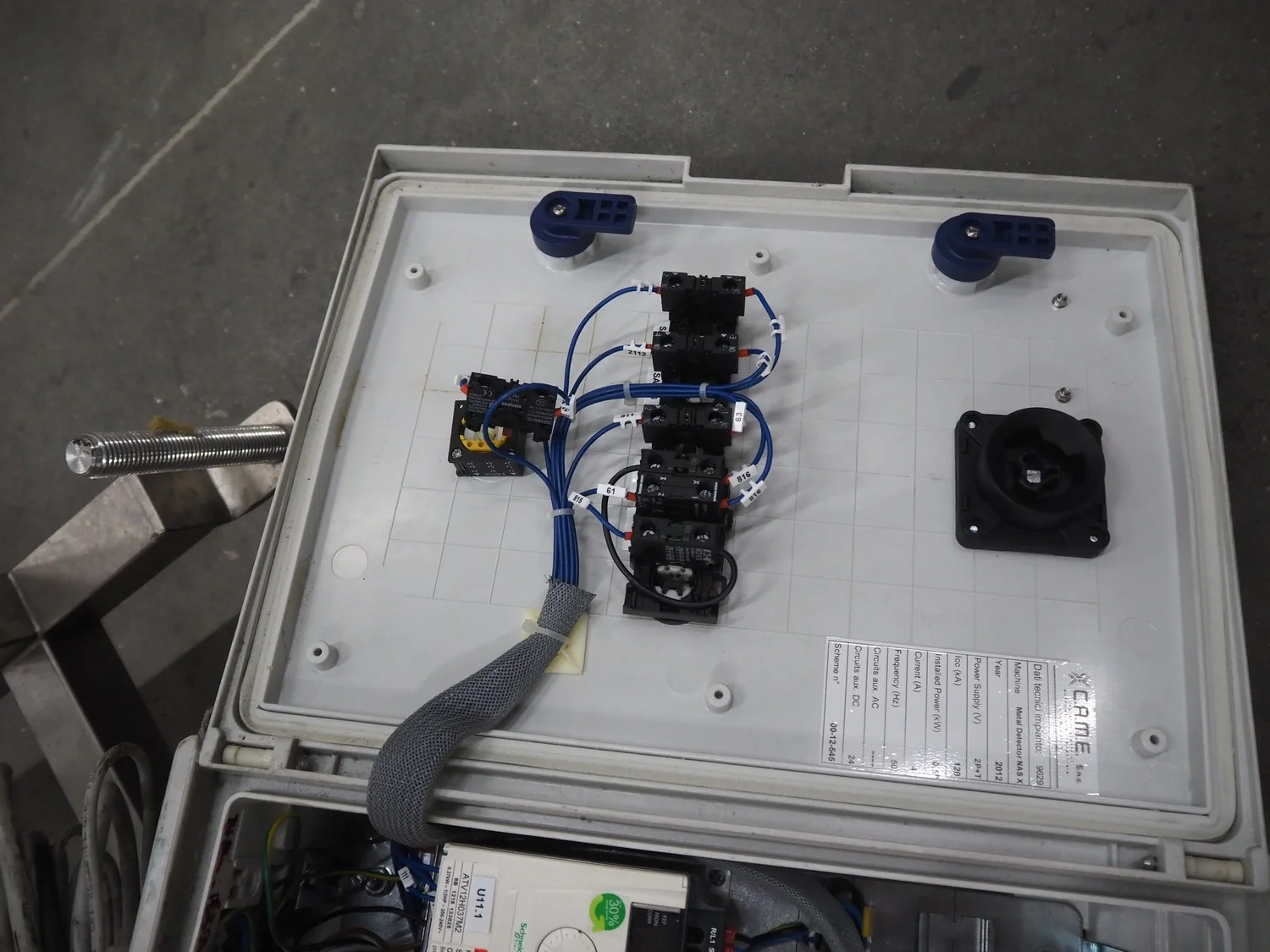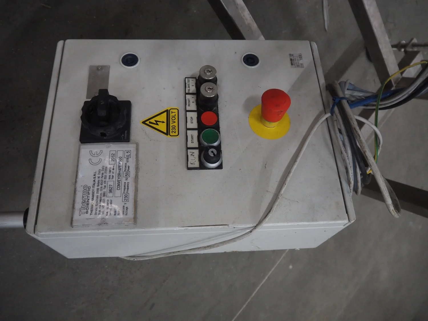 Thermo Fischer metal detector with rejector, model: Apex500, serial number: 9627, year of construction: 2012, 230 V, 50 Hz, plastic belt, belt width: 250 mm, clearance: 300 mm x 100 mm, total dimensions: 1400 mm x 1100 mm x 1350 mm.