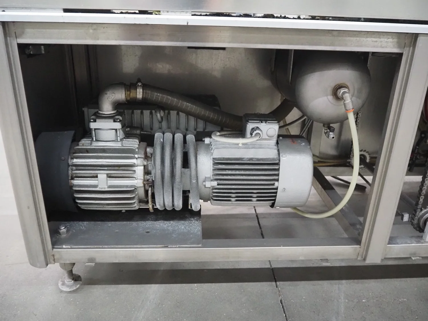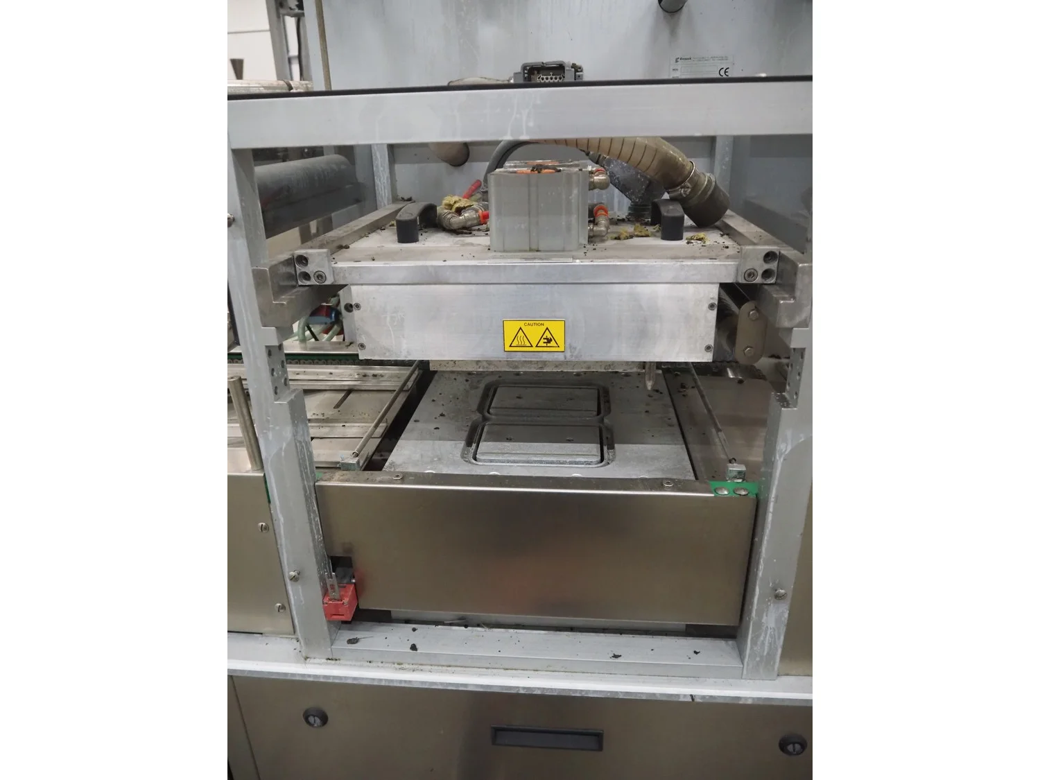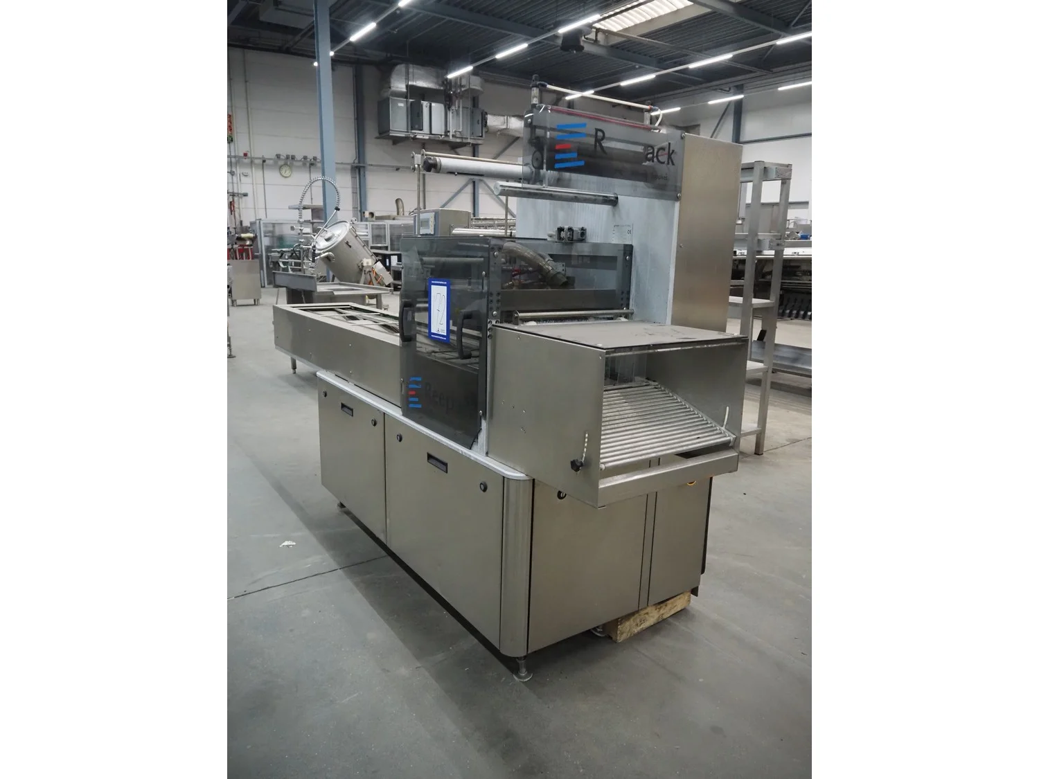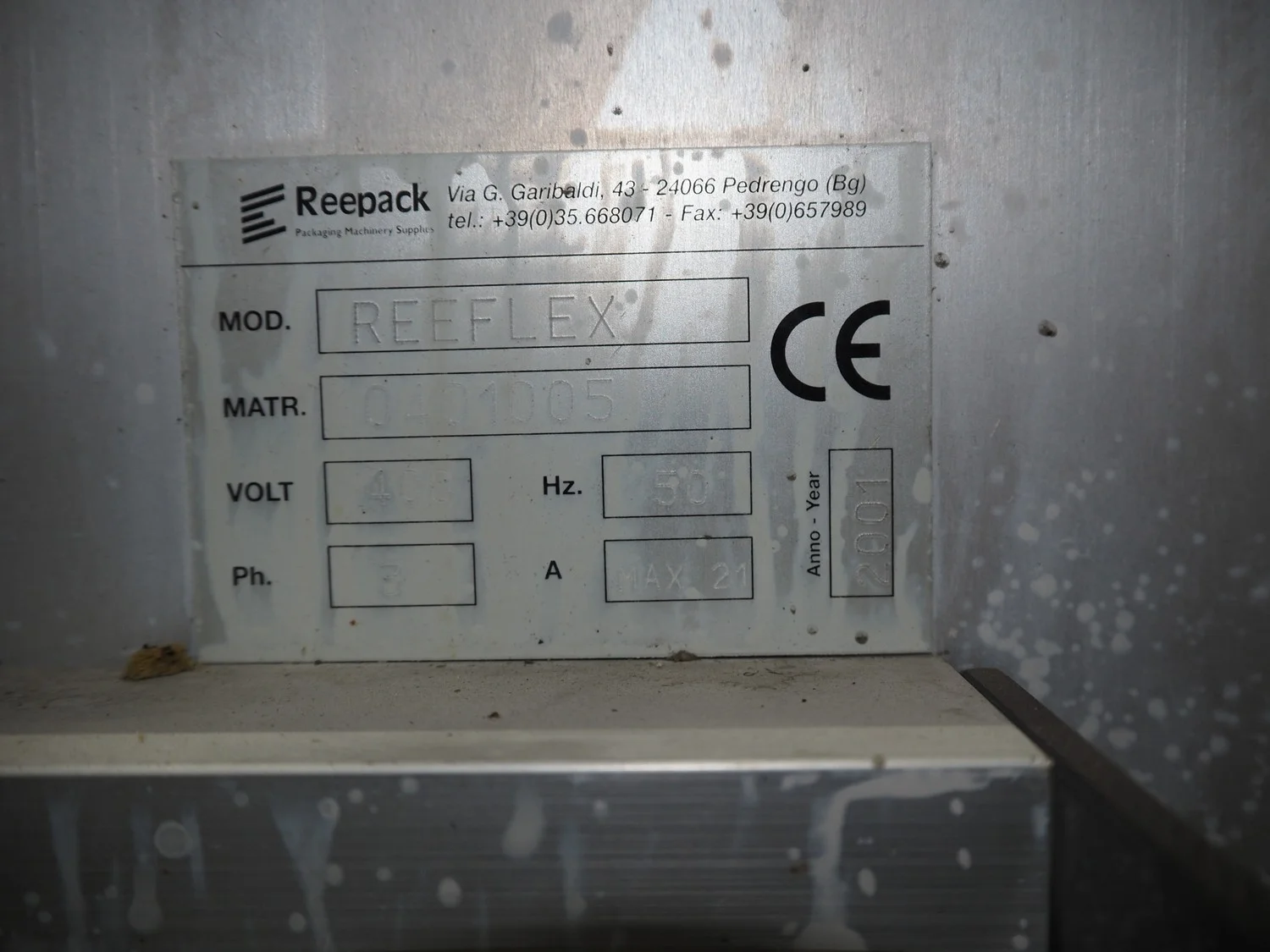 Reepack traysealer, model: REEFLEX, serial number: 0401005, year of construction: 2001, 400 V, 3 Ph, 50 Hz, max 21 A, Busch vacuum pump, type: RA 0100 E 501, capacity: 100 m³ per hour, dye: (2x) 200 mm x 135 mm, total dimensions: 2950 mm x 900 mm x 1750 mm. 1 leg broken.