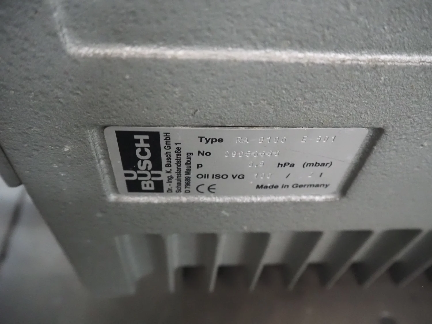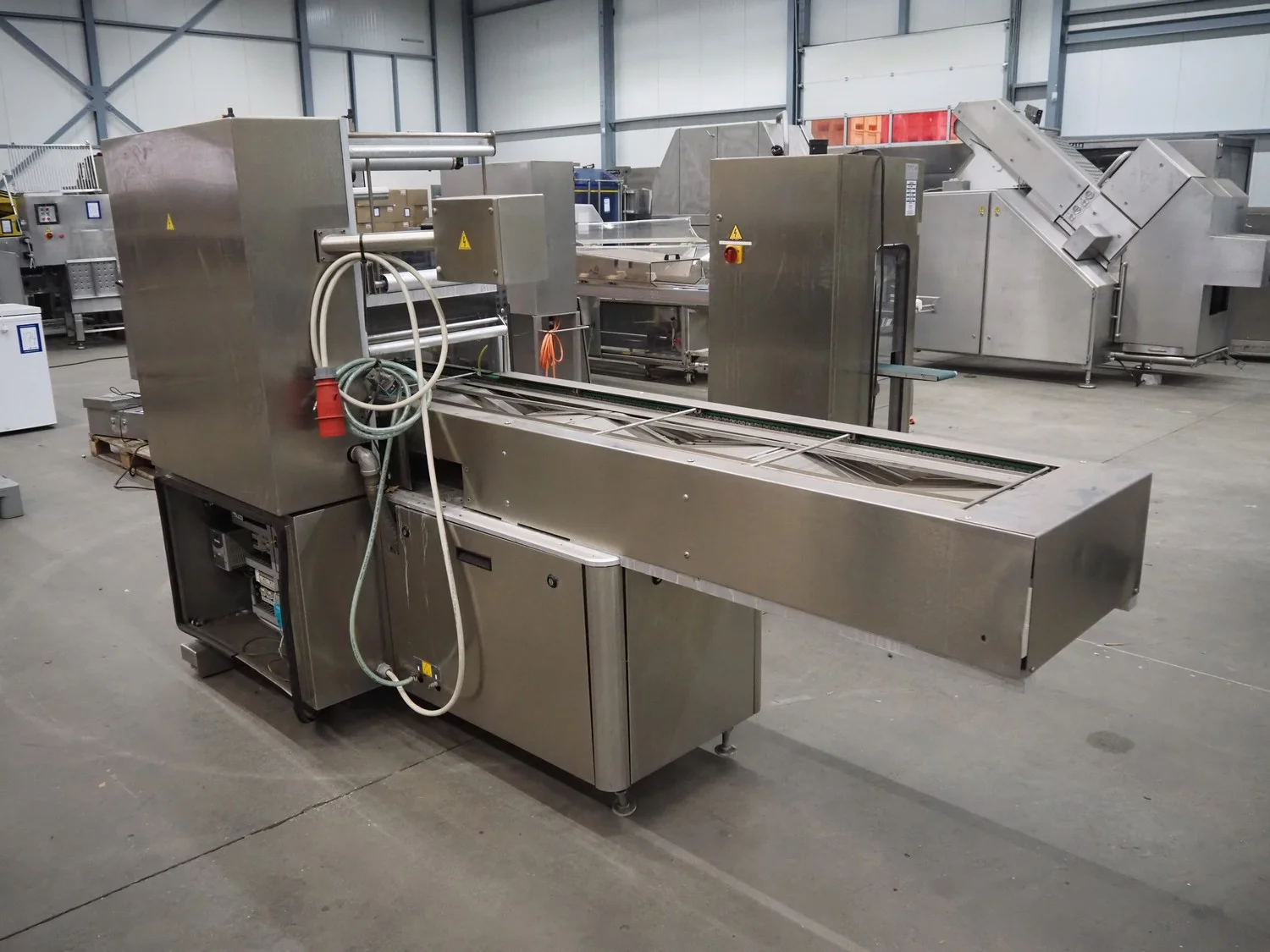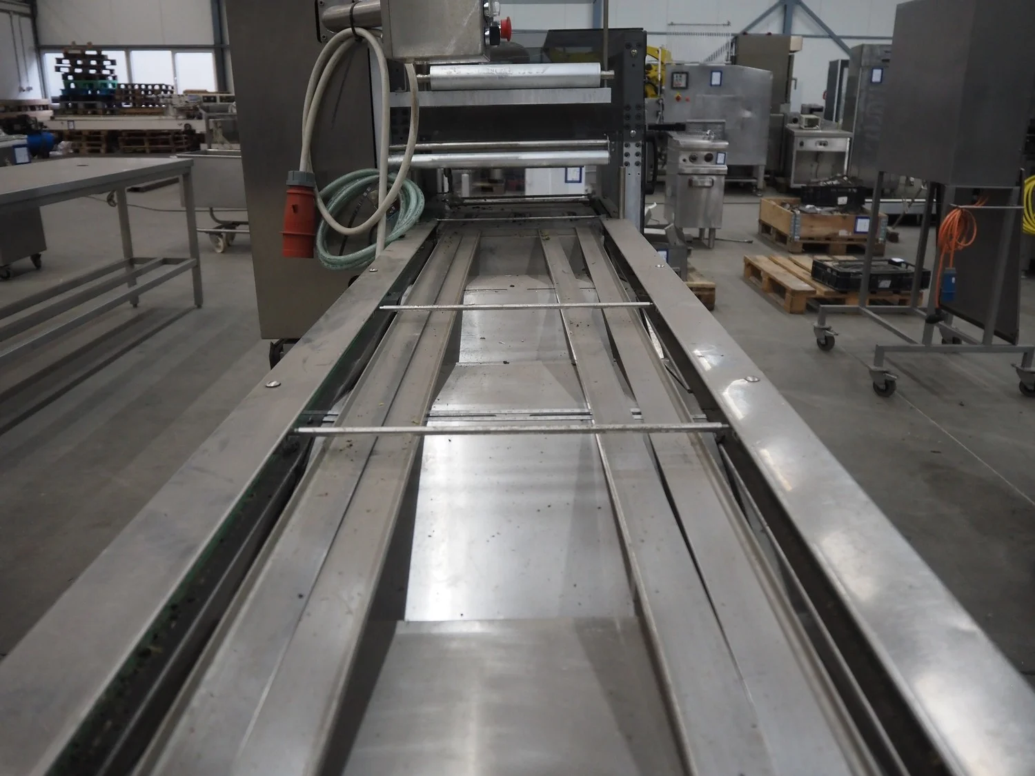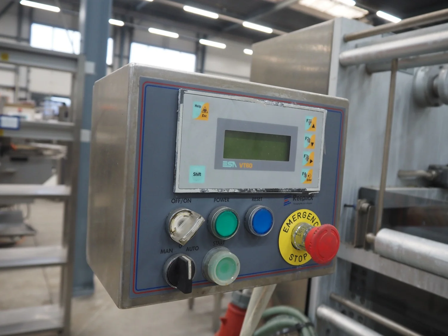 Reepack traysealer, model: REEFLEX, serial number: 0401005, year of construction: 2001, 400 V, 3 Ph, 50 Hz, max 21 A, Busch vacuum pump, type: RA 0100 E 501, capacity: 100 m³ per hour, dye: (2x) 200 mm x 135 mm, total dimensions: 2950 mm x 900 mm x 1750 mm. 1 leg broken.