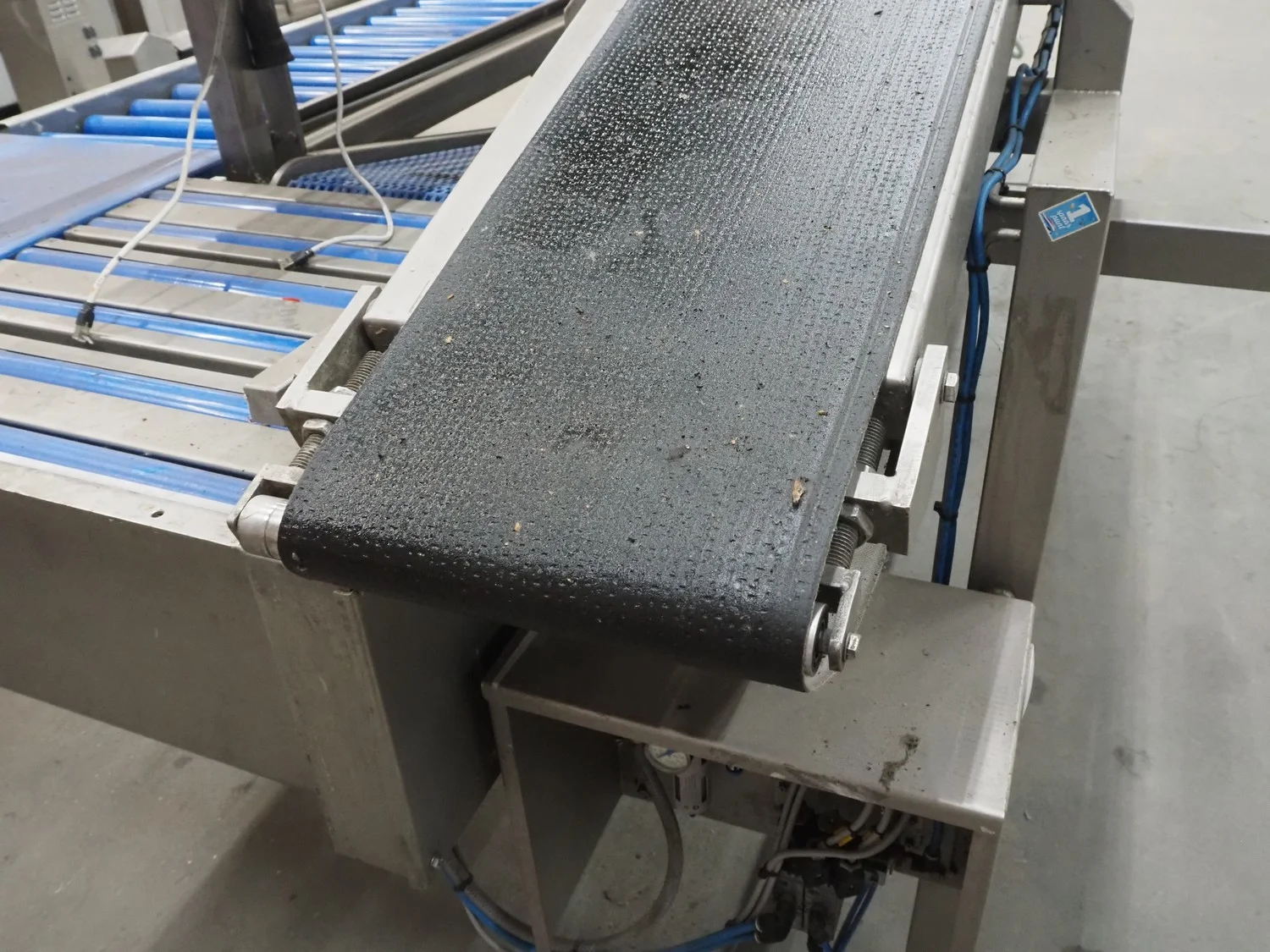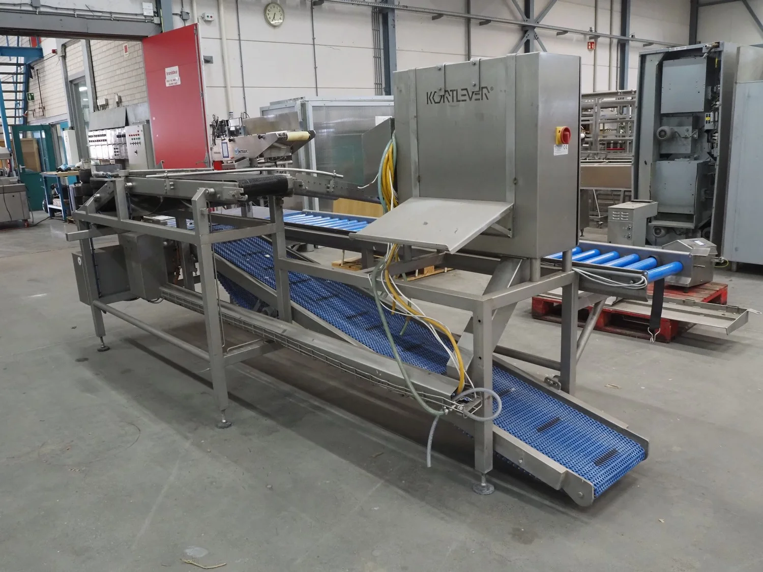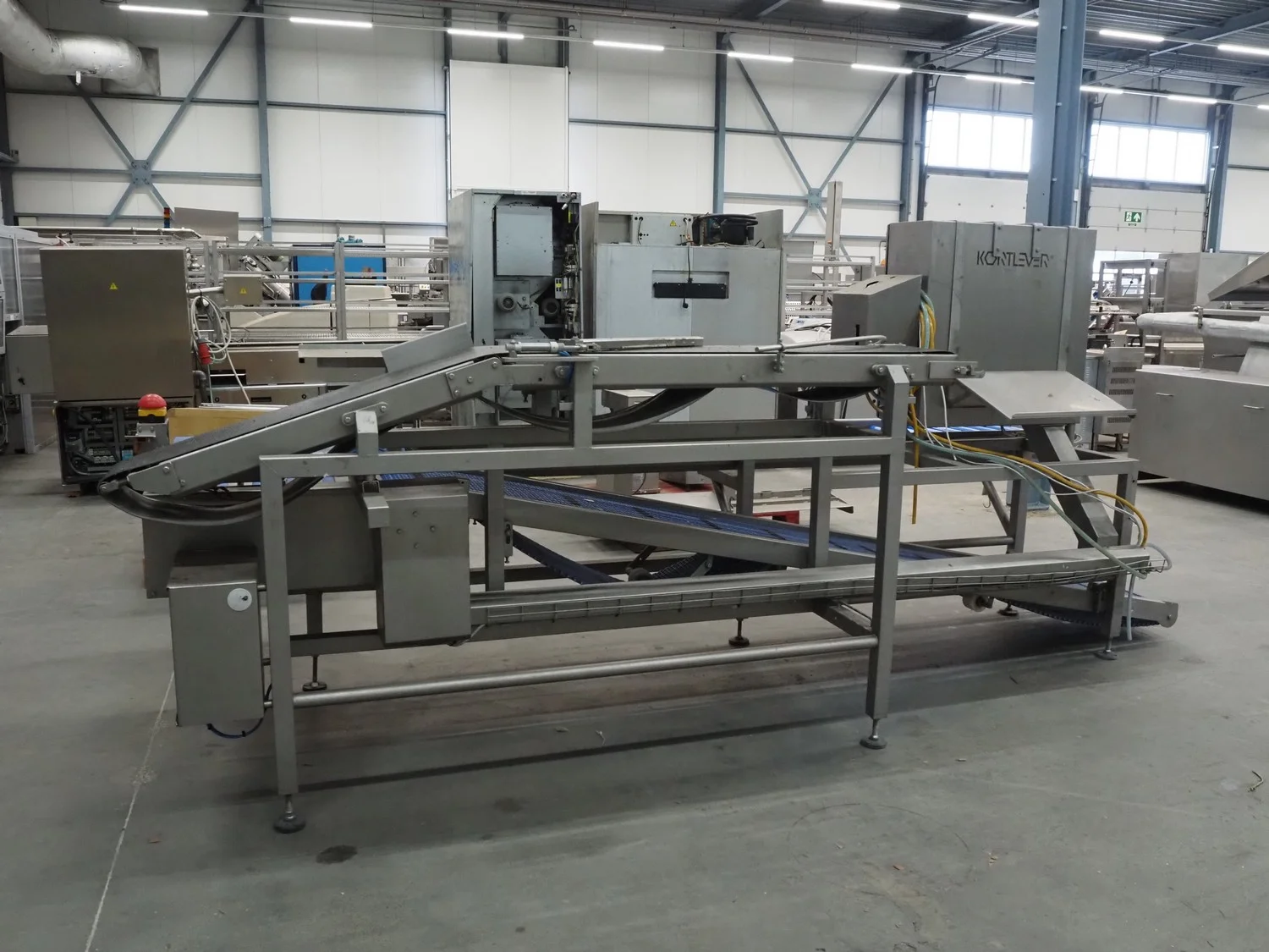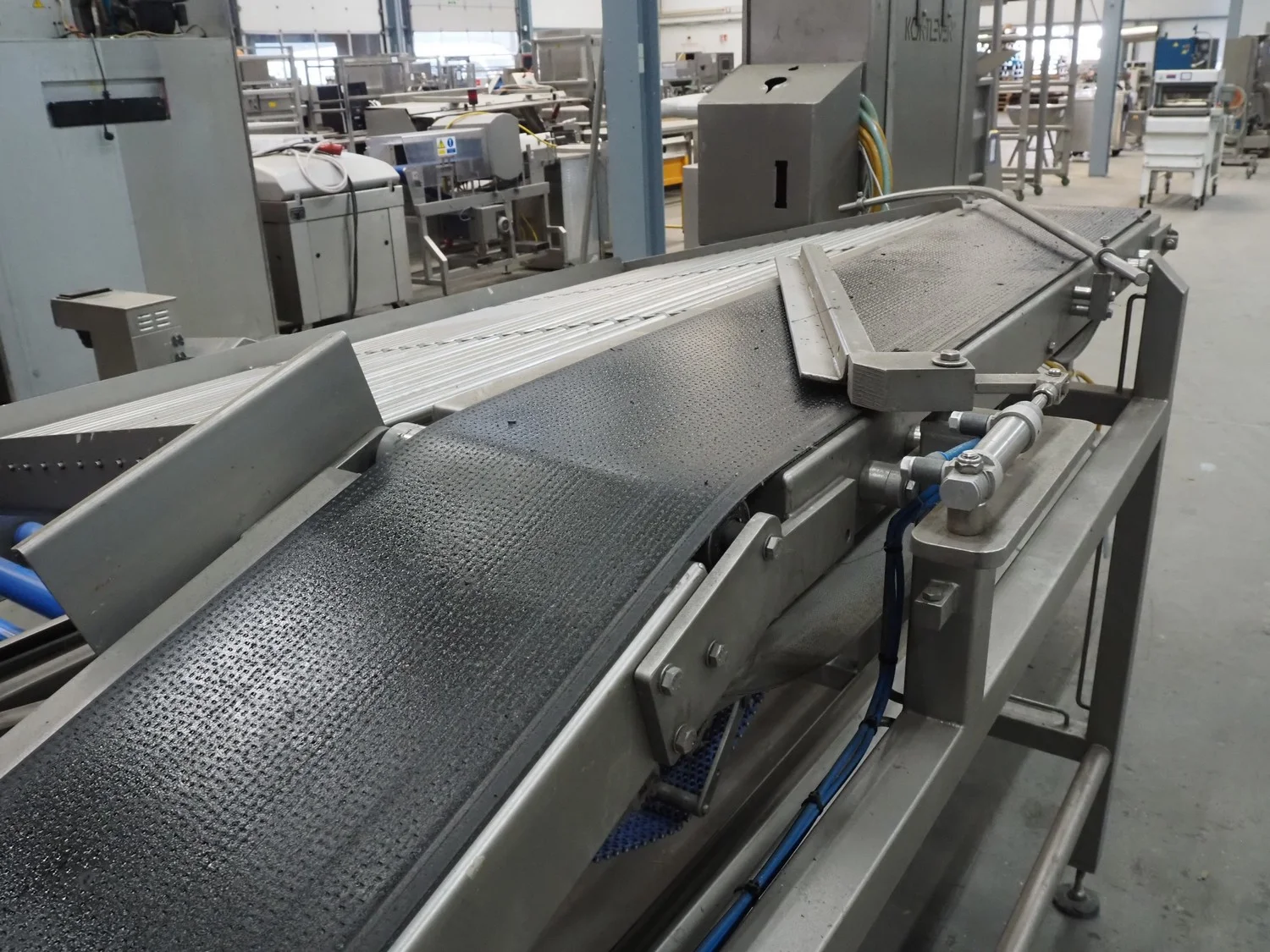 Kortlever transport belt, type: Eindelijns opstelling, machine number: 3110-4, year of construction: 2008, 400 V, 3 Ph, 50 Hz, plastic belt, belt width: 400 mm and 250 mm, plastic rollers, roller width: 430 mm, total dimensions: 3800 mm x 1650 mm x 1650 mm.