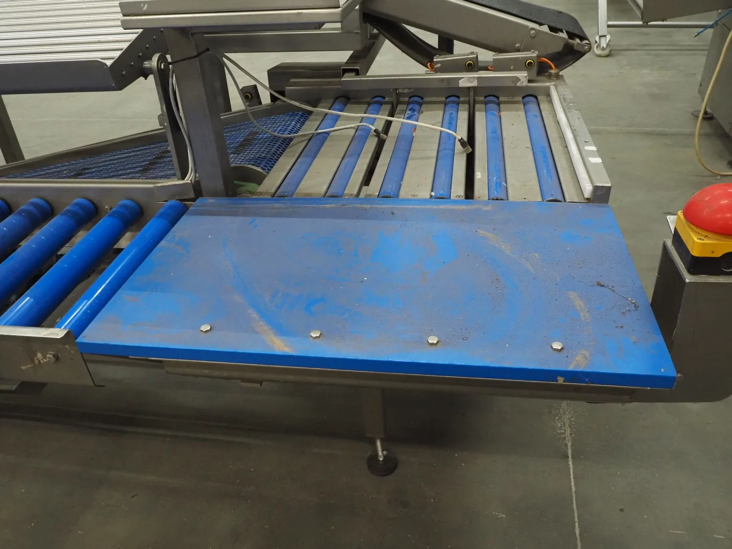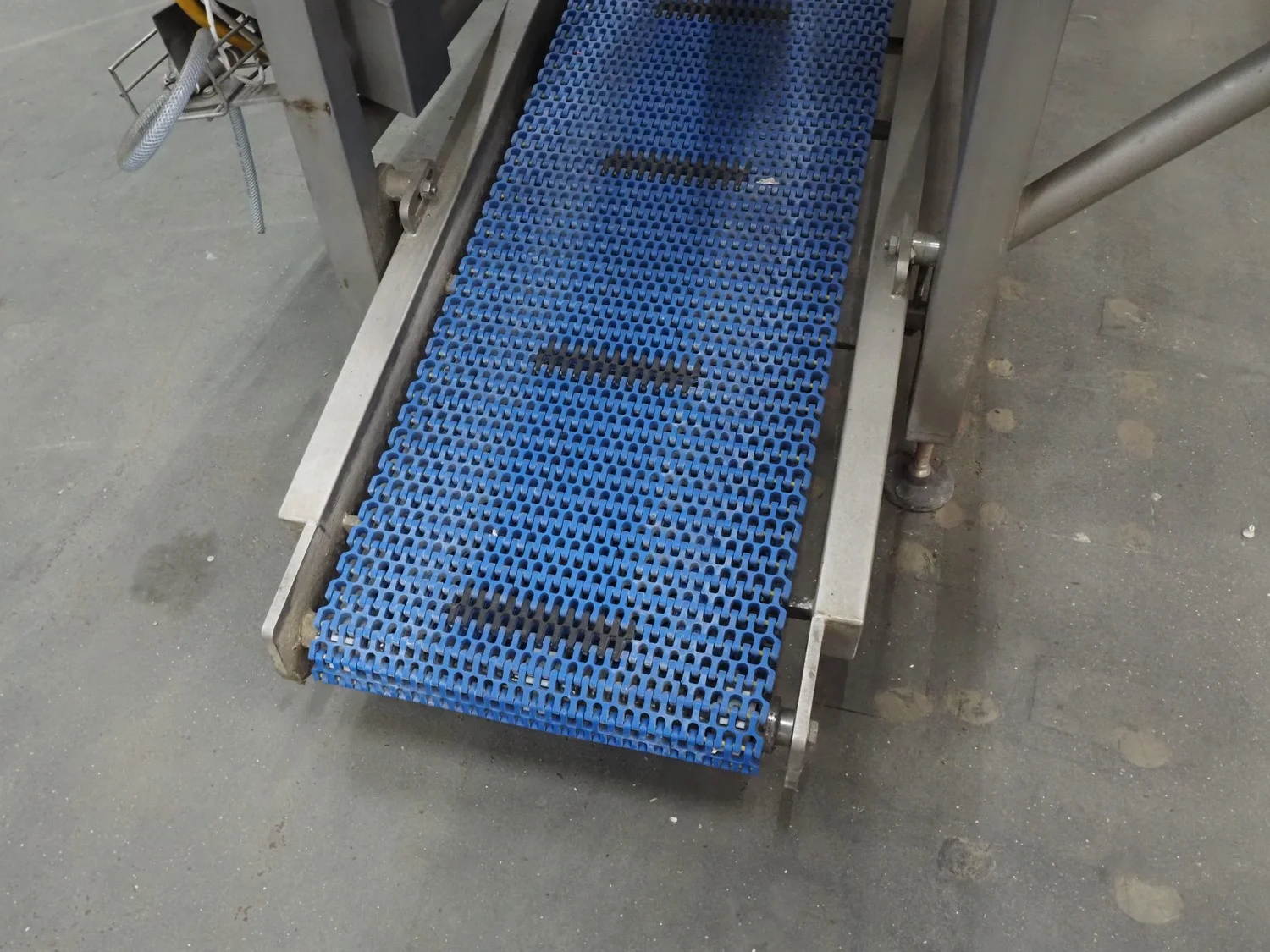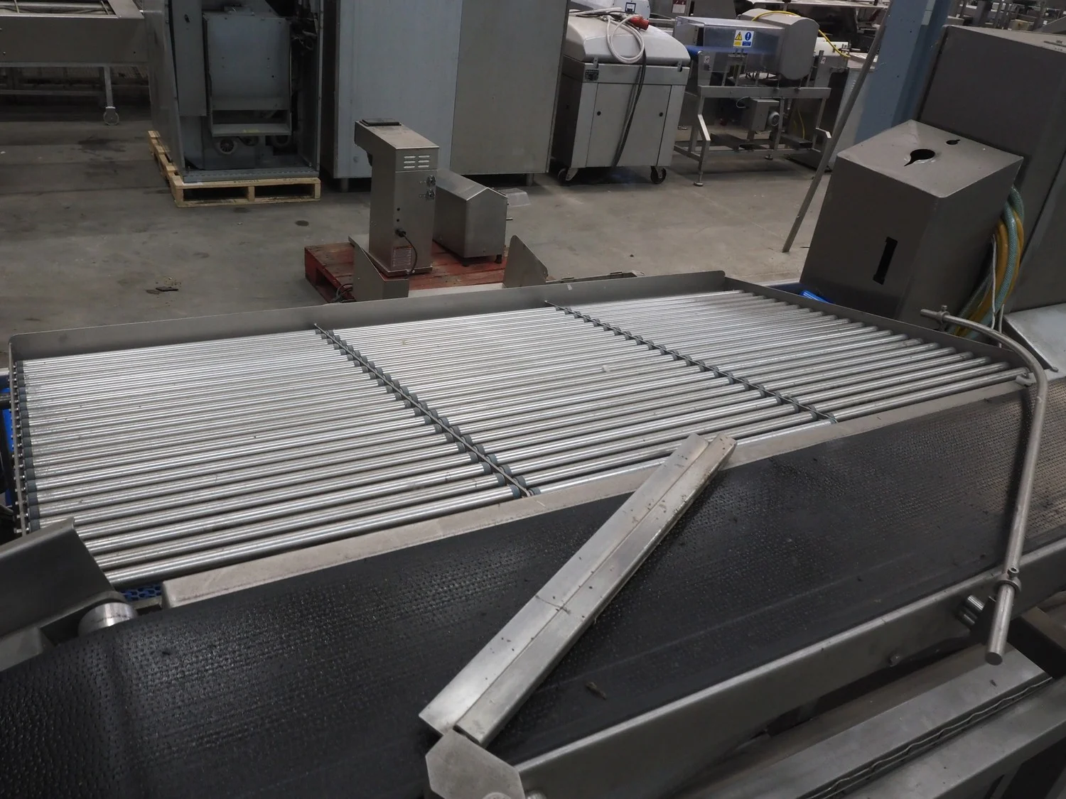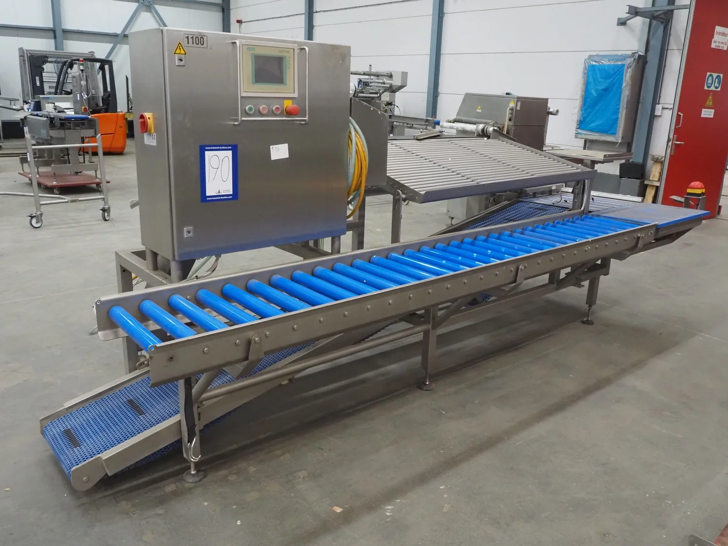 Kortlever transport belt, type: Eindelijns opstelling, machine number: 3110-4, year of construction: 2008, 400 V, 3 Ph, 50 Hz, plastic belt, belt width: 400 mm and 250 mm, plastic rollers, roller width: 430 mm, total dimensions: 3800 mm x 1650 mm x 1650 mm.