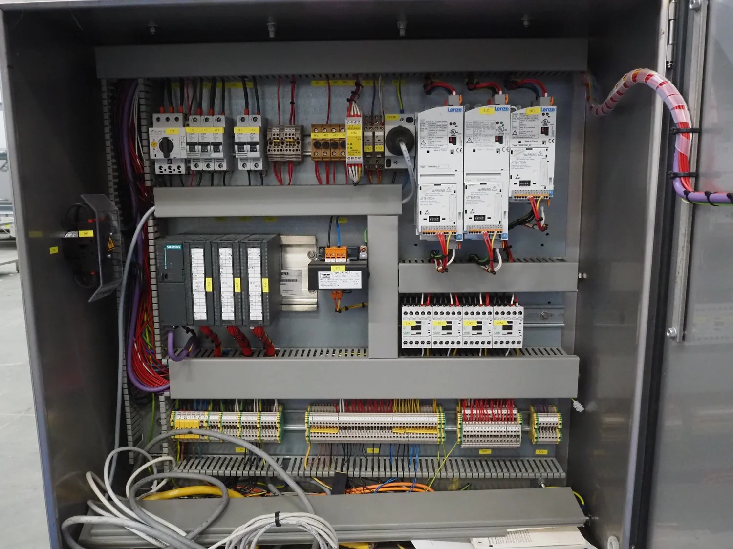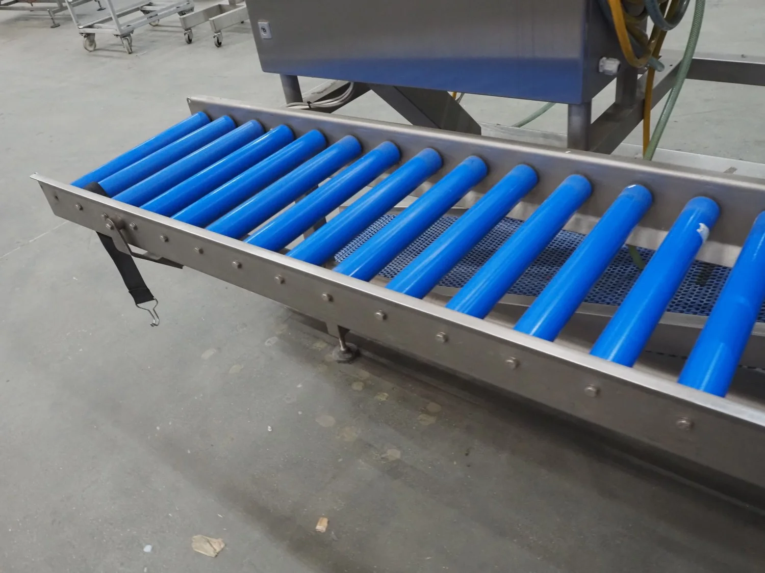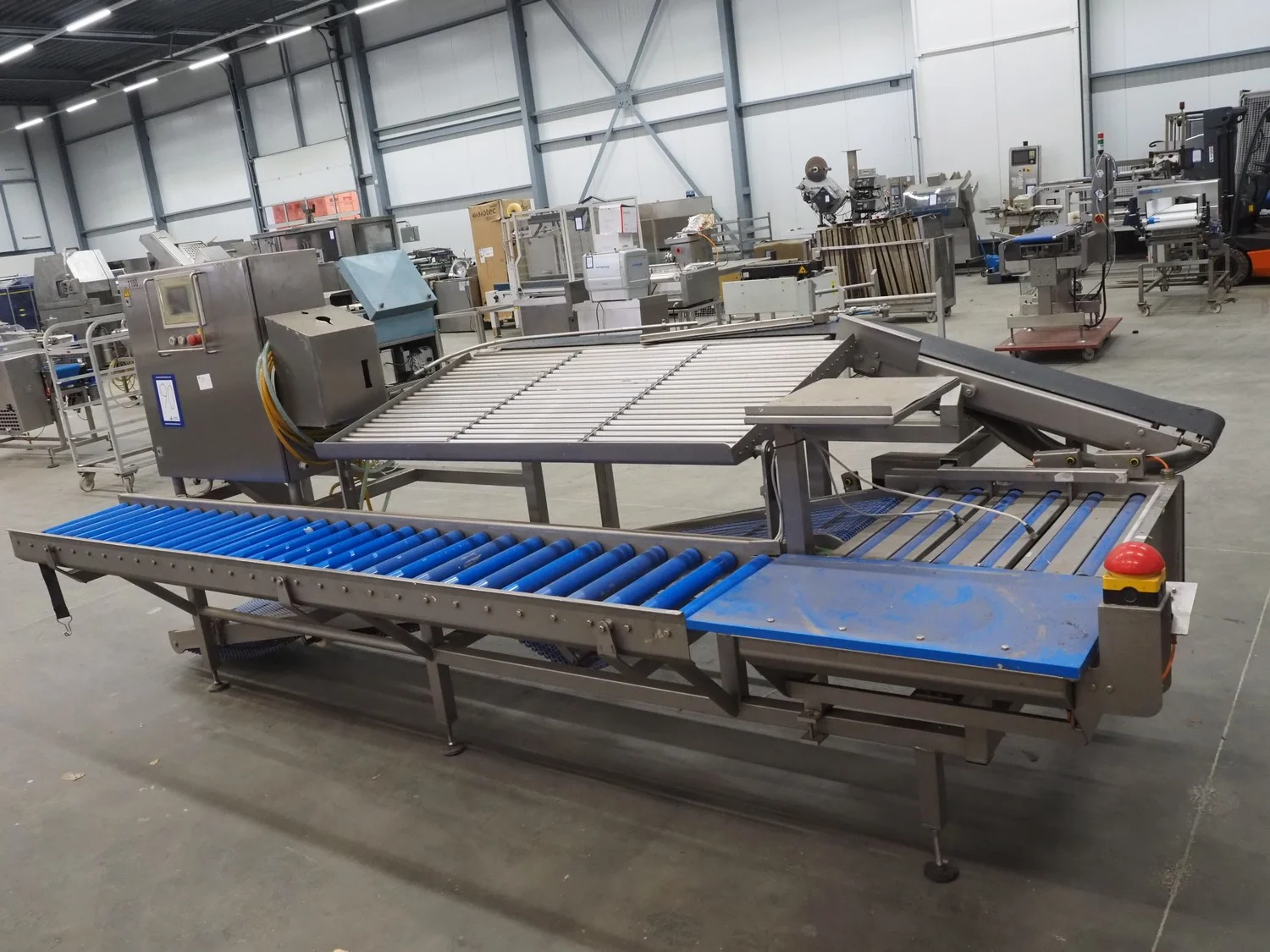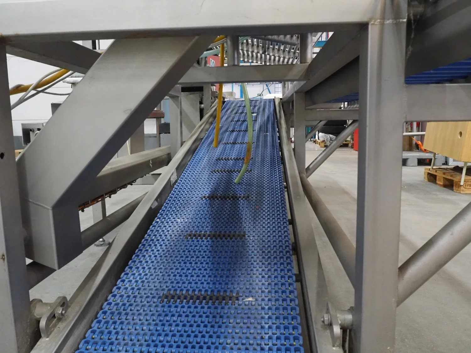 Kortlever transport belt, type: Eindelijns opstelling, machine number: 3110-4, year of construction: 2008, 400 V, 3 Ph, 50 Hz, plastic belt, belt width: 400 mm and 250 mm, plastic rollers, roller width: 430 mm, total dimensions: 3800 mm x 1650 mm x 1650 mm.
