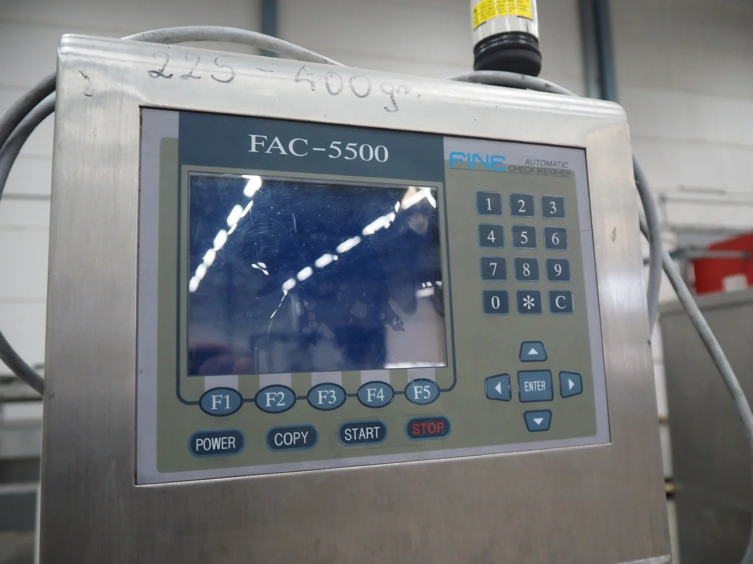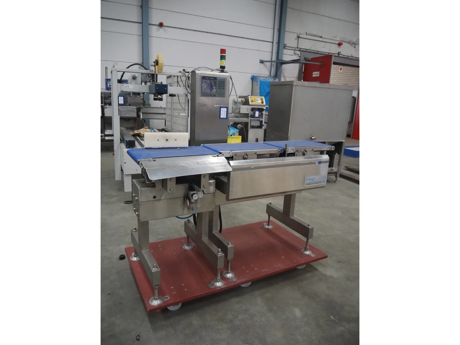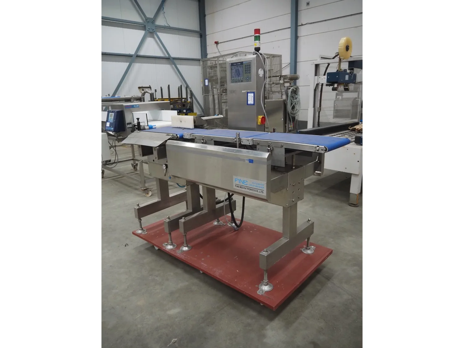 Fine Interkorea checkweigher with rejecter, model: FAC-5500 W335 535, serial number: E065031, year of construction: 2006/06, weight range: 1-500 gram, plastic belt, belt width: 300 mm, total dimensions: 1670 mm x 900 mm x 1630 mm.