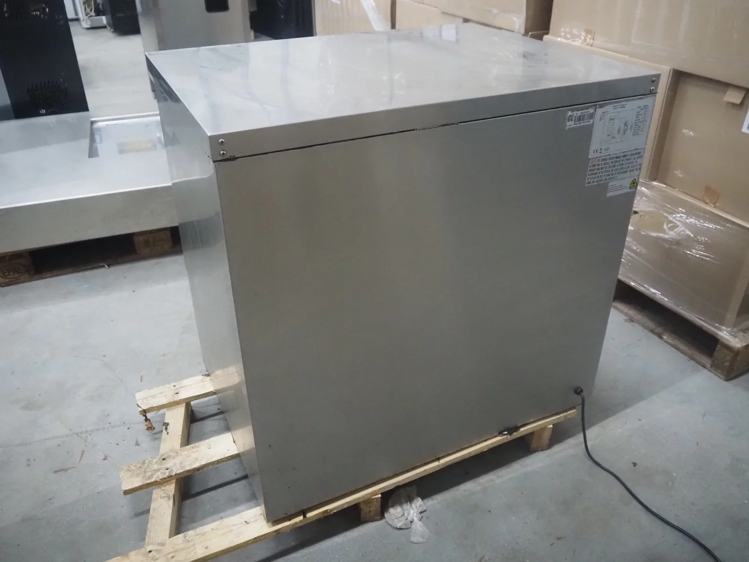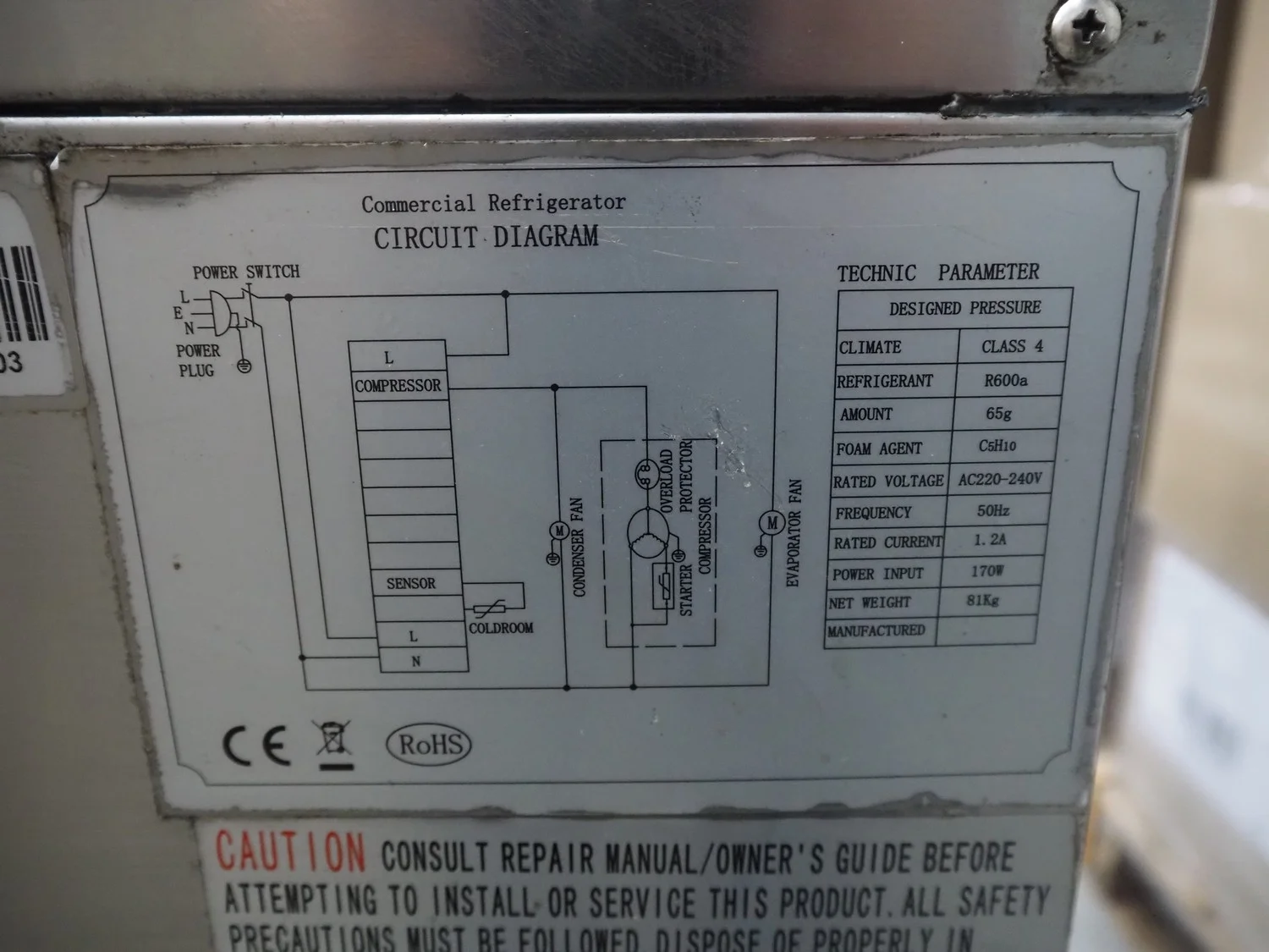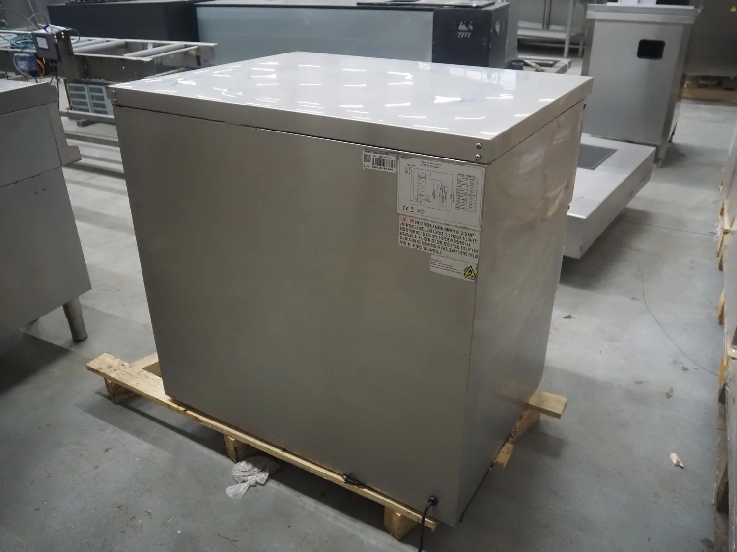 S/s refrigerated cabinet, 220-240 V, 50 Hz, 1.2 A, 170 W, weight: 81 kg, refrigerant: R600a, dimensions: 900 mm x 700 mm x 880 mm.