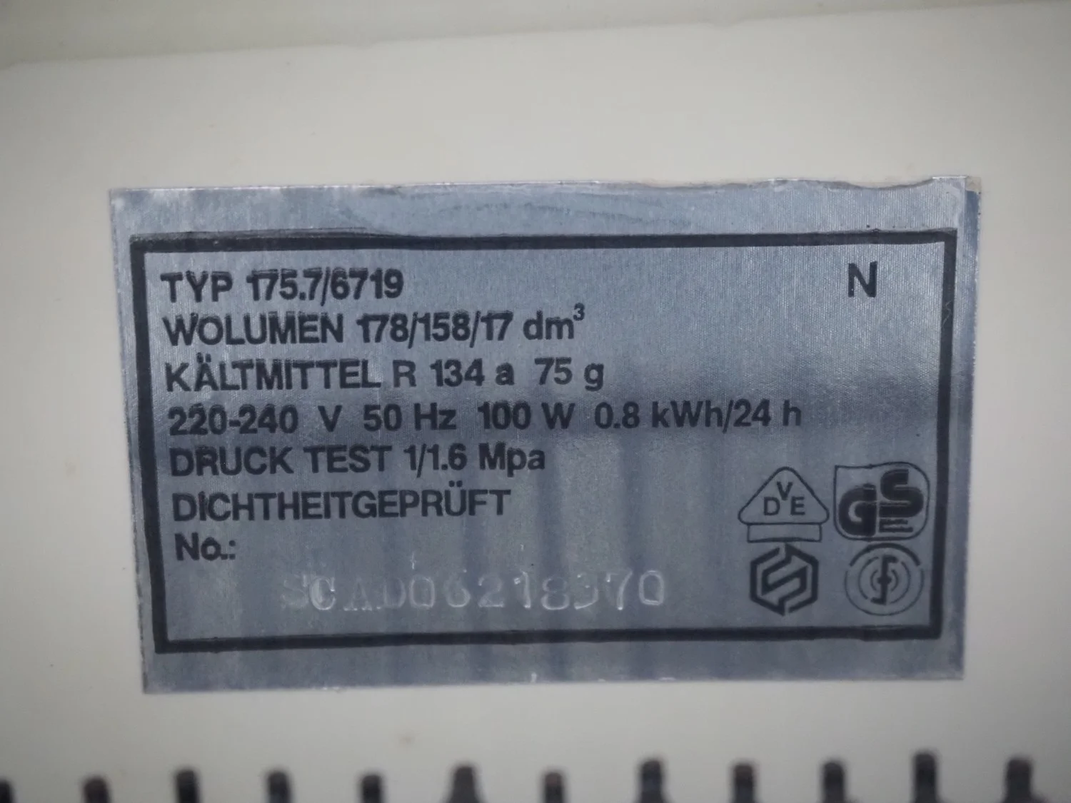 Frilec refrigerator, type: 175.6719, volume: 178/158/17 dm³, 220/240 V, 50 Hz, 100 W, 0.8 kWh/24 h, dimensions: 600 mm x 600 mm x 840 mm.