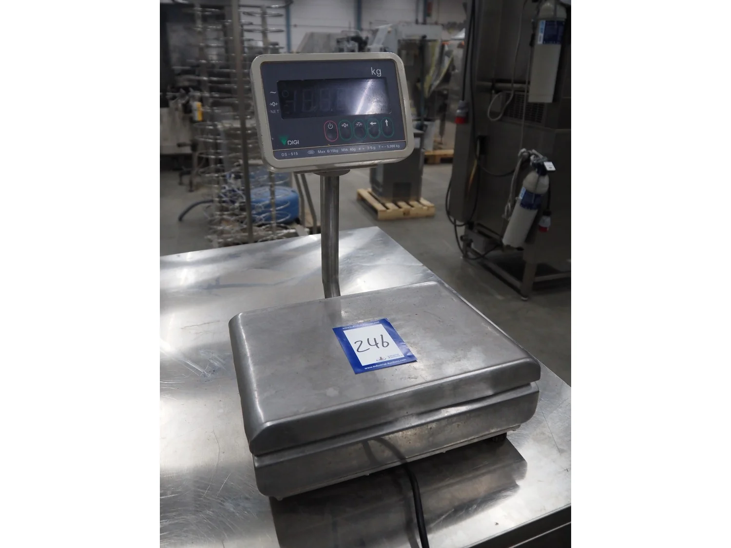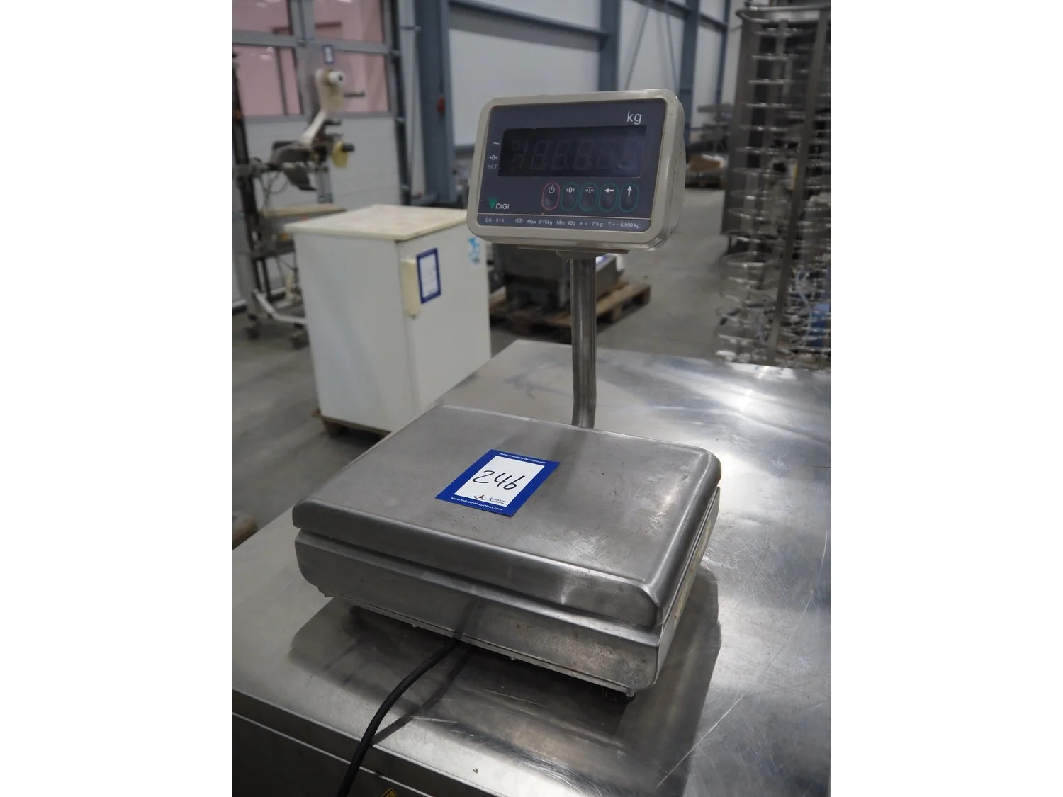 Digi Europe Ltd weighing scale, model: DS-515, maximum weight: 6/15 kg, minimum weight: 40 gram, e = 2/5 gram, T= -5.998 kg, dimensions: 340 mm x 320 mm x 450 mm.