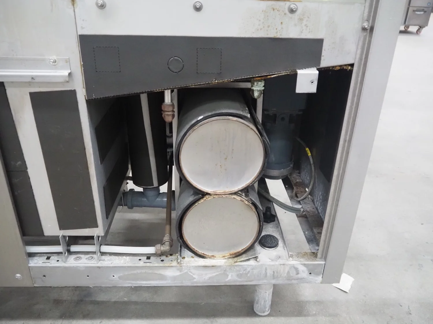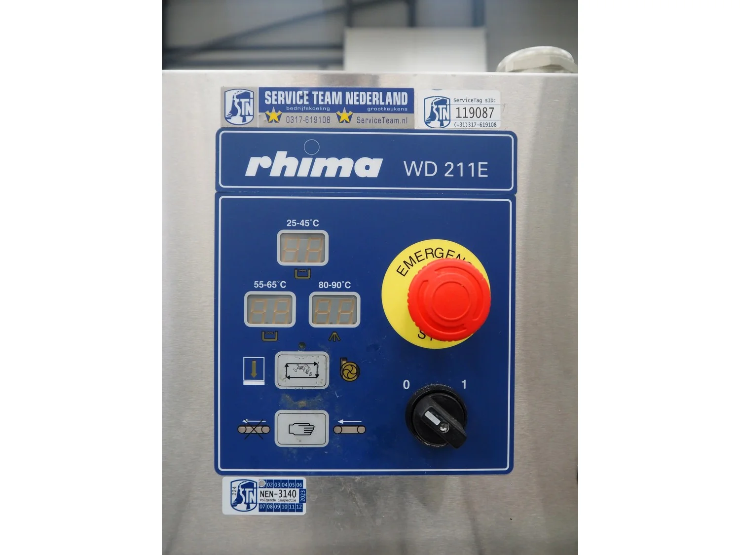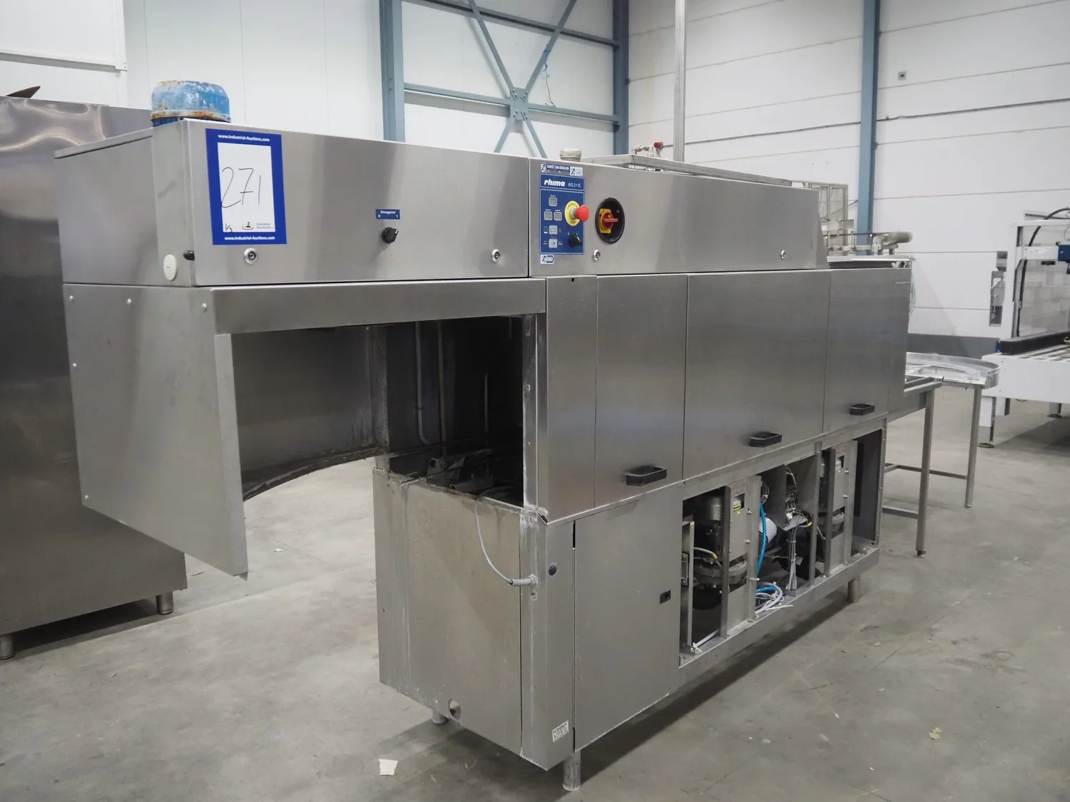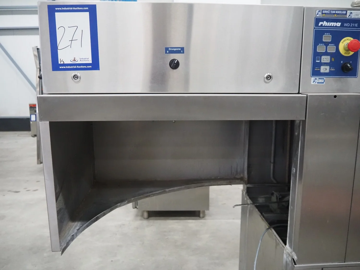 Rhima/Wexiödisk AB dishwasher with infeed roller conveyor, type: WD 211E, number: 037198, year of construction: 2003, 400 V, 3 Ph, 50 Hz, 80 A, 42 kW, dimensions: 3400 mm x 1400 mm x 1800 mm.