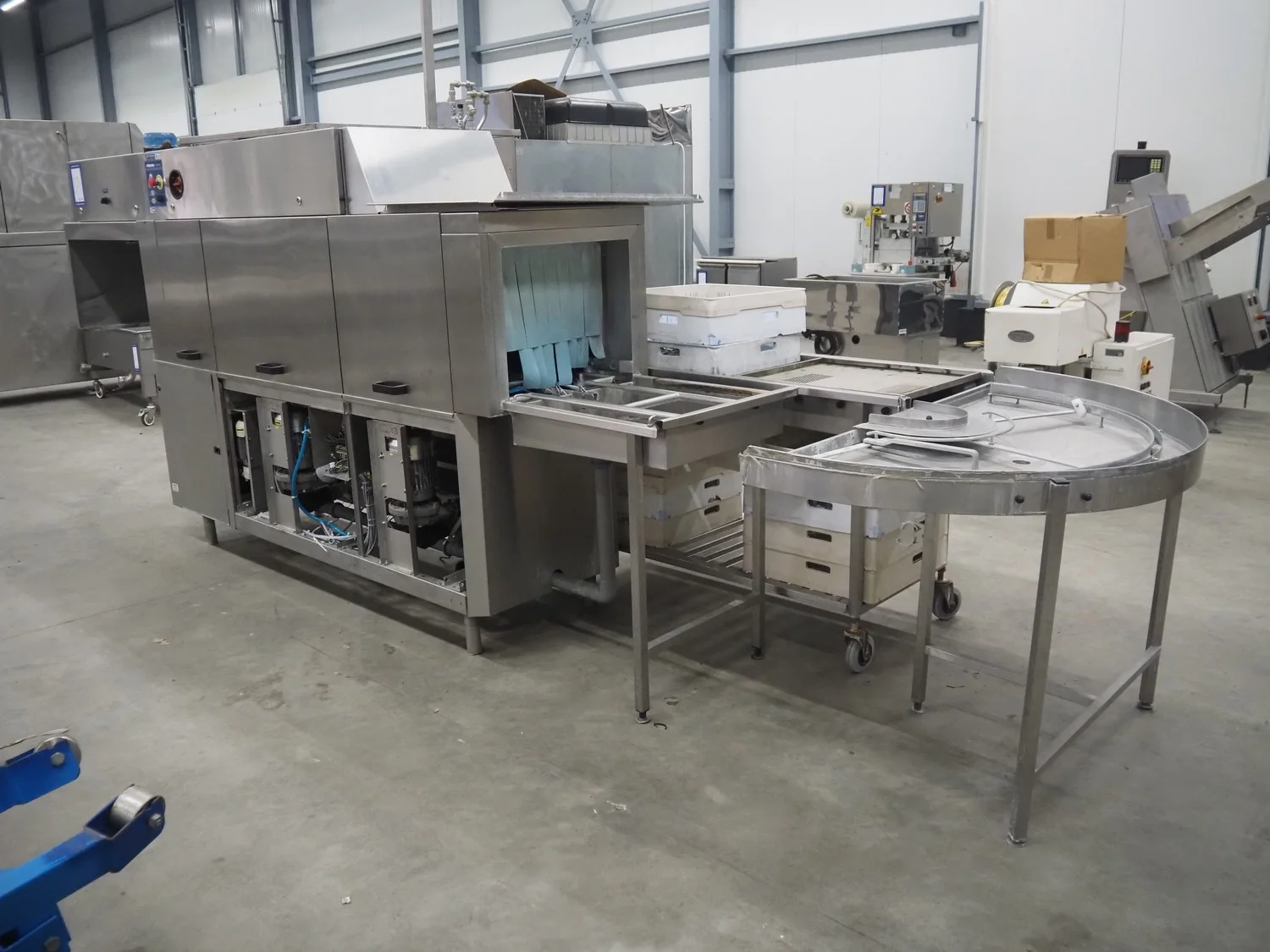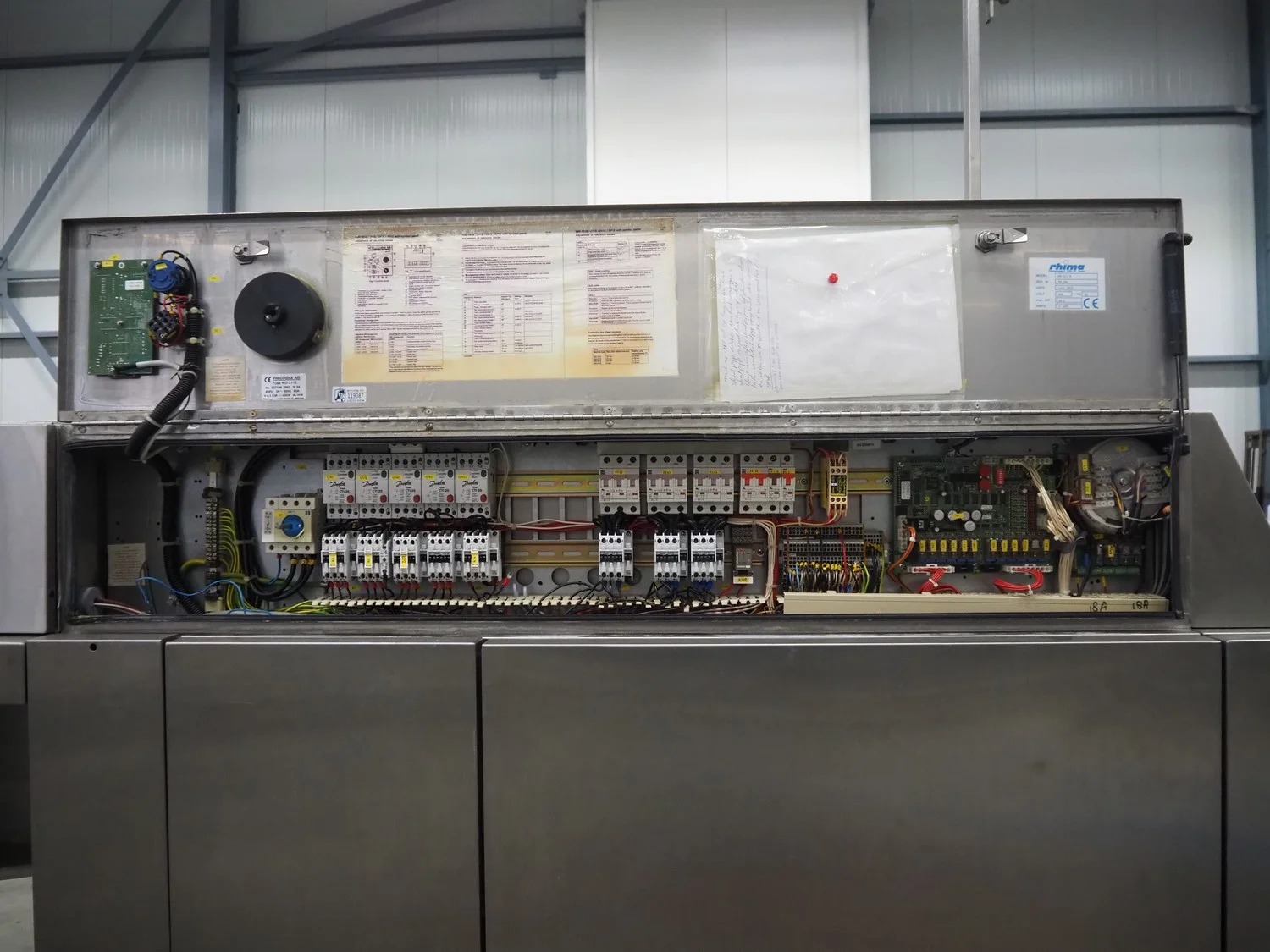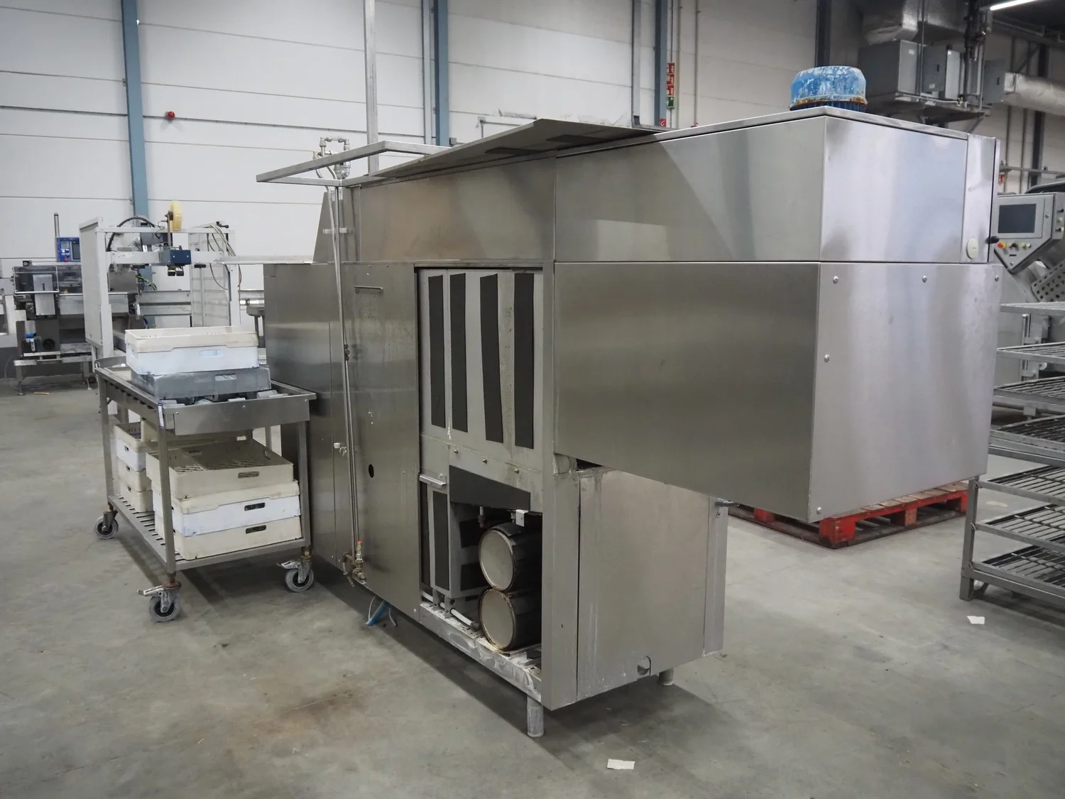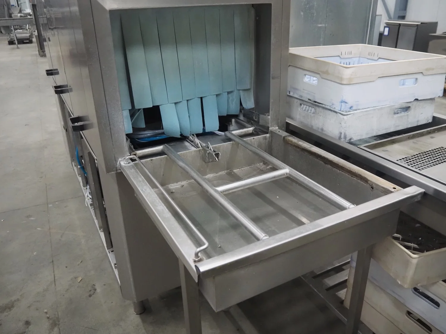 Rhima/Wexiödisk AB dishwasher with infeed roller conveyor, type: WD 211E, number: 037198, year of construction: 2003, 400 V, 3 Ph, 50 Hz, 80 A, 42 kW, dimensions: 3400 mm x 1400 mm x 1800 mm.