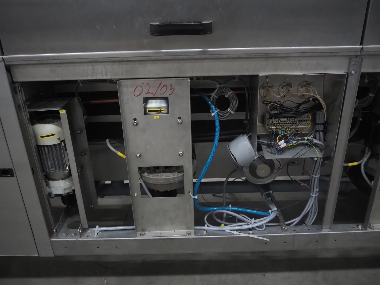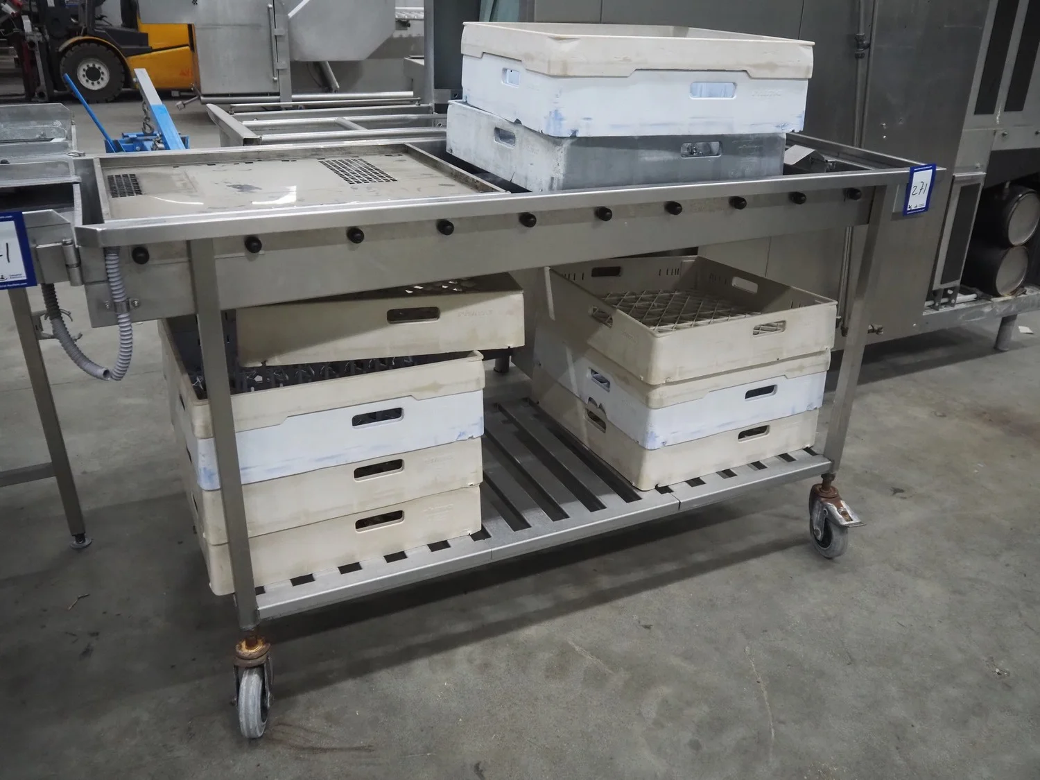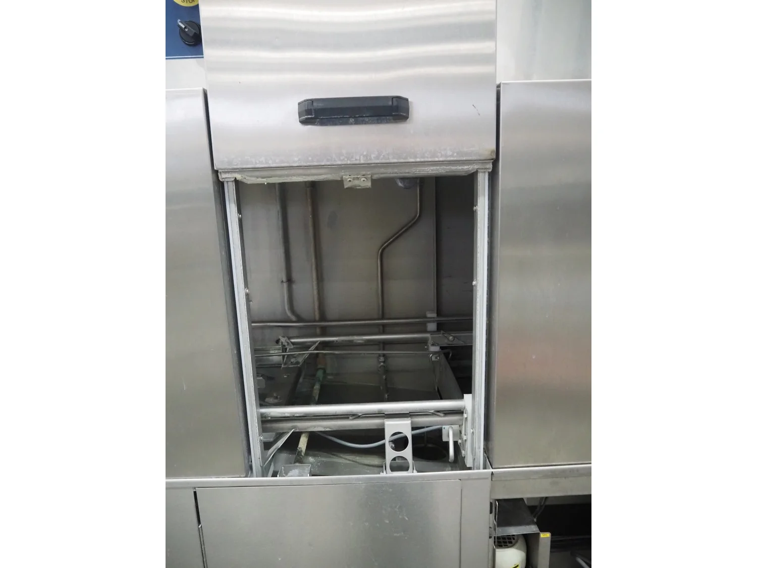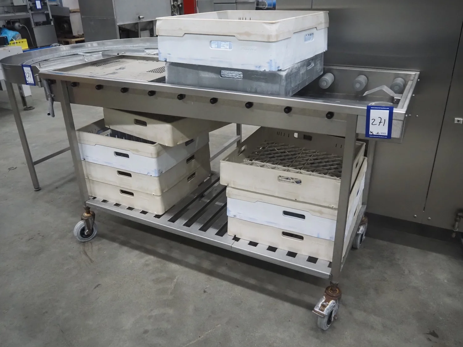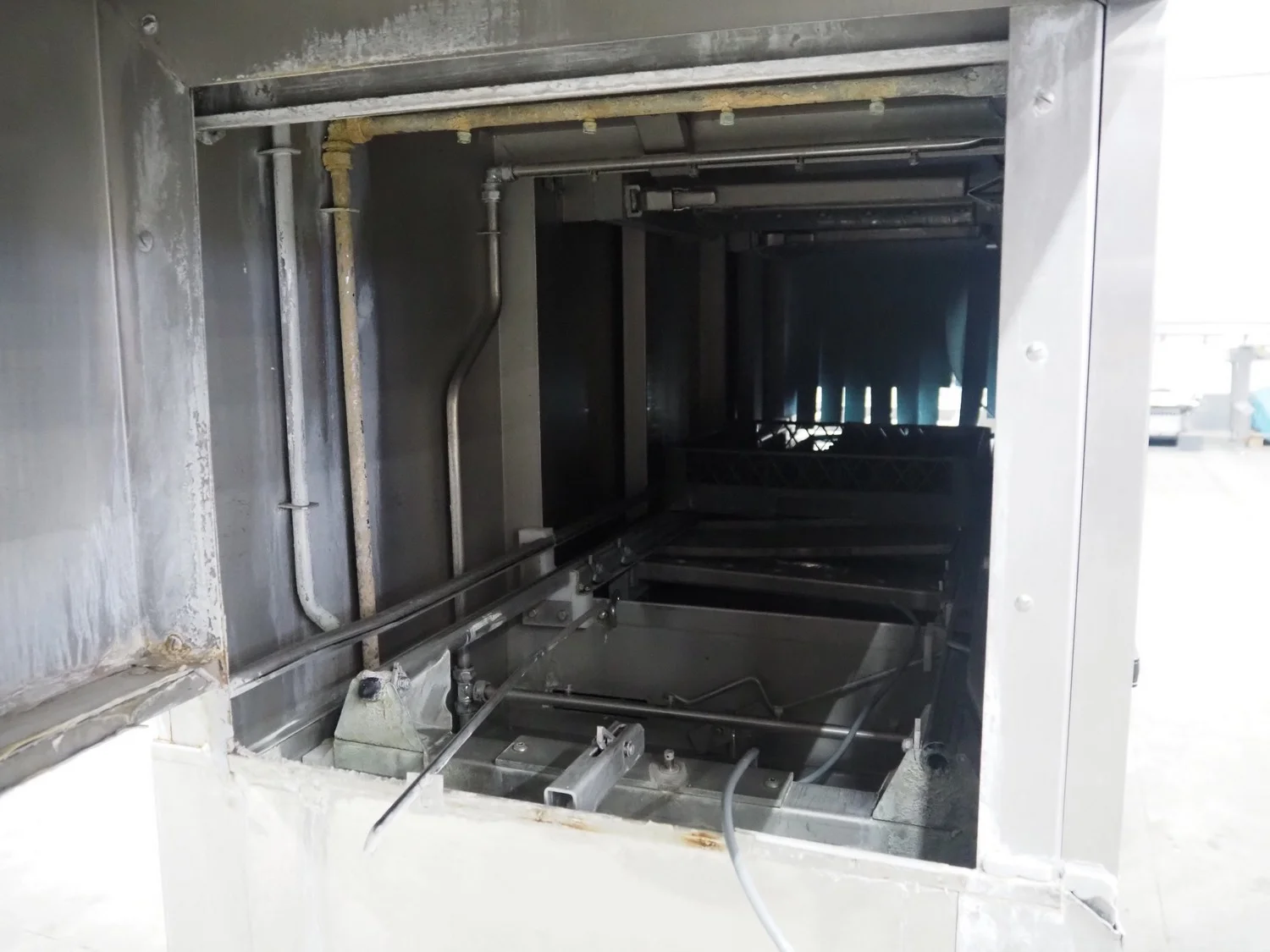 Rhima/Wexiödisk AB dishwasher with infeed roller conveyor, type: WD 211E, number: 037198, year of construction: 2003, 400 V, 3 Ph, 50 Hz, 80 A, 42 kW, dimensions: 3400 mm x 1400 mm x 1800 mm.