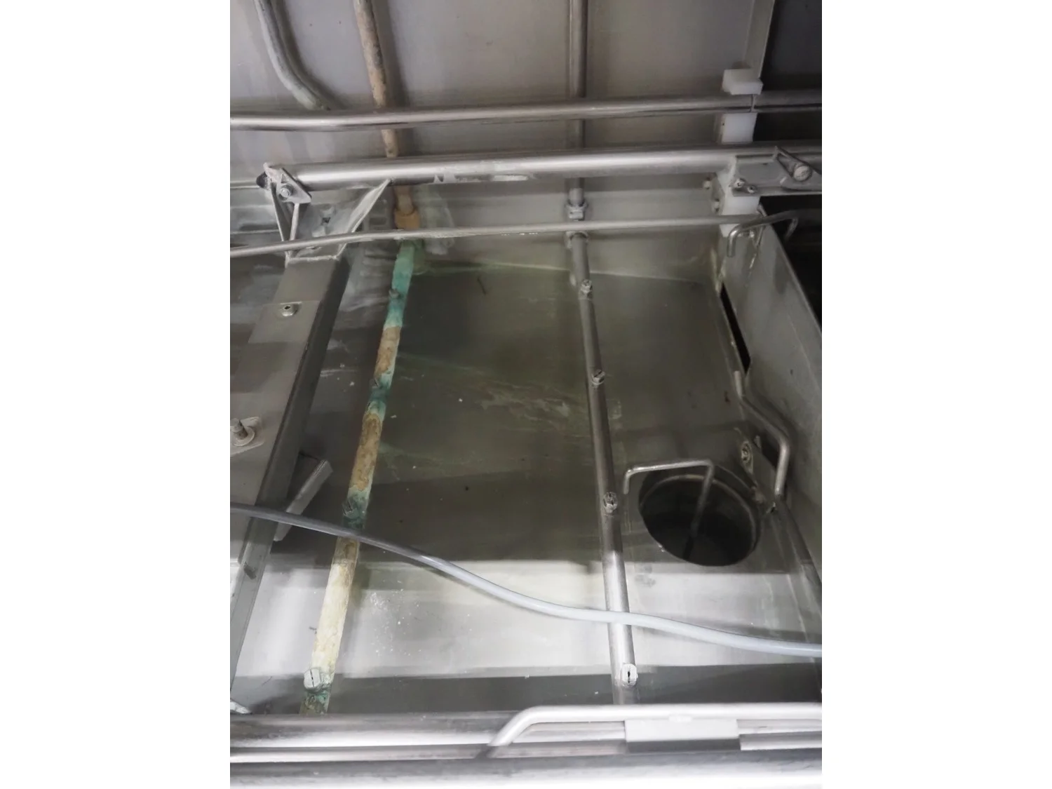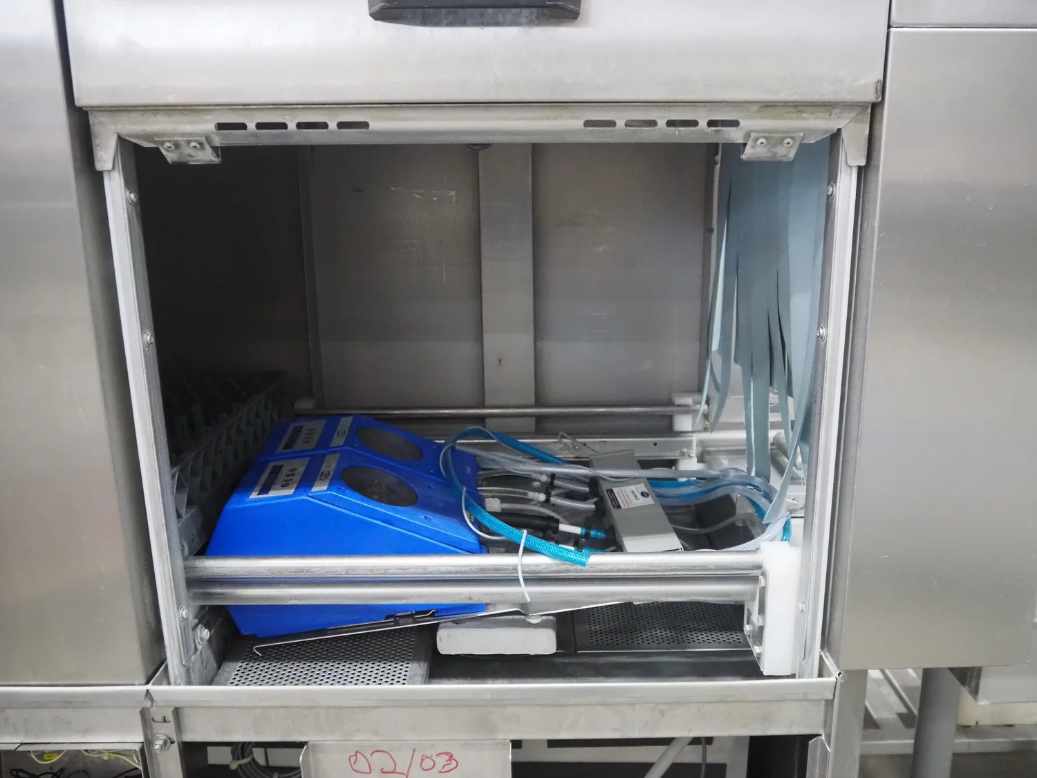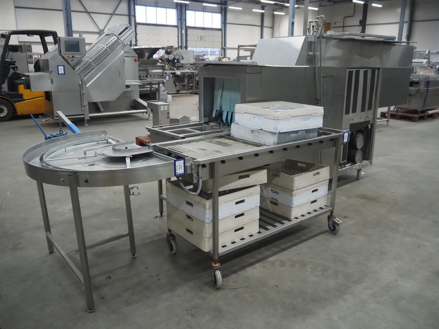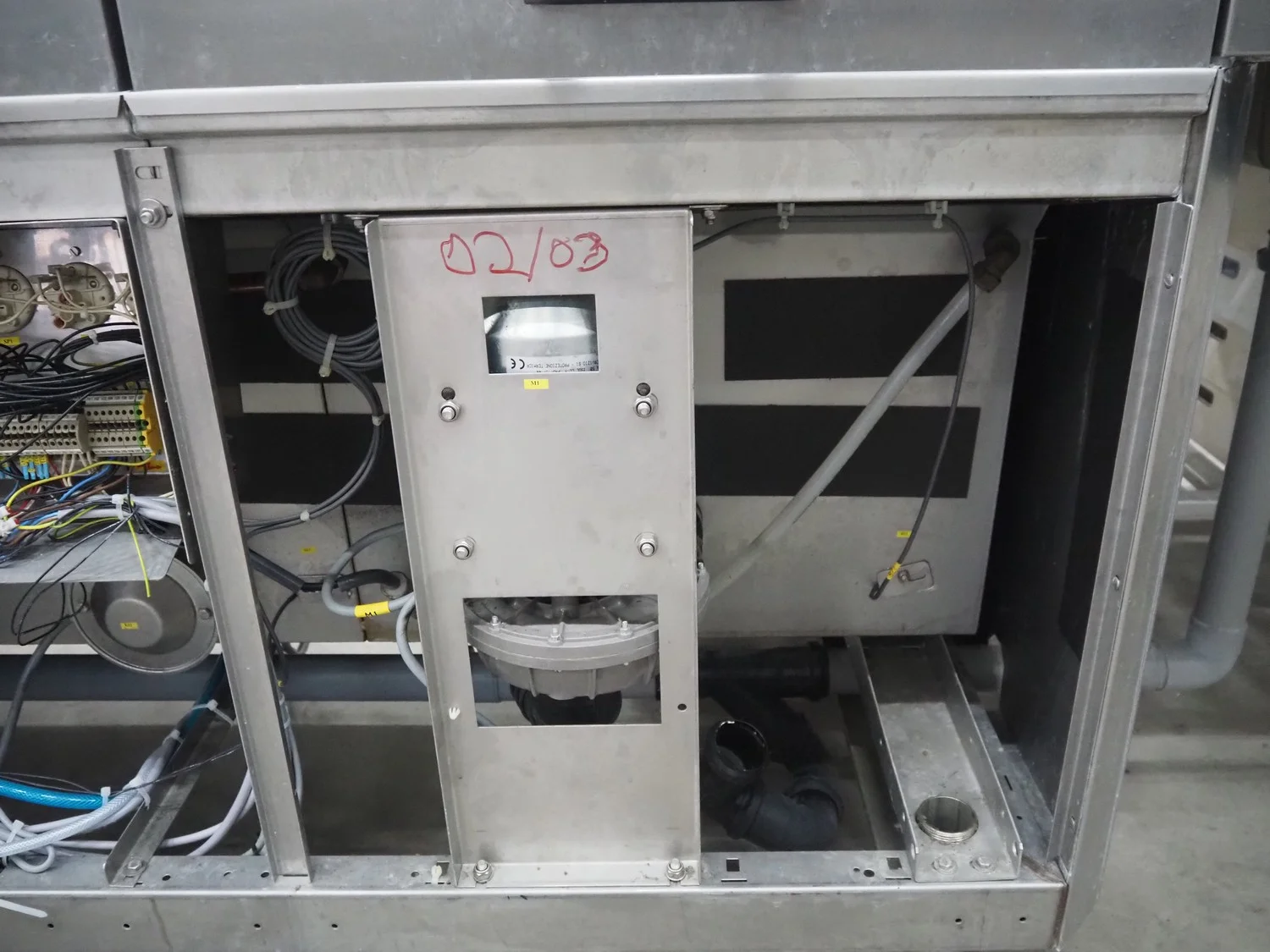 Rhima/Wexiödisk AB dishwasher with infeed roller conveyor, type: WD 211E, number: 037198, year of construction: 2003, 400 V, 3 Ph, 50 Hz, 80 A, 42 kW, dimensions: 3400 mm x 1400 mm x 1800 mm.