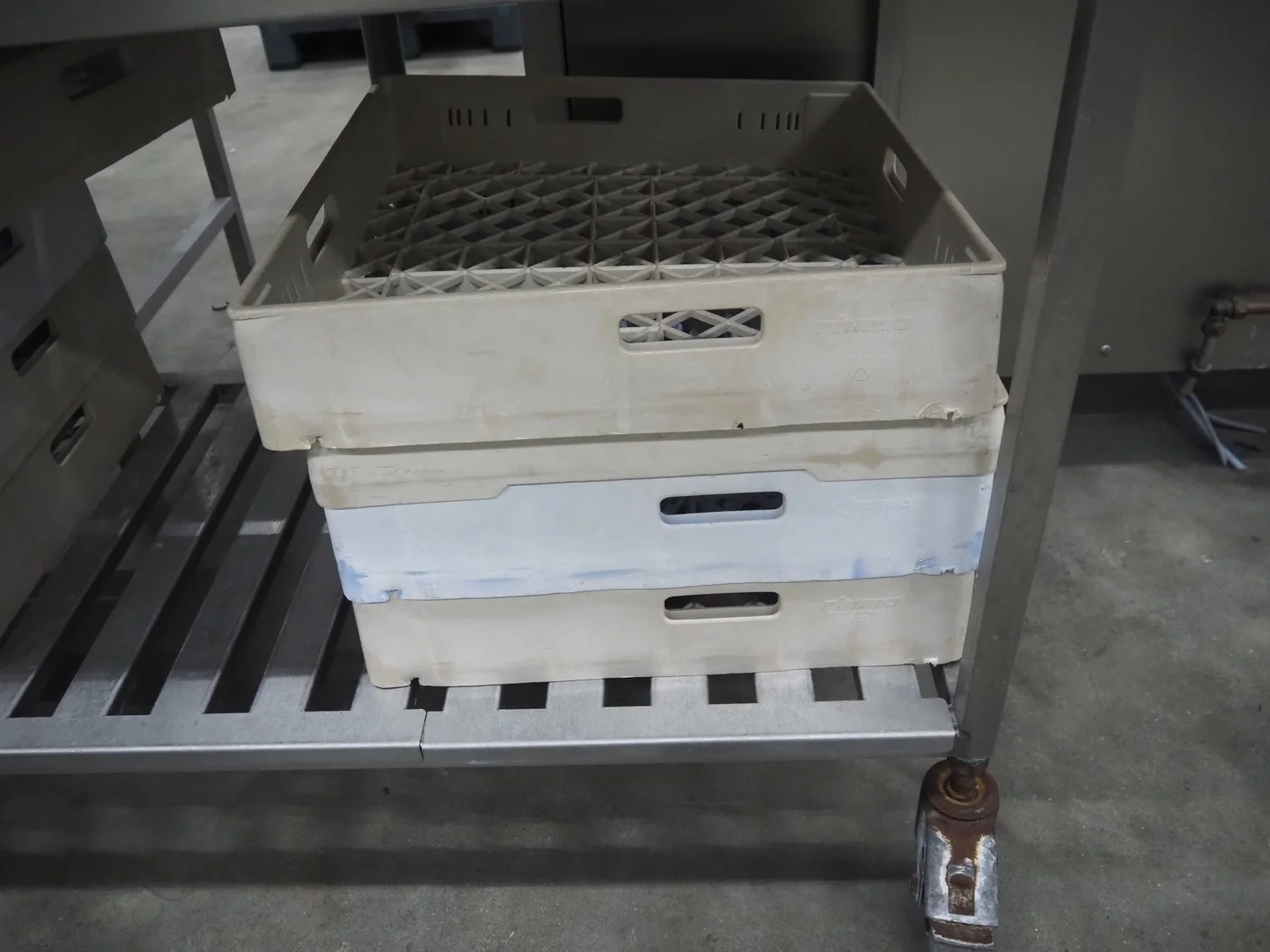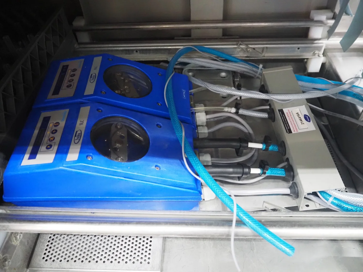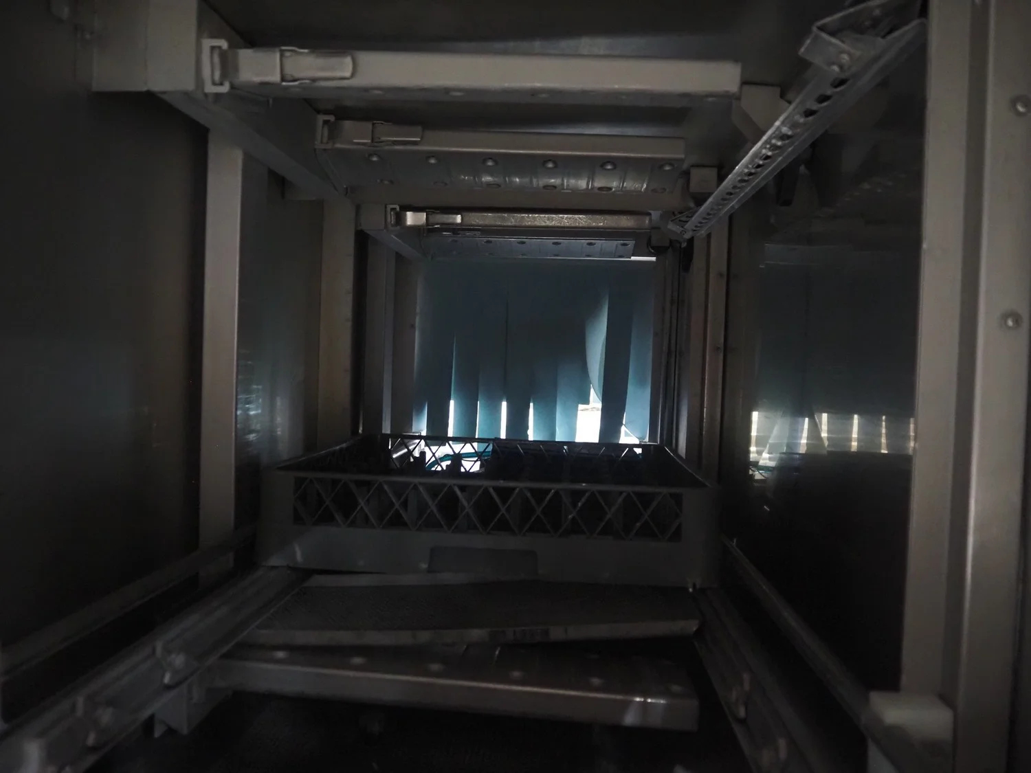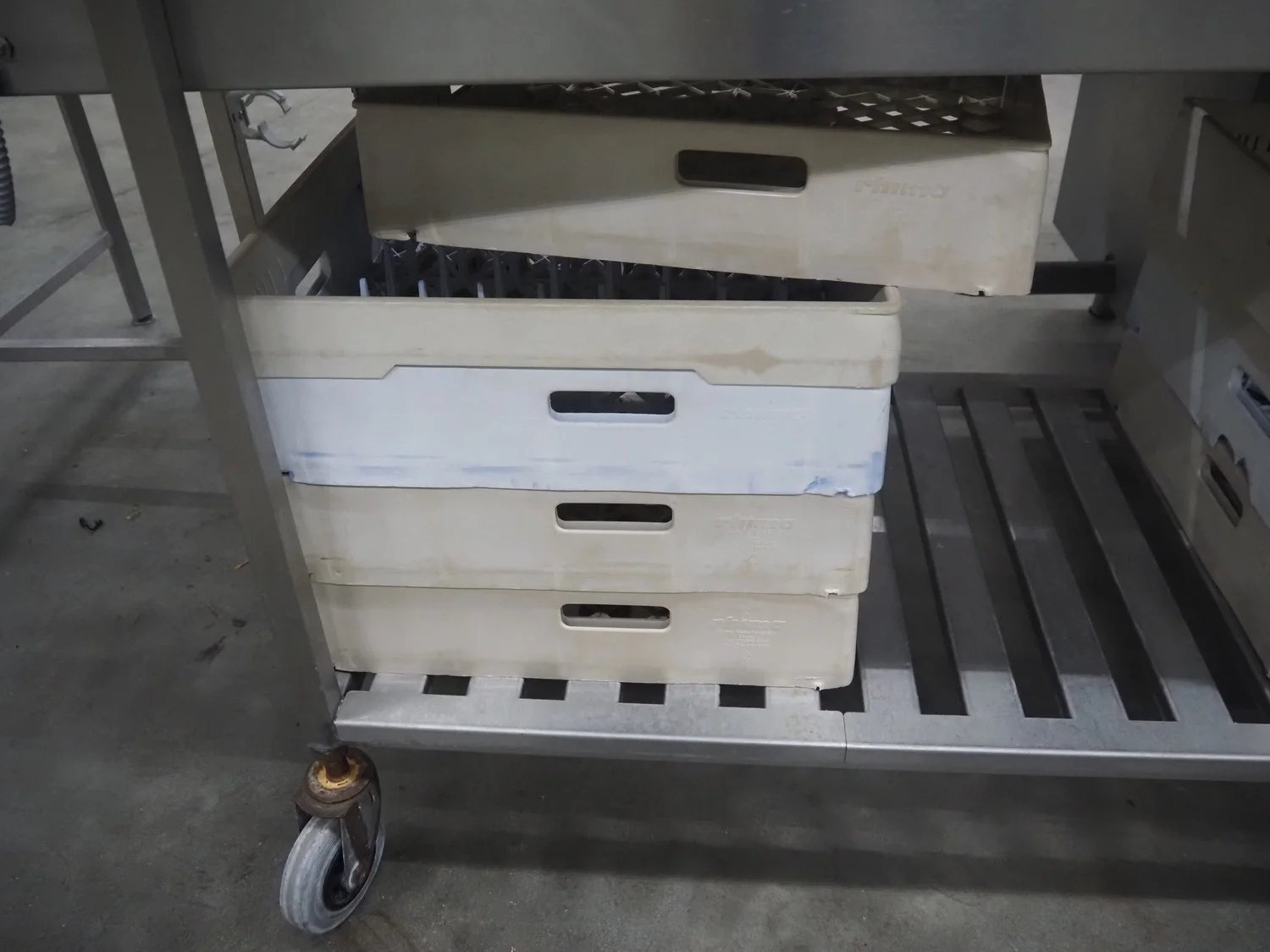 Rhima/Wexiödisk AB dishwasher with infeed roller conveyor, type: WD 211E, number: 037198, year of construction: 2003, 400 V, 3 Ph, 50 Hz, 80 A, 42 kW, dimensions: 3400 mm x 1400 mm x 1800 mm.