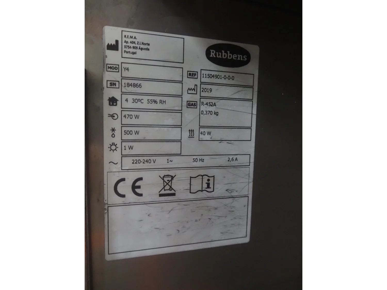 Rubbens blast chiller, model: Y4, serial number: 184866, year of construction: 2019, 220-240 V, 1 Ph, 50 Hz, 2.6 A, refrigerant: R452A, 0.370 kg, dimensions: 720 mm x 510 mm x 2080 mm. Damaged.