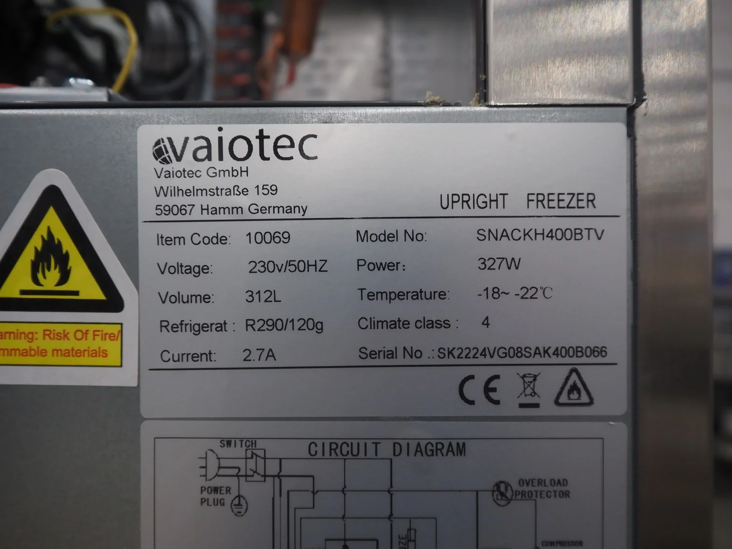 Vaiotec freezer, model: SNACKH400BTV, serial number: SK2224VG08SAK400B066, 230 V, 50 Hz, 2.7 A, refrigerant: R290, 120 gram, dimensions: 750 mm x 700 mm x 1970 mm. Damaged.