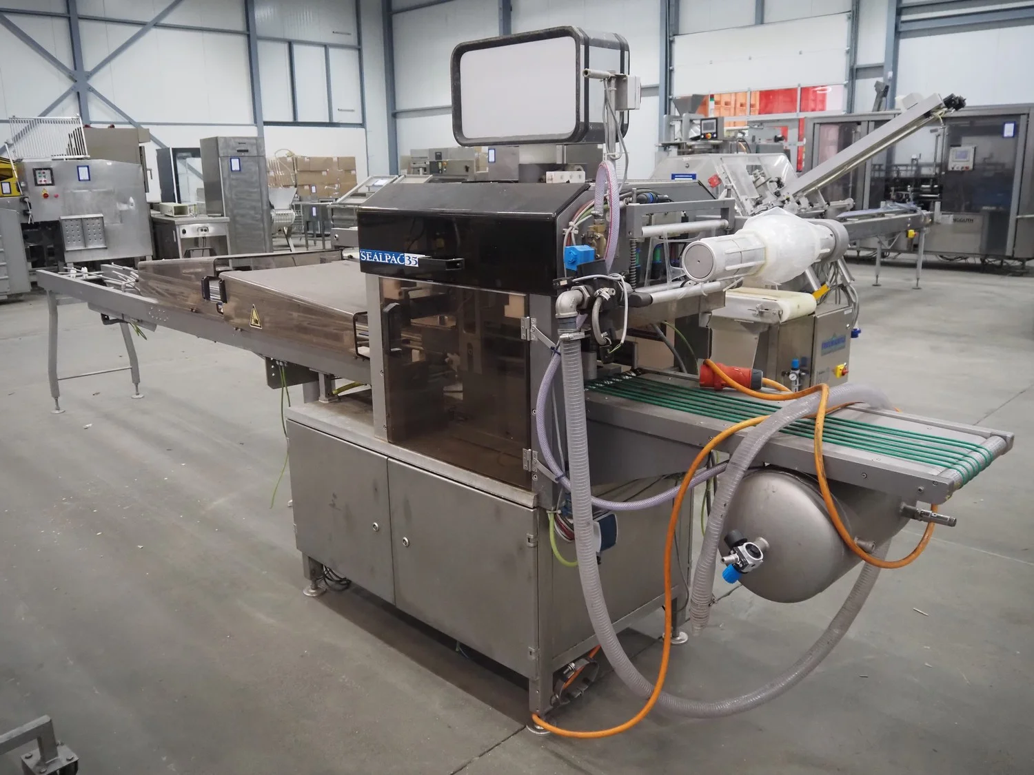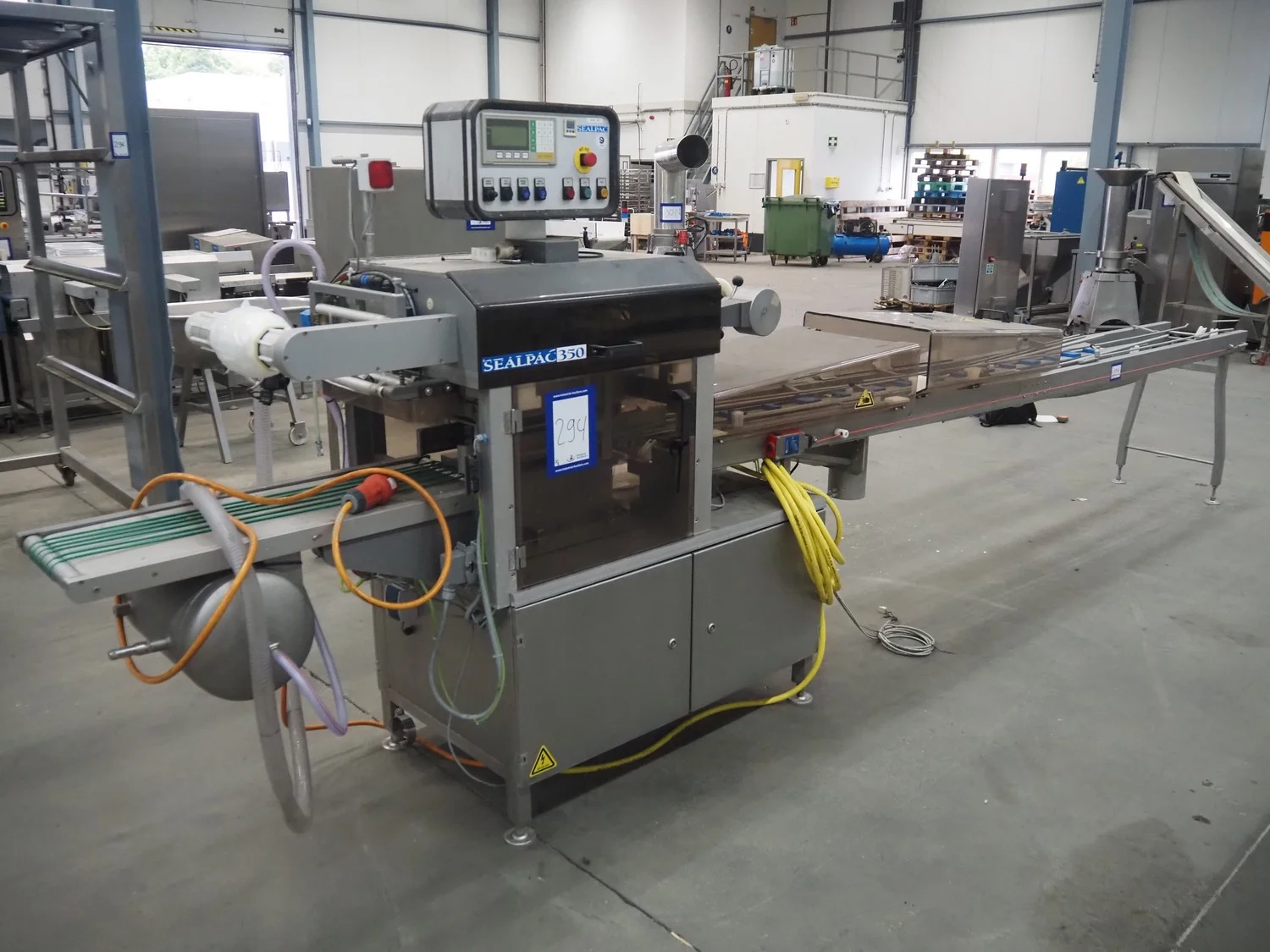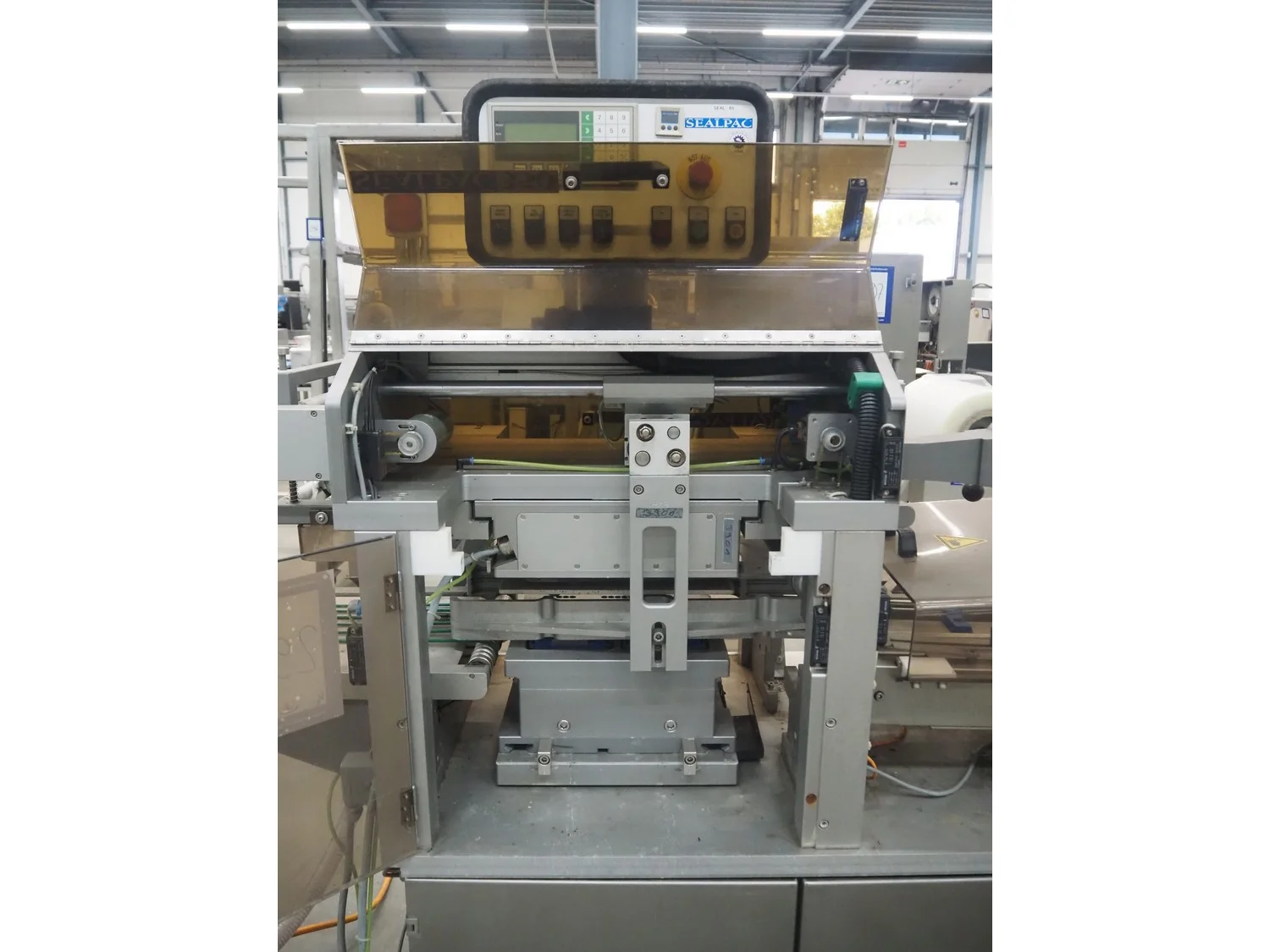 Sealpac traysealer, type: SEALPAC 350, serial number: TVG 0259001, year of construction: 2002, 400/230 V, 3 Ph, 50 Hz, 3 kW, dye: (2x) 145 mm x 210 mm, film width: 230 mm, total dimensions: 4550 mm x 700 mm x 1750 mm.