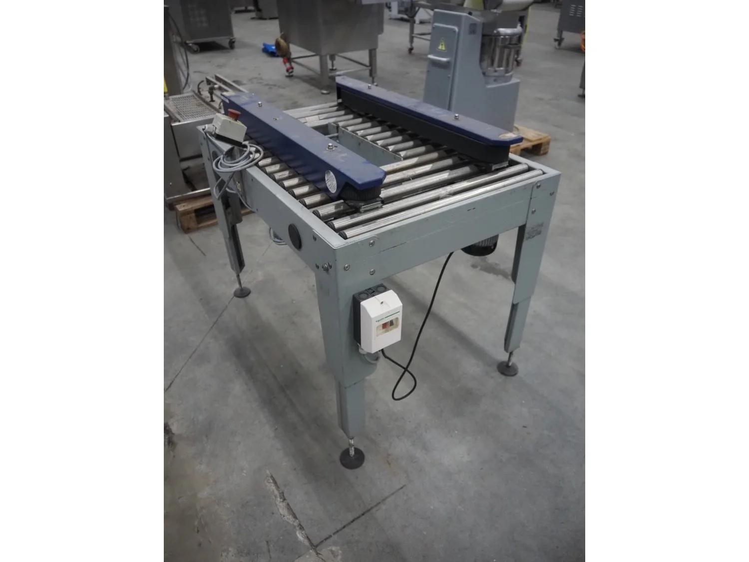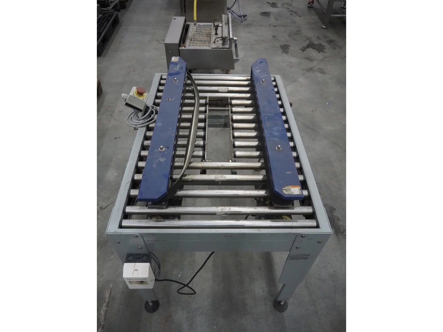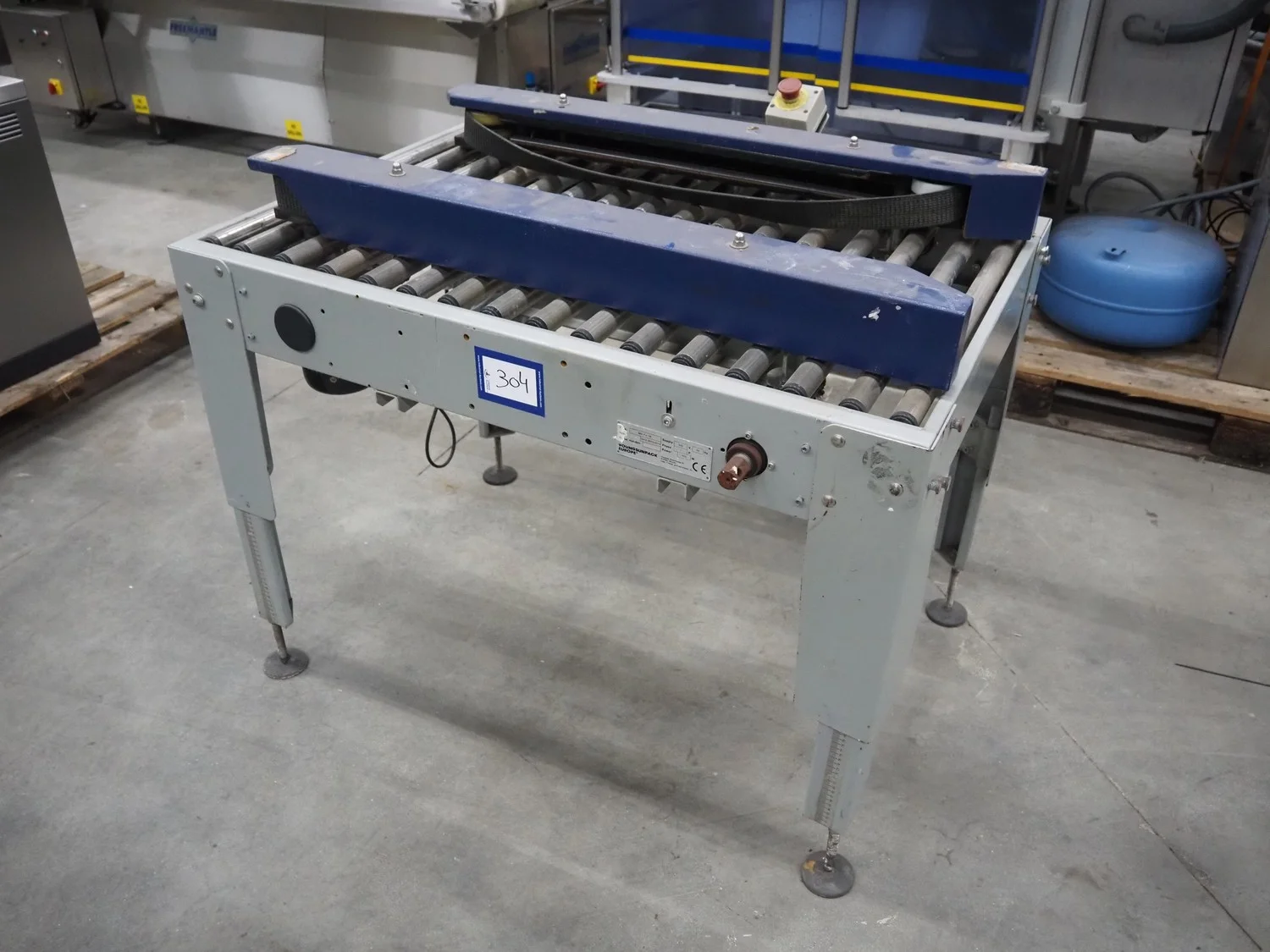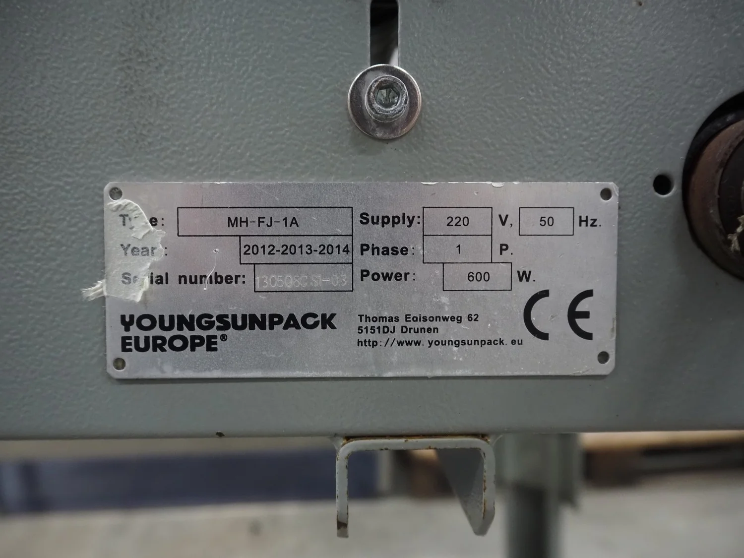 Youngsunpack box closing machine, type: MH-FJ-1A, serial number: 130508C S1-03, year of construction: 2012/2013/2014, 220 V, 1 Ph, 50 Hz, 600 W, aluminium rollers, roller width: (14x) 280 mm and (8x) 680 mm, total dimensions: 1100 mm x 800 mm x 900 mm. Incomplete.