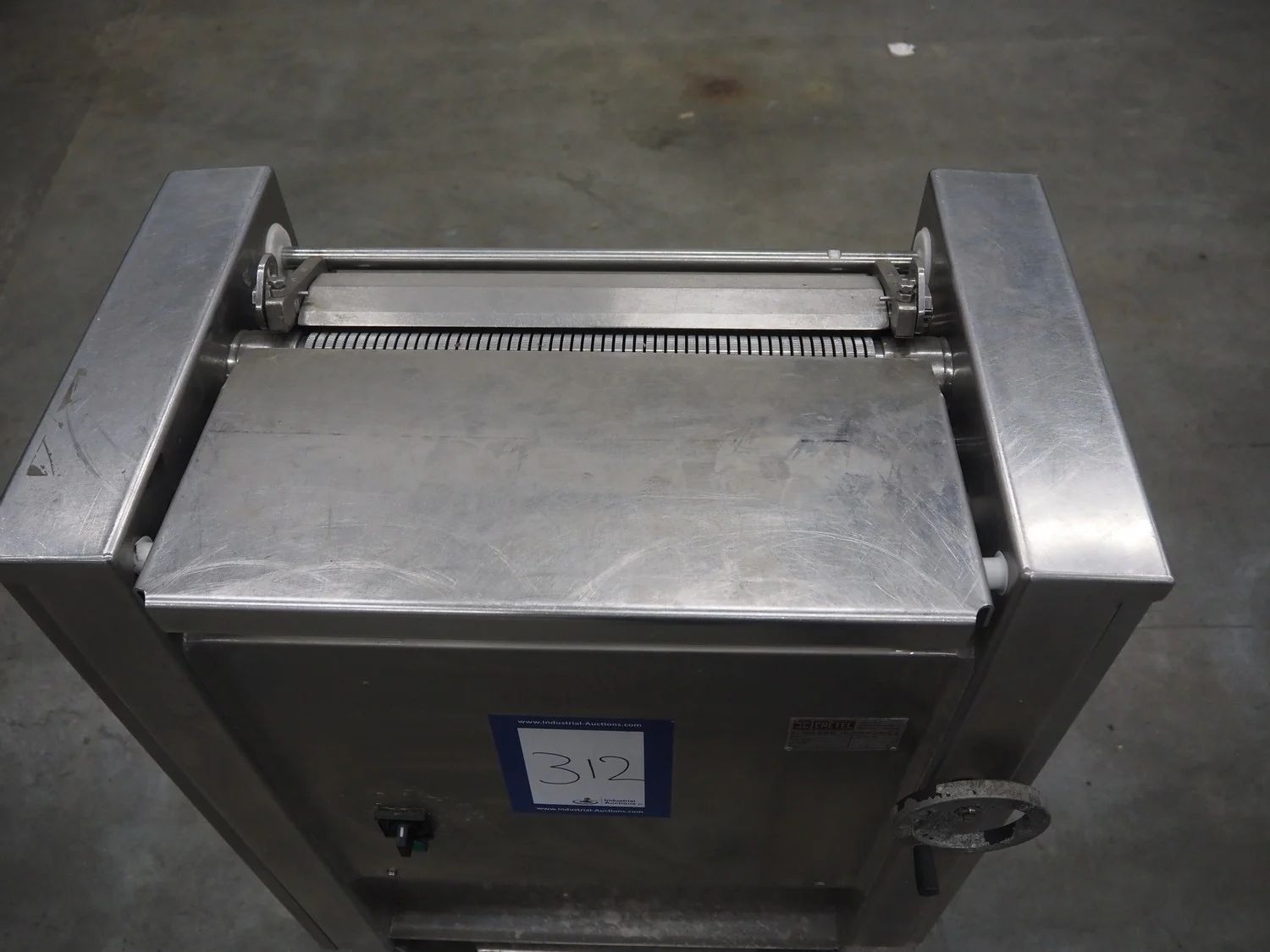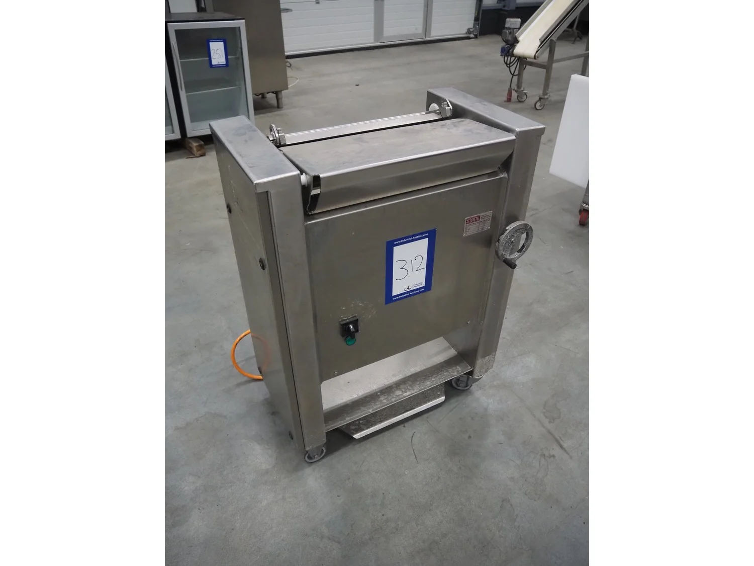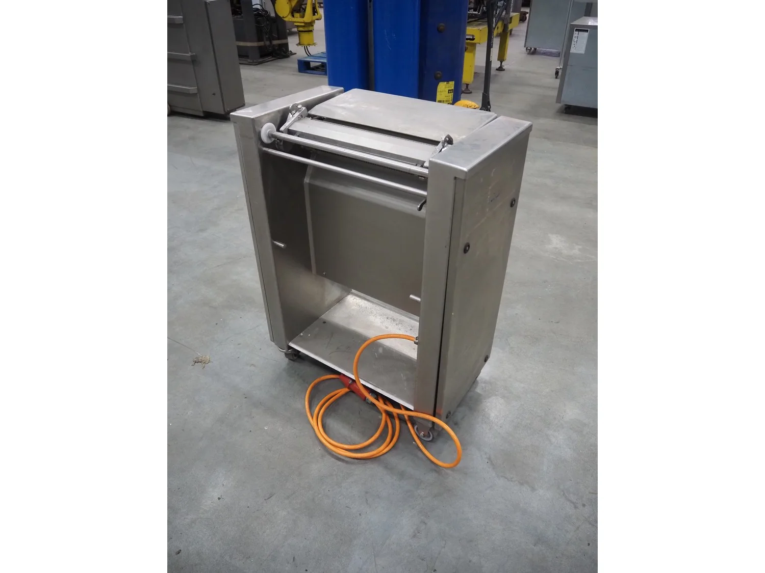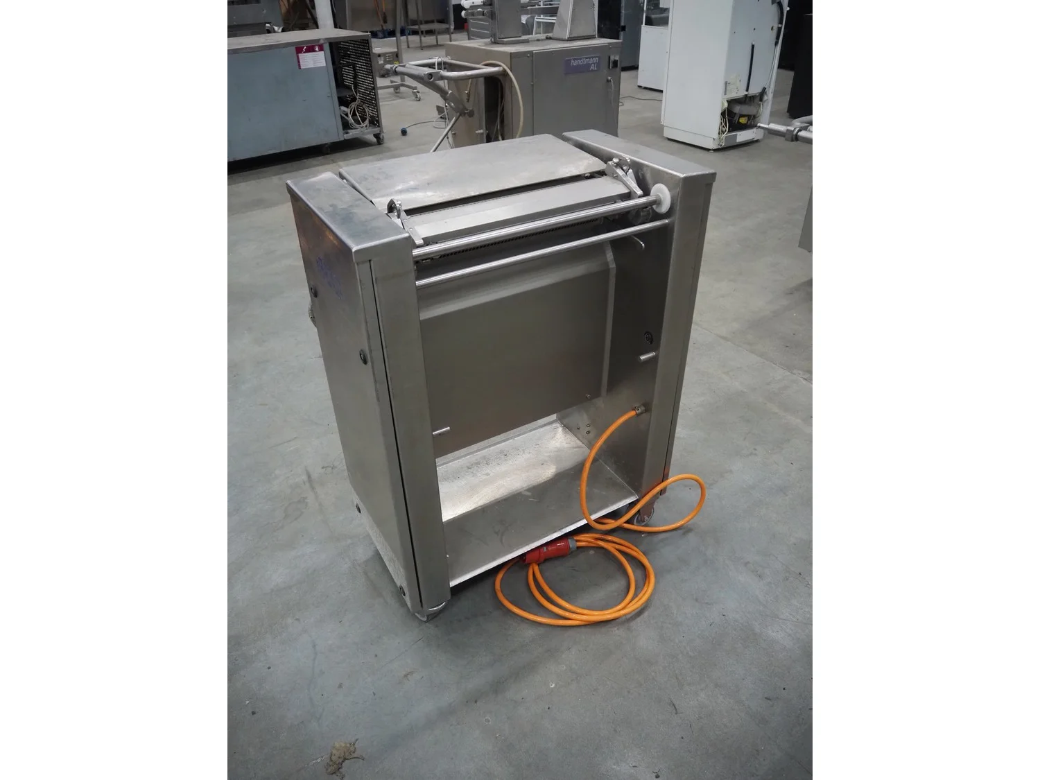 Cretel mobile skinning machine, working width: 435 mm, total dimensions: 750 mm x 500 mm x 990 mm.