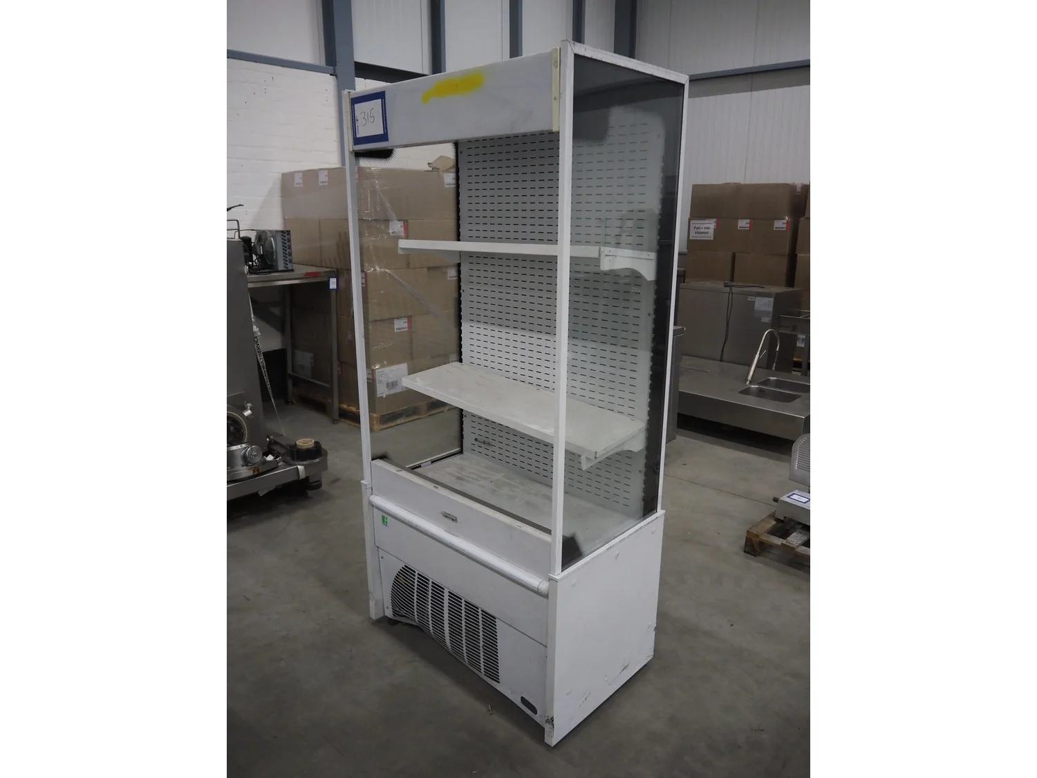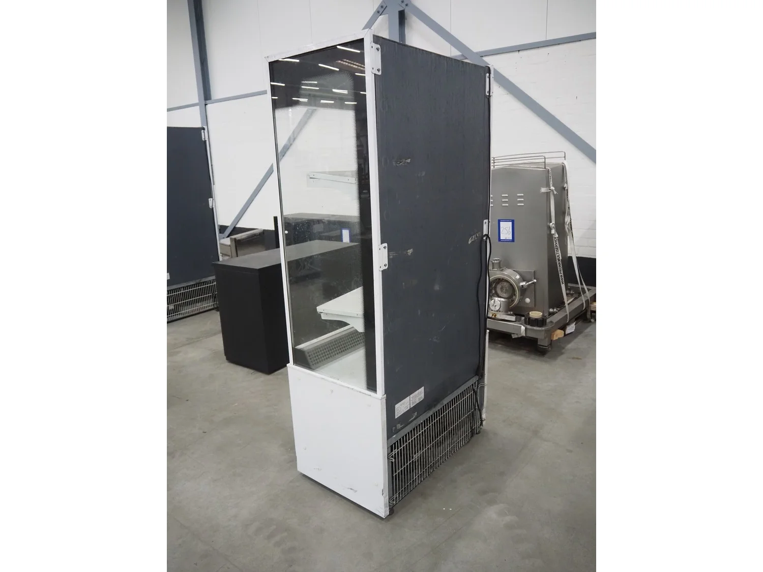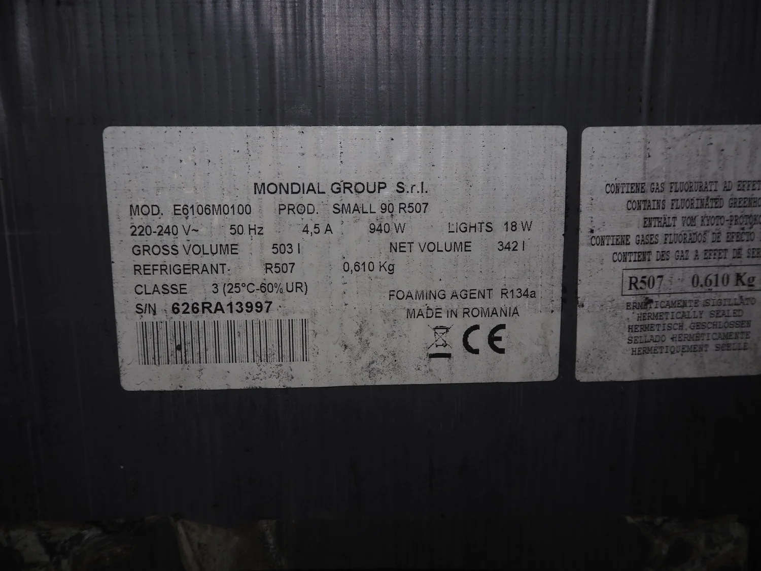 Mondial Group S.r.l. refrigerated showcase, type: E6106M0100, number: 626RA13997, 220/240 V, 50 Hz, 4.5 A, 940 W, refrigerant: R507, 0.610 kg, 3 floors, dimensions each floor: 285 mm x 900 mm, total dimensions: 600 mm x 980 mm x 2020 mm.