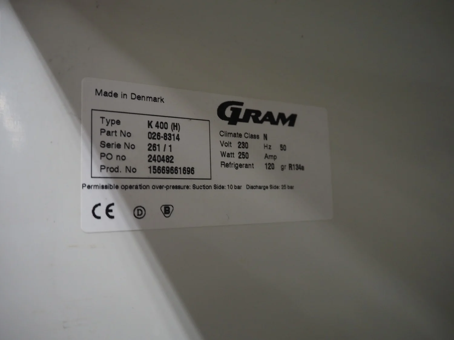 Gram refrigerator, type: K 400 (H), serial number: 261/1, 230 V, 50 Hz, refrigerant: 120 gr R134a, inside dimensions: 500 mm x 450 mm x 1500 mm, total dimensions: 600 mm x 600 mm x 1720 mm.