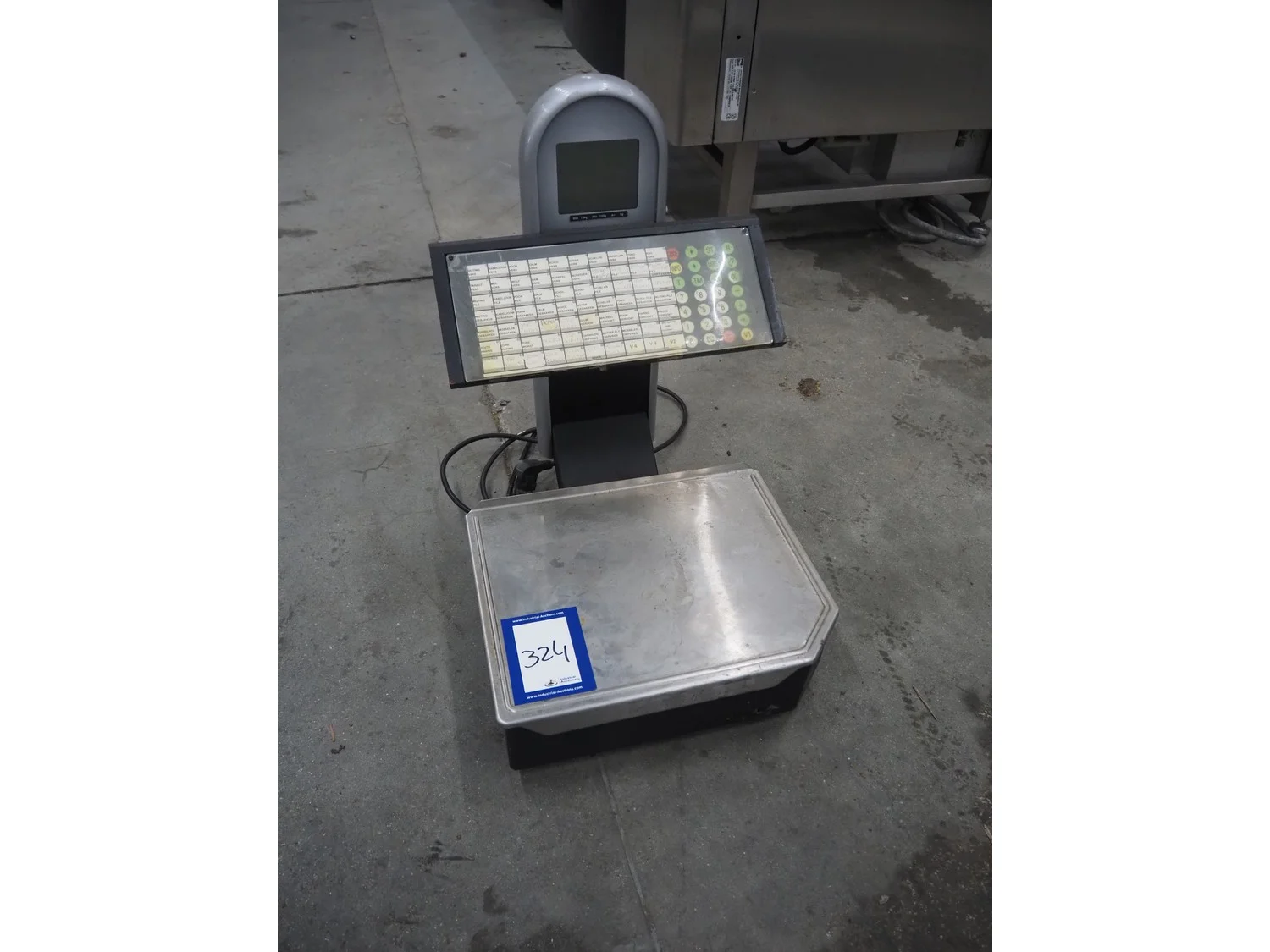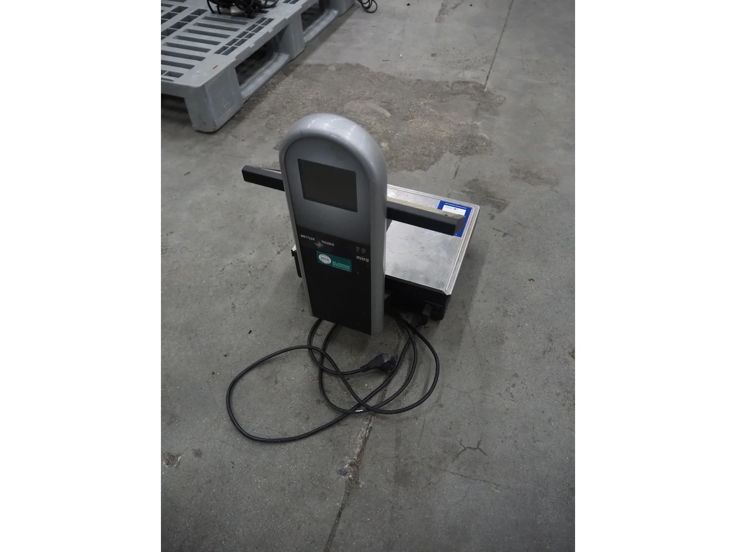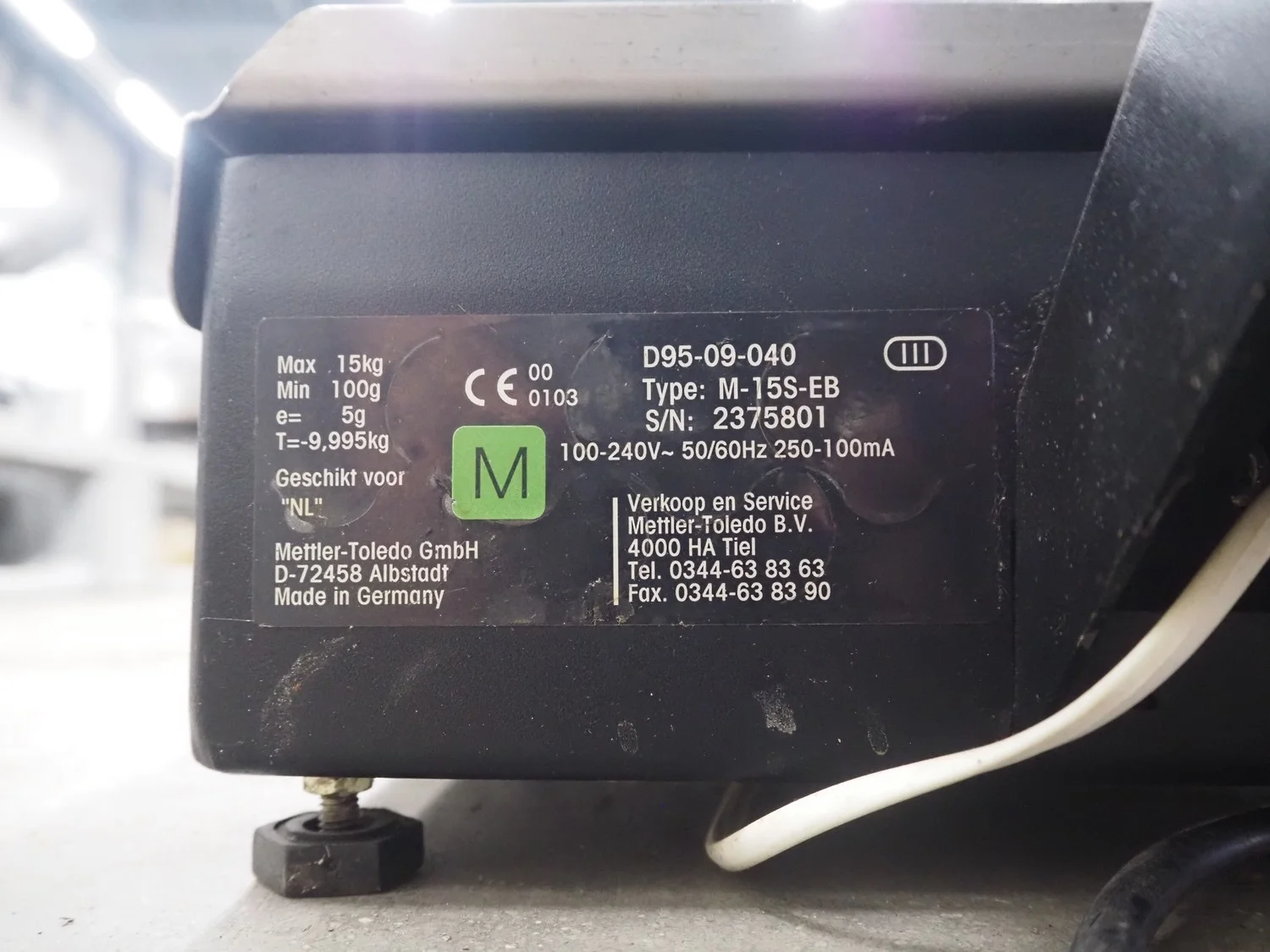 Mettler-Toledo GmbH weighing scale with label printer, type: M-15S-EB, serial number: 2375801, 100-240 V, 50/60 Hz, maximum weight: 15 kg, minimum weight: 100 gram, e= 5 gram, T- -9,995 kg, dimensions: 400 mm x 350 mm x 520 mm.