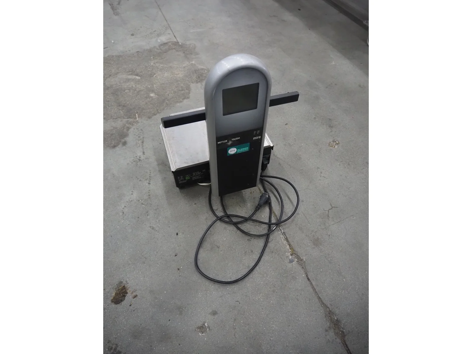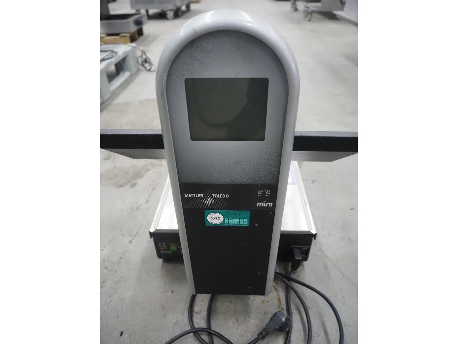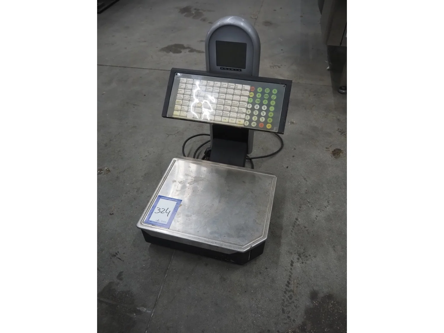 Mettler-Toledo GmbH weighing scale with label printer, type: M-15S-EB, serial number: 2375801, 100-240 V, 50/60 Hz, maximum weight: 15 kg, minimum weight: 100 gram, e= 5 gram, T- -9,995 kg, dimensions: 400 mm x 350 mm x 520 mm.