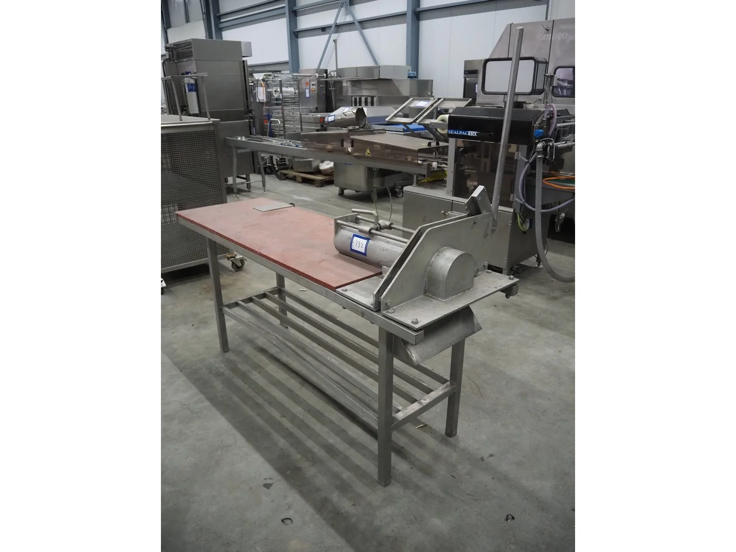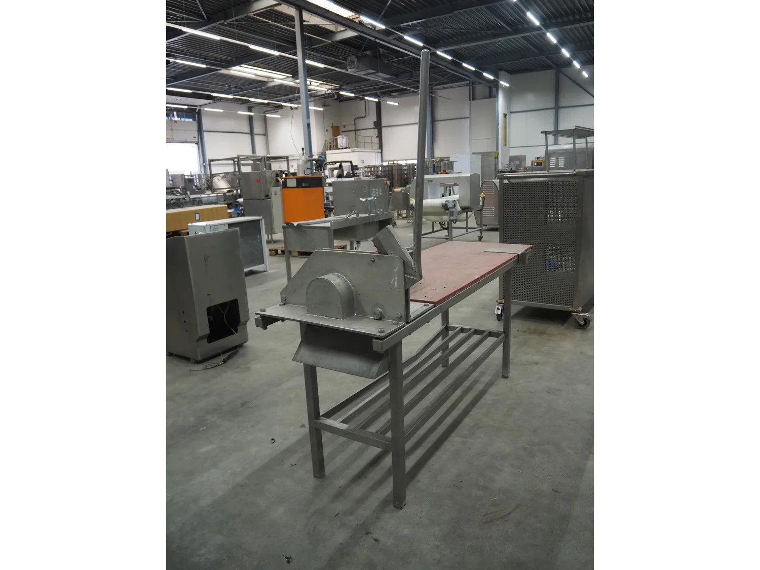 Slicer on table with plastic worktop, dimensions: 1900 mm x 600 mm x 850 mm.