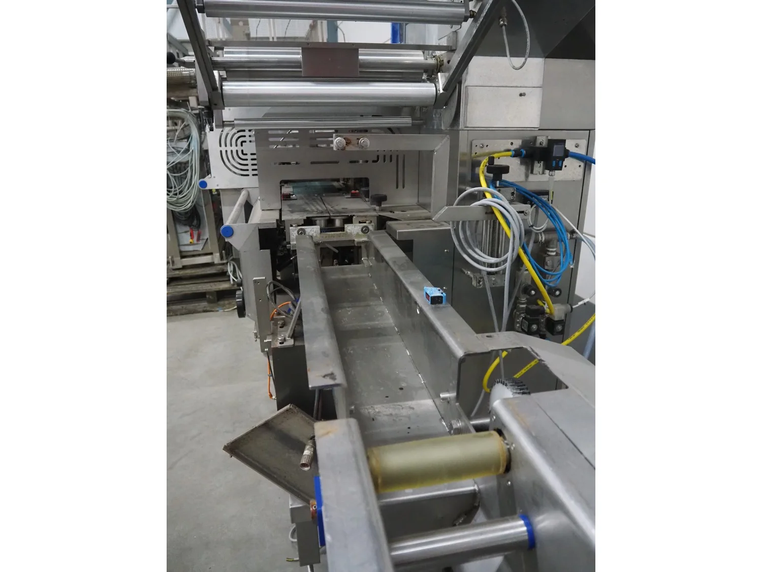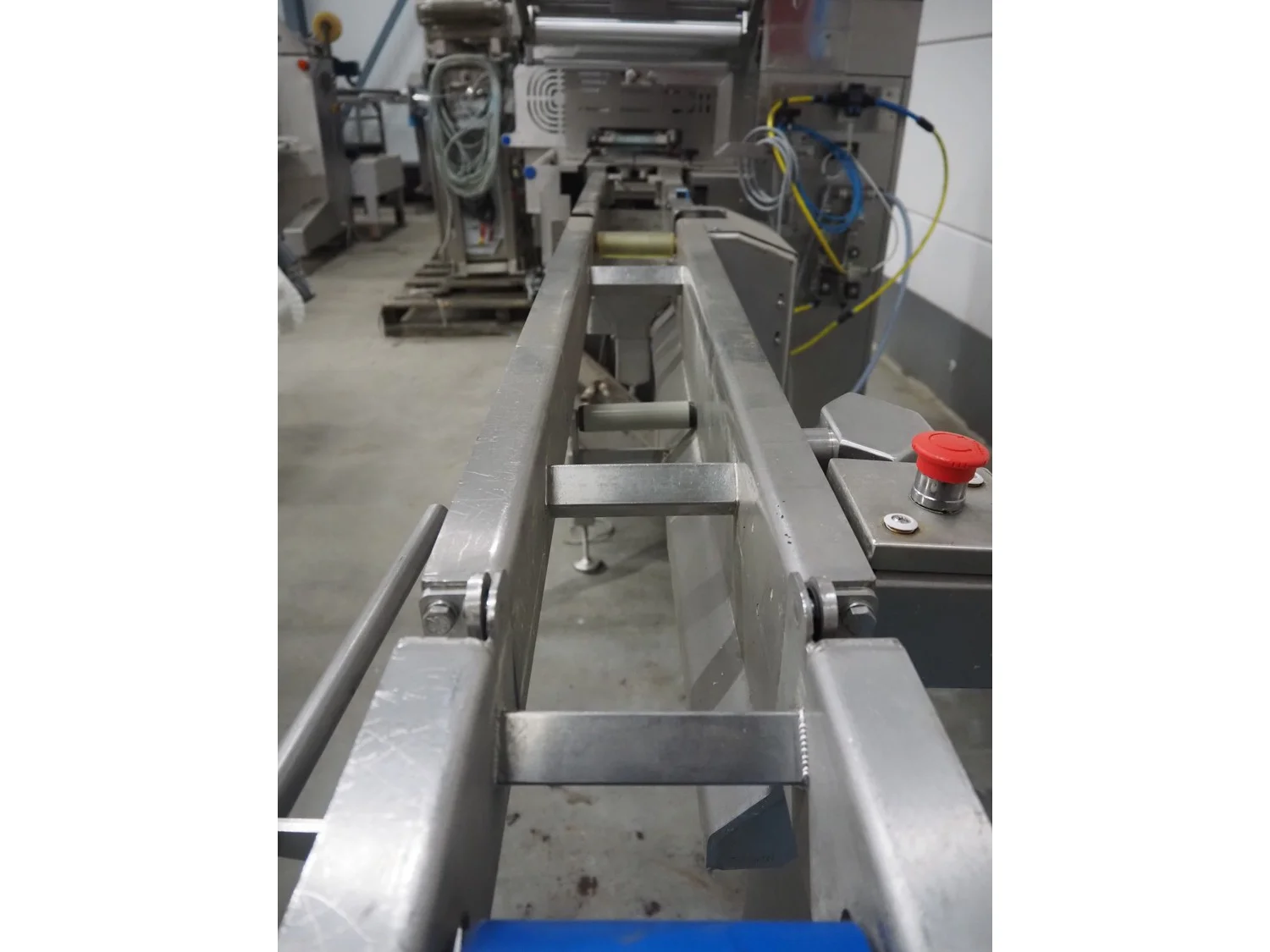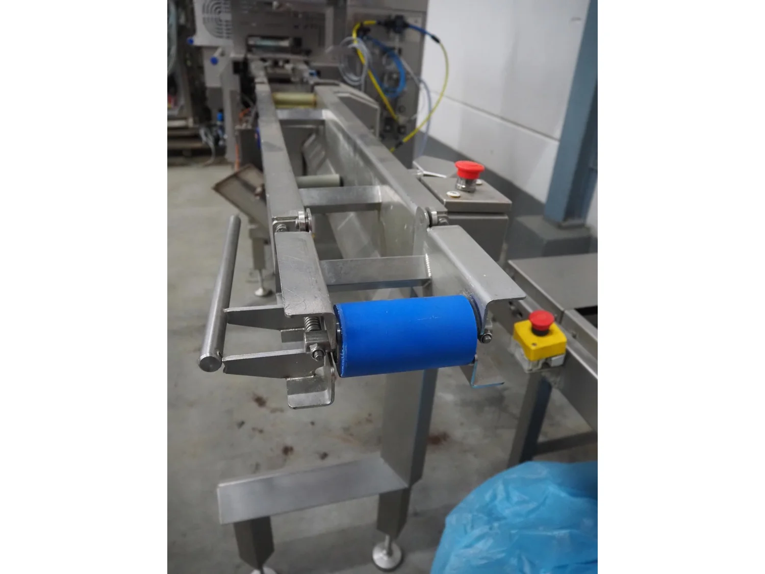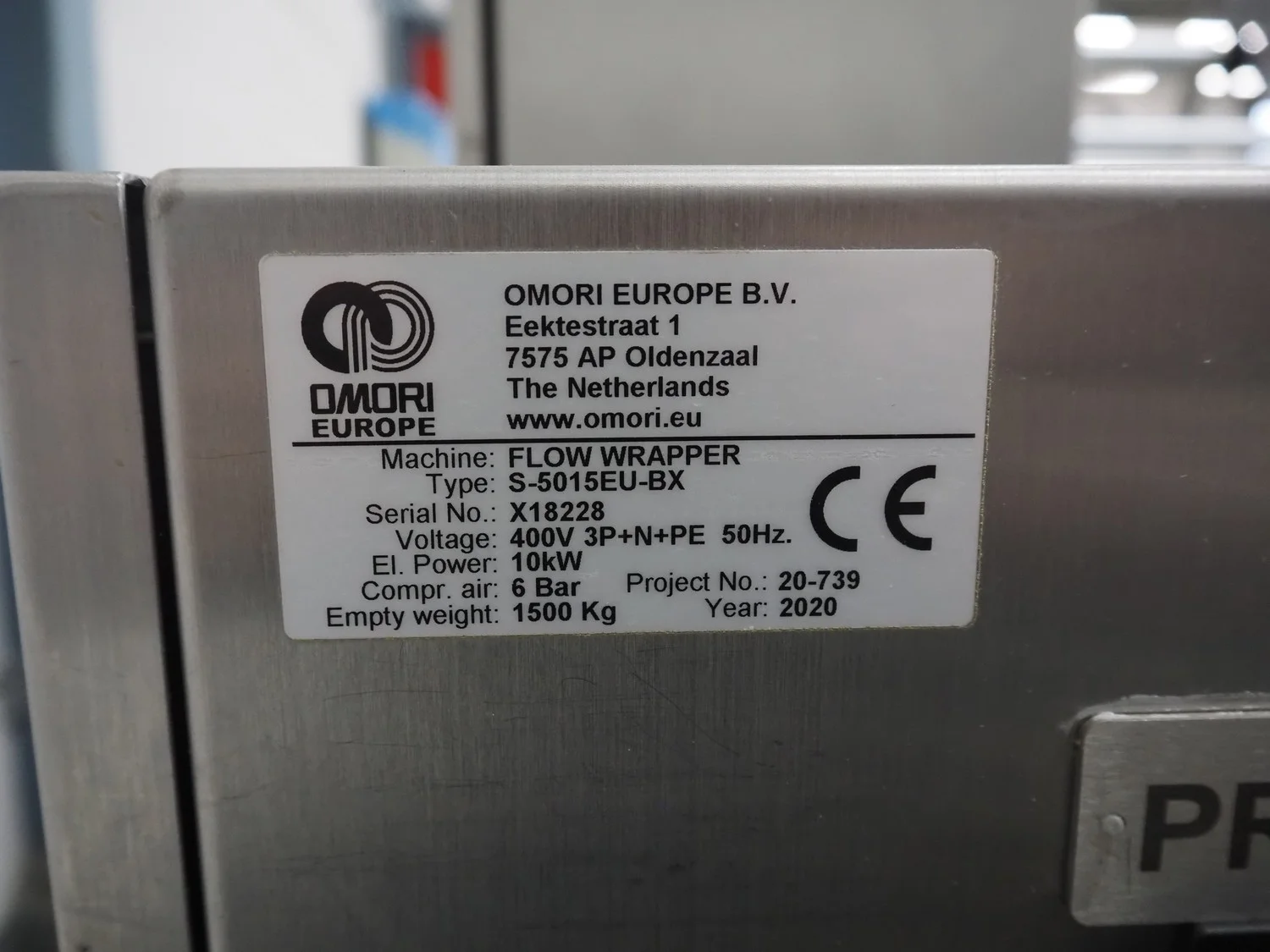 Omori Europe B.V. flowpacker, type: S-5015EU-BX, serial number: X18228, year of construction: 2020, 400 V, 3 Ph, 50 Hz, 10 kW, weight: 1500 kg, seal length: 250 mm, plastic outfeed belt, belt width: 180 mm, total dimensions: 3900 mm x 1100 mm x 1850 mm.