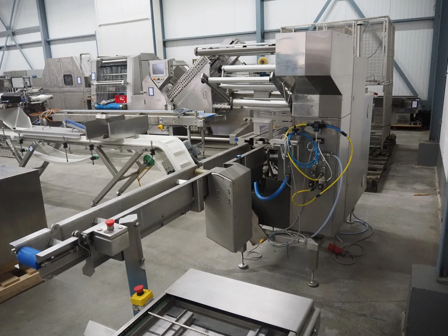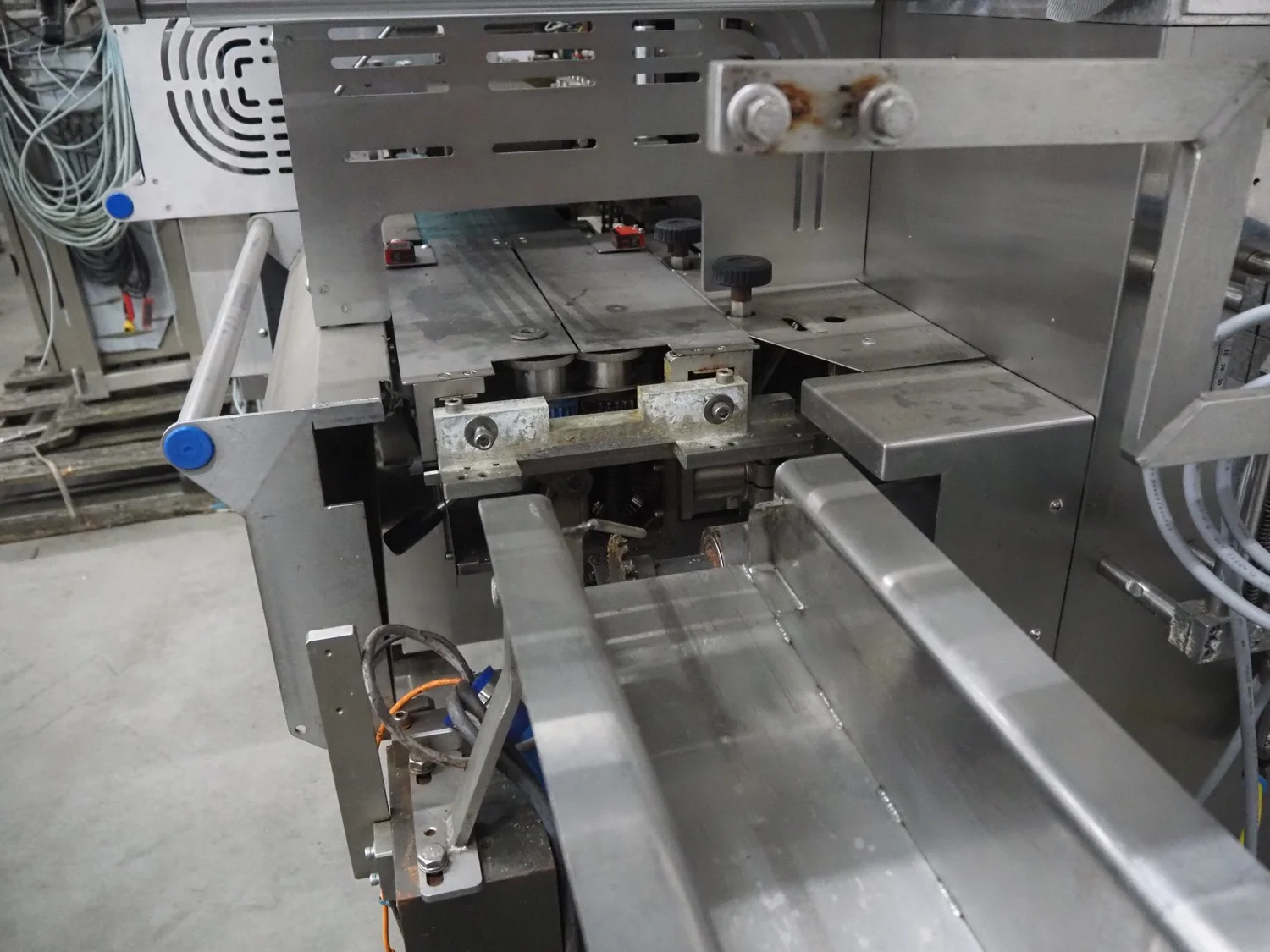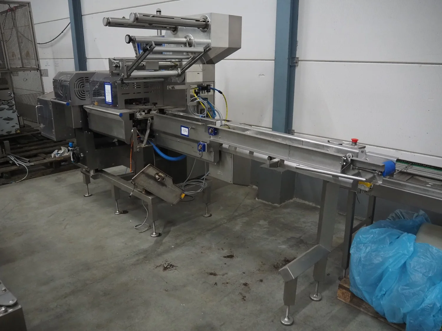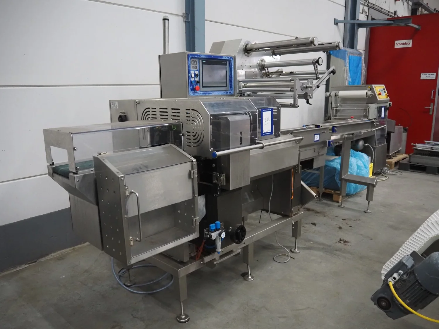 Omori Europe B.V. flowpacker, type: S-5015EU-BX, serial number: X18228, year of construction: 2020, 400 V, 3 Ph, 50 Hz, 10 kW, weight: 1500 kg, seal length: 250 mm, plastic outfeed belt, belt width: 180 mm, total dimensions: 3900 mm x 1100 mm x 1850 mm.