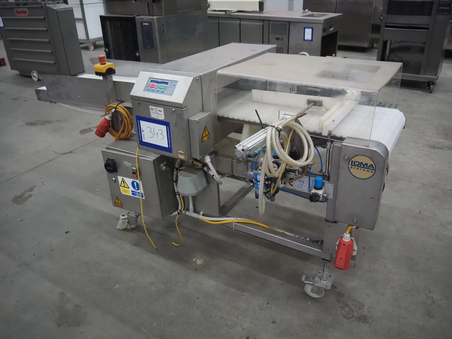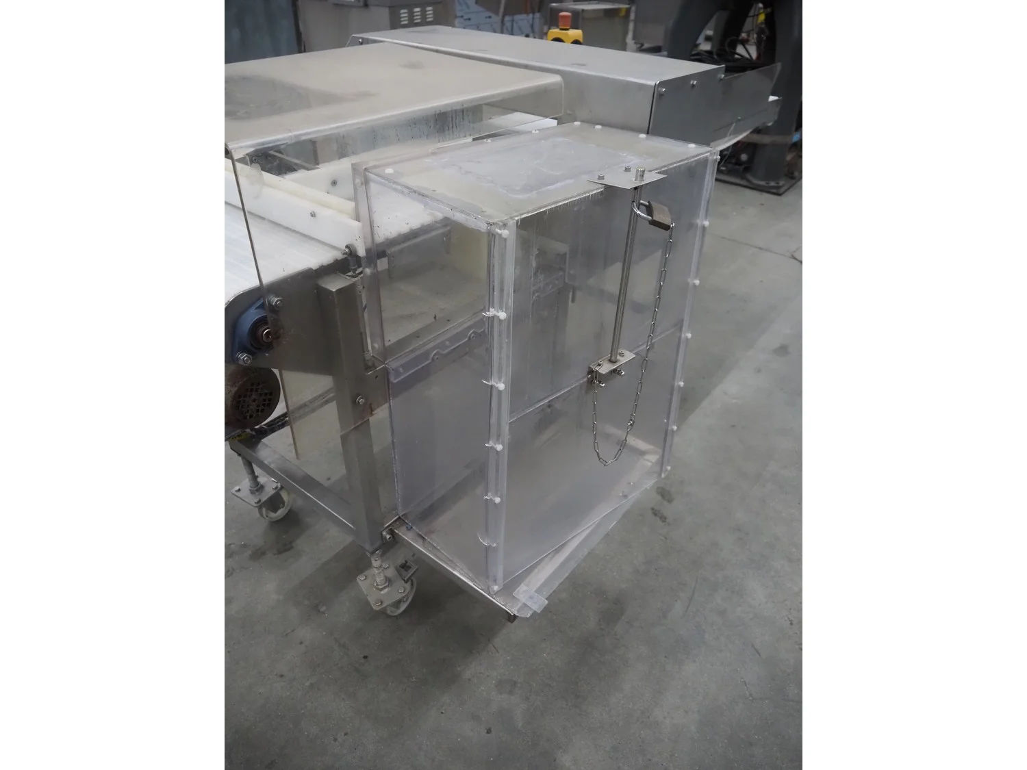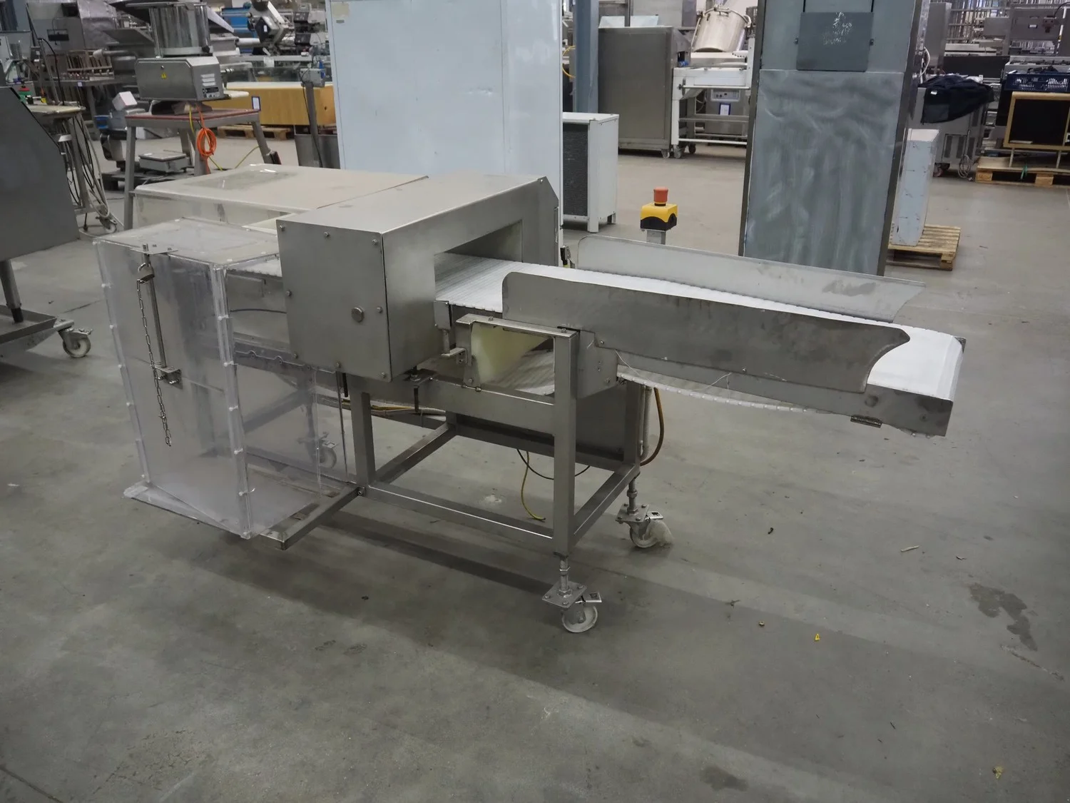 Loma Systems mobile metal detector with rejector, year of construction: 1997, plastic mesh belt, belt width: 400 mm, clearance: 450 mm x 120 mm, total dimensions: 2200 mm x 1200 mm x 1100 mm.