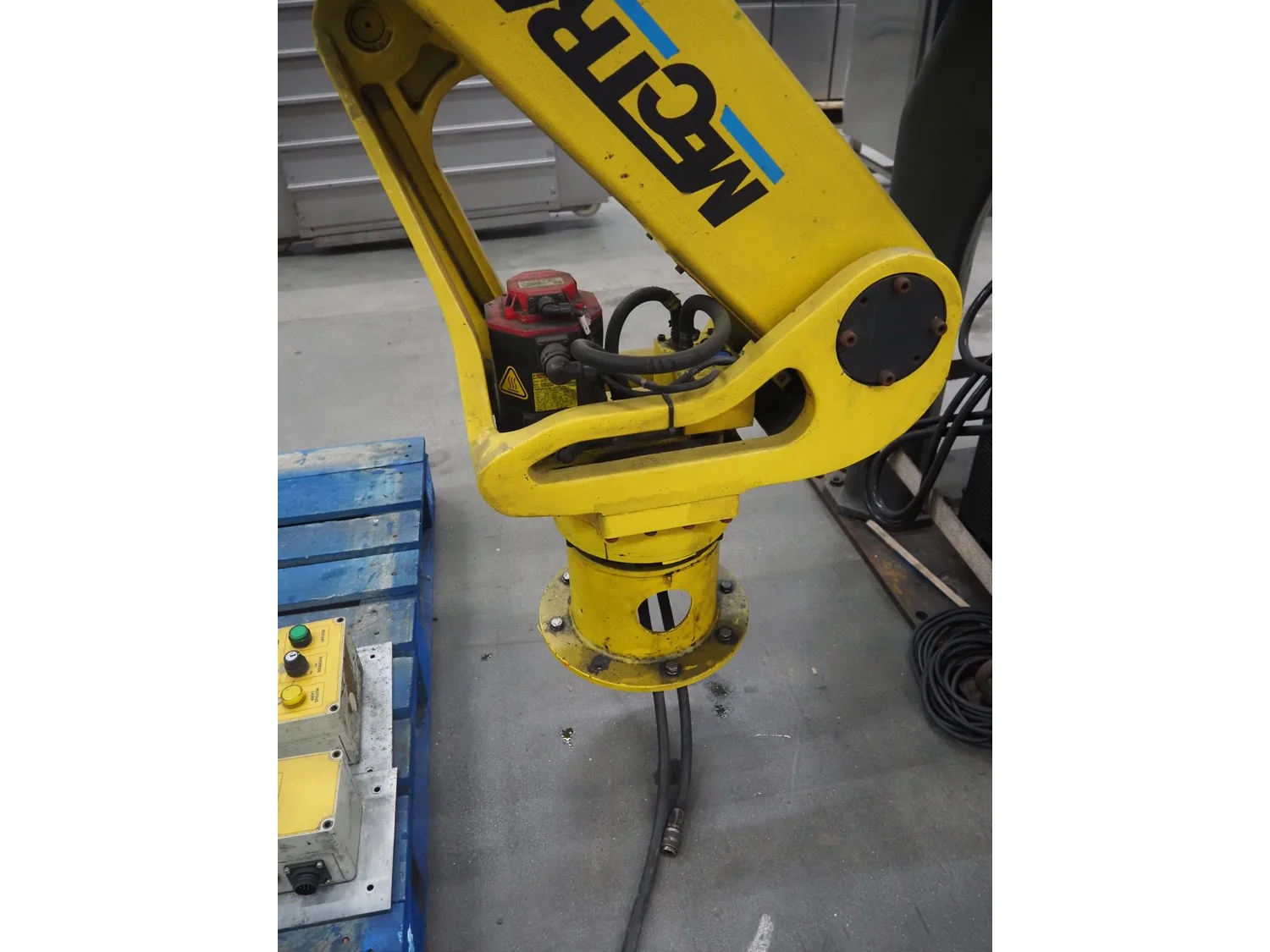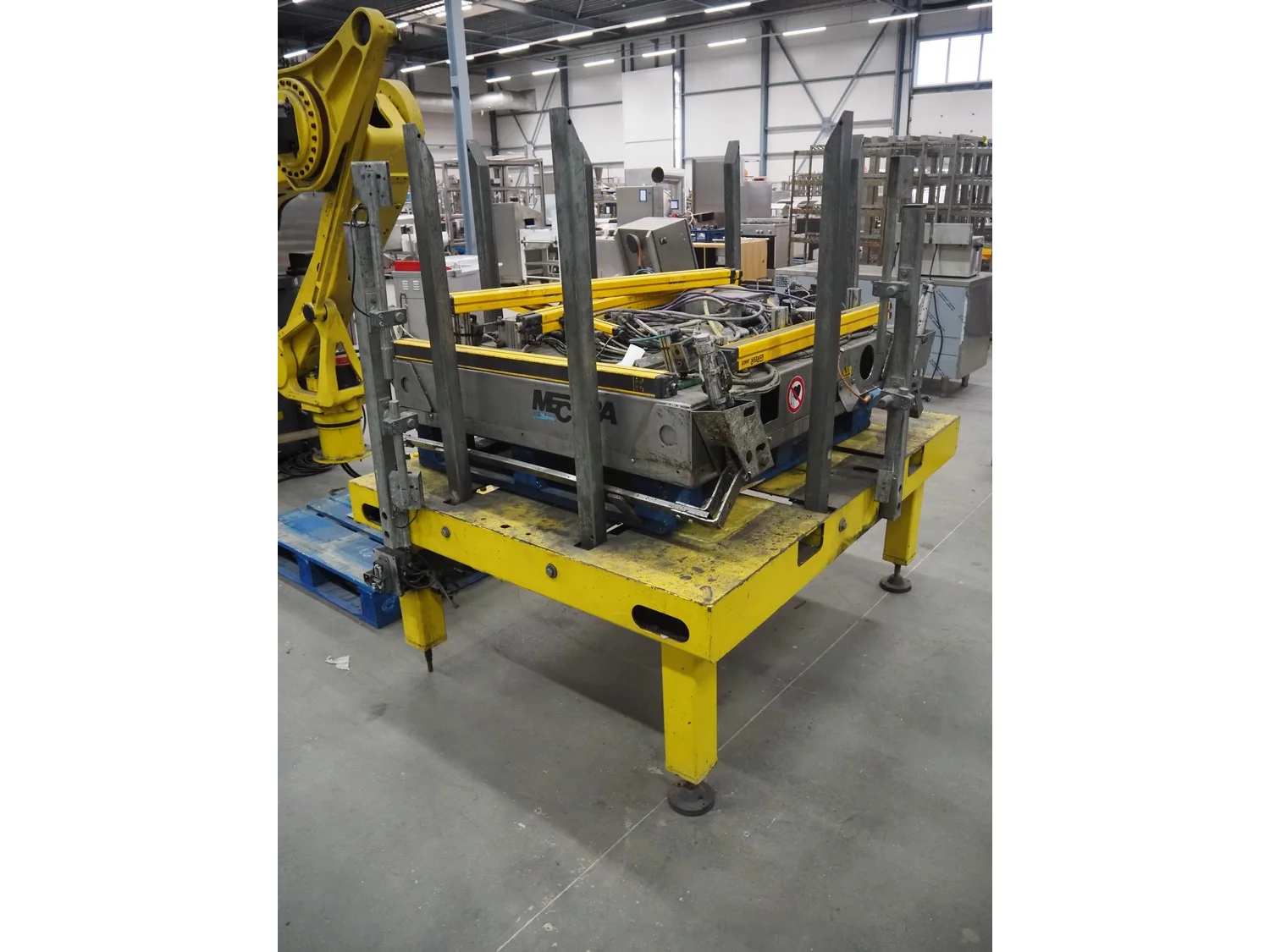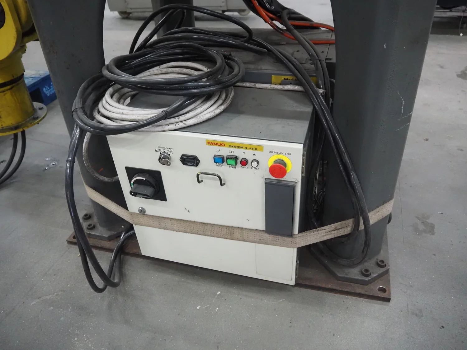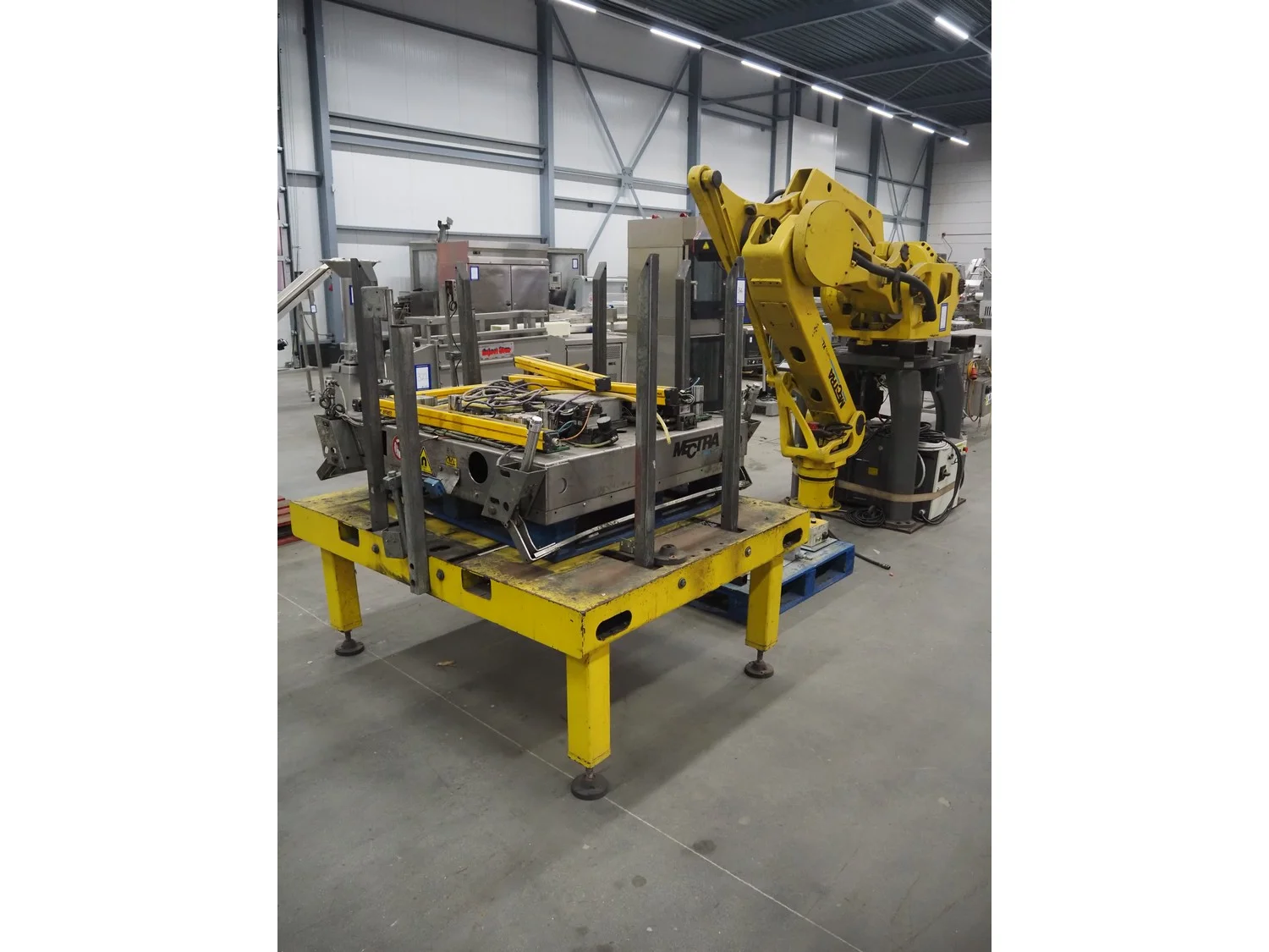 Fanuc palletizing robot with part for palletising system, pallet size: 1200 mm x 1000 mm x 145 mm, system: R-J3IC, type robot: A05B-2513-B010. dimensions robot: 2950 mm x 1200 mm x 2290 mm.