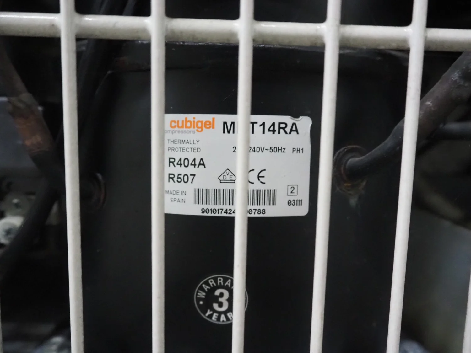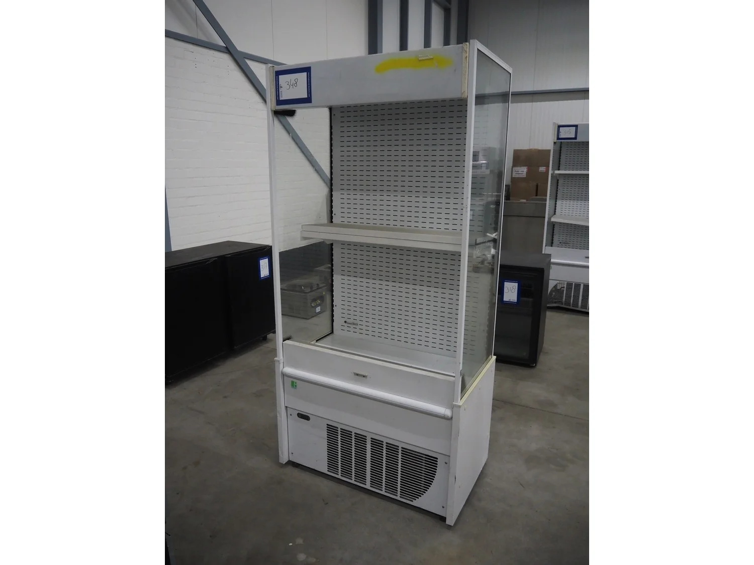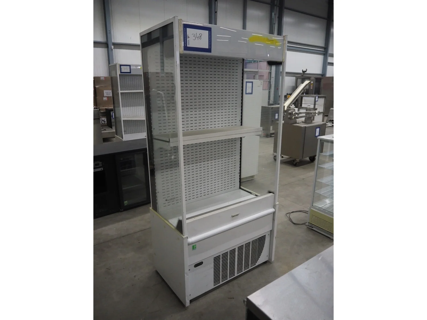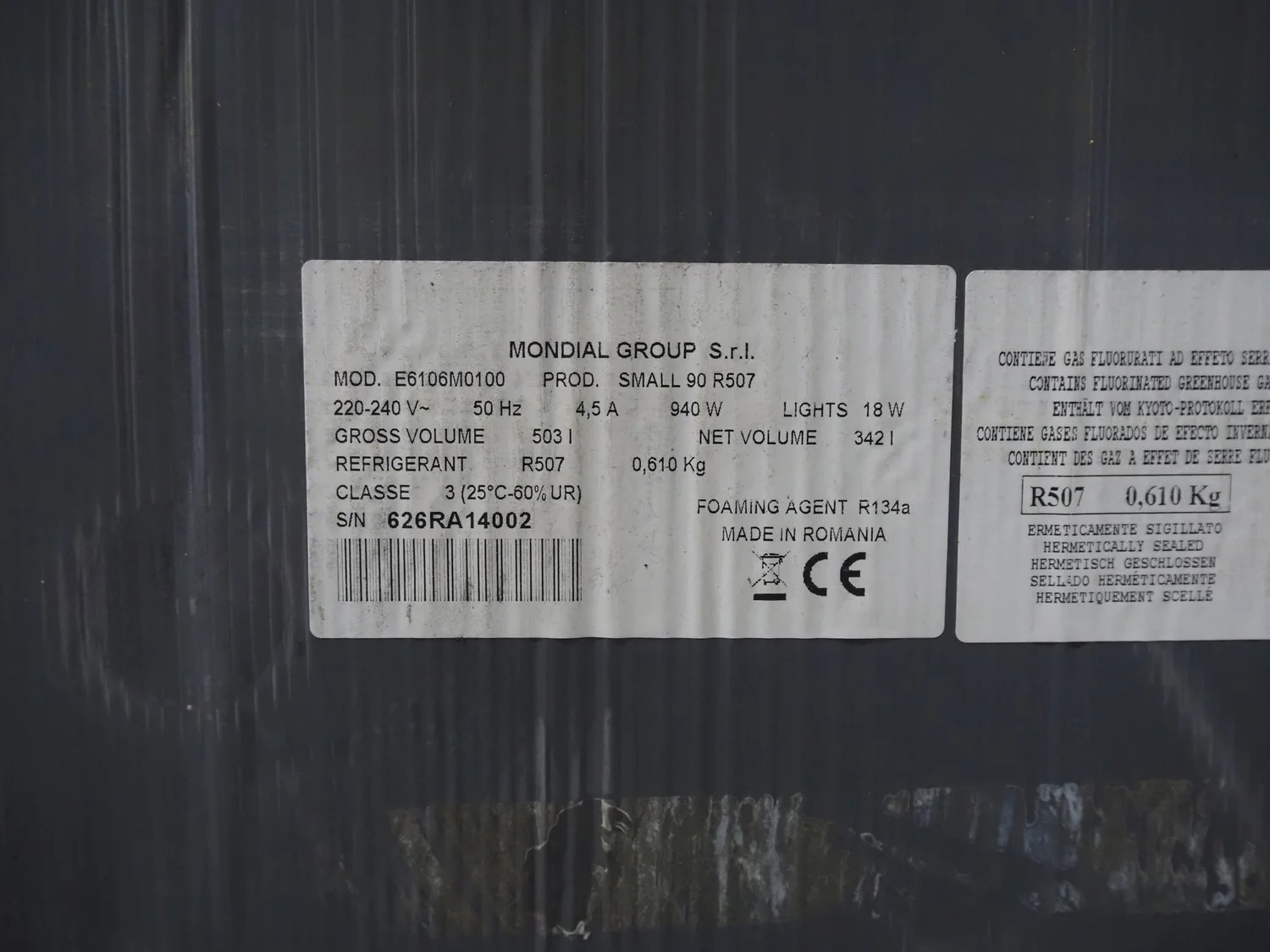 Mondial Group S.r.l. refrigerated showcase, type: E6106M0100, number: 626RA14002, 220/240 V, 50 Hz, 4.5 A, 940 W, refrigerant: R507, 2 floors, dimensions each floor: 285 mm x 900 mm, total dimensions: 600 mm x 980 mm x 2020 mm.