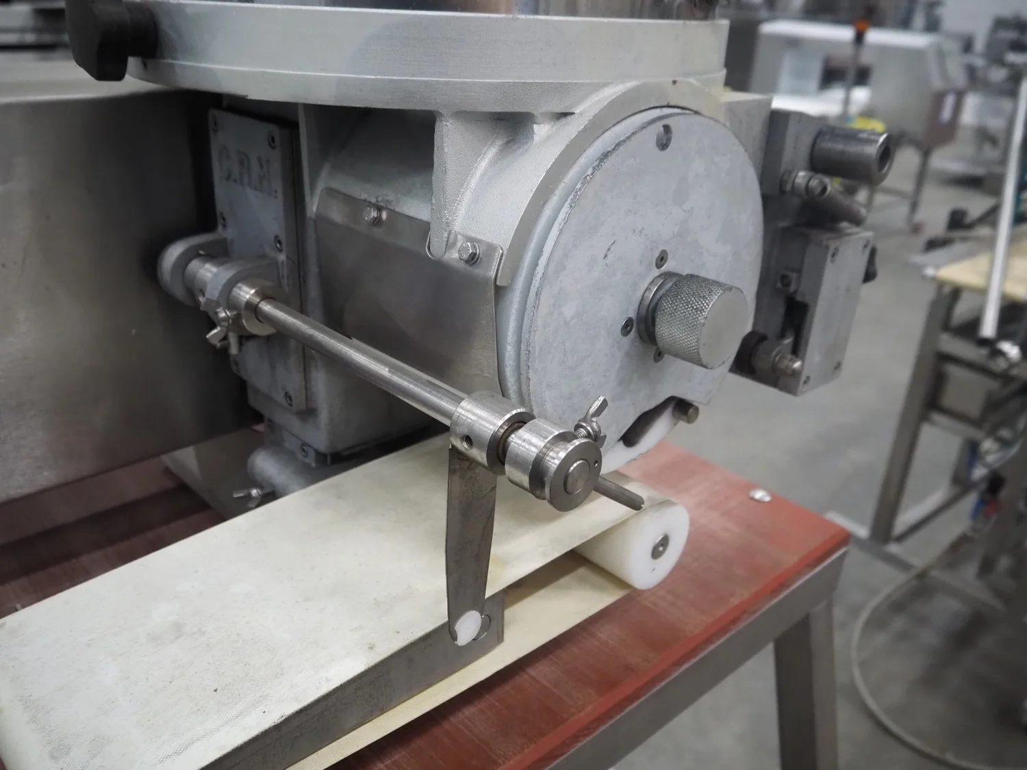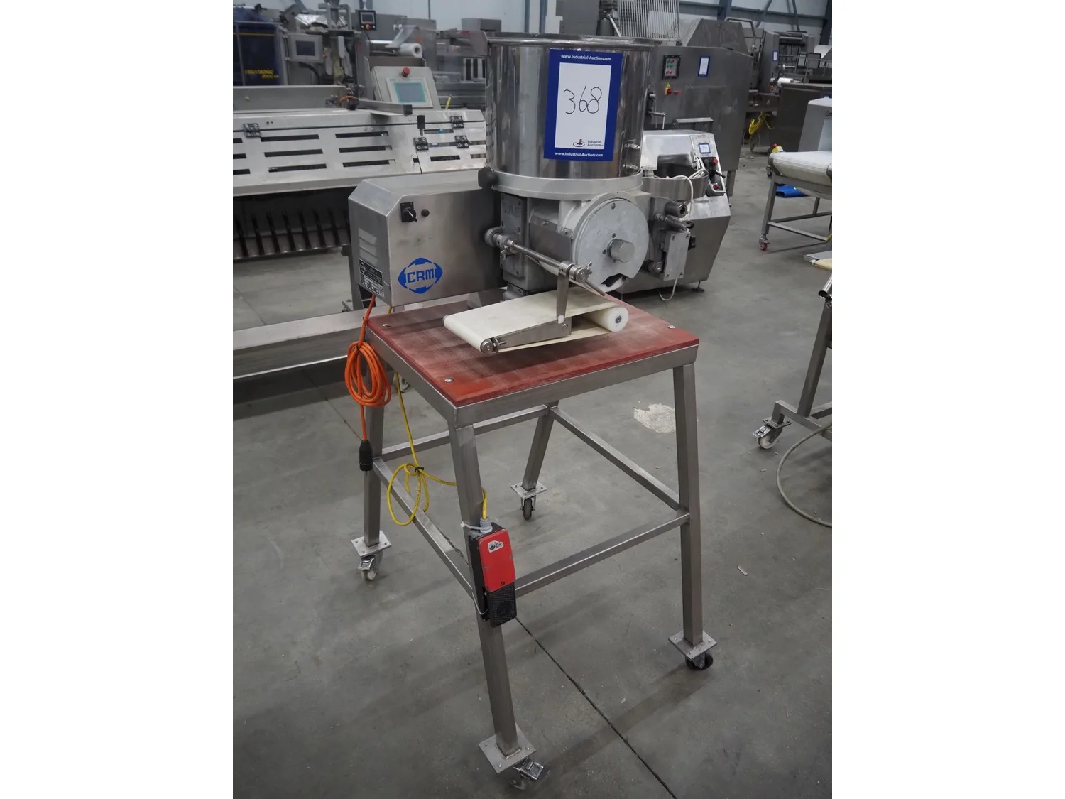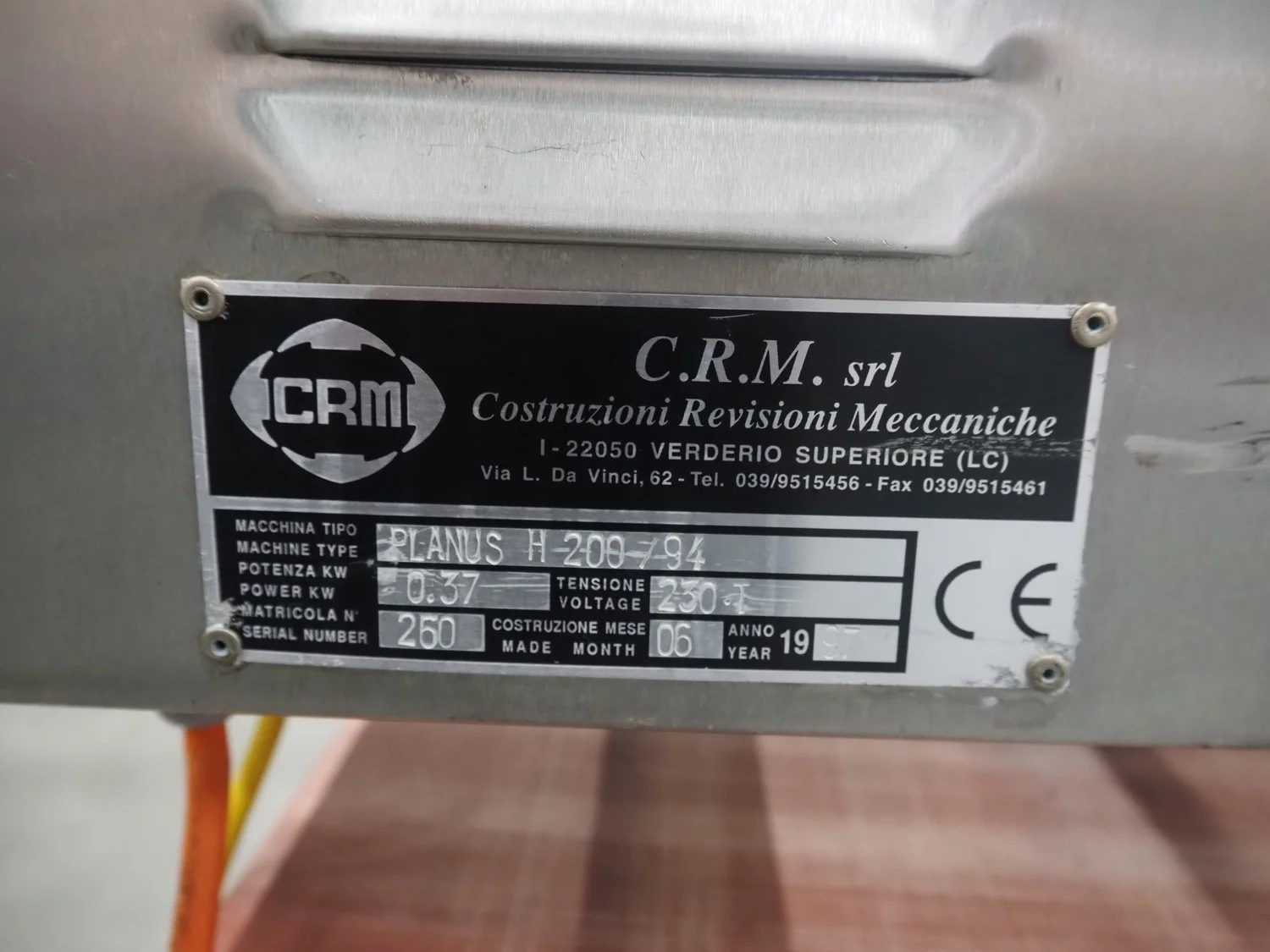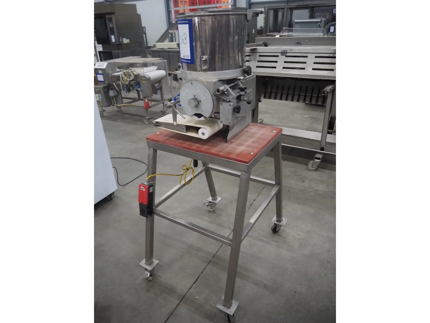 C.R.M. srl mobile hamburger forming machine on s/s trolley with plastic top, machine type: PLANUS H 200/94, serial number: 260, year of construction: 06-1997, 230 V, 0.37 kW, dye: 100 mm, belt width: 150 mm, total dimensions: 970 mm x 740 mm x 1630 mm.