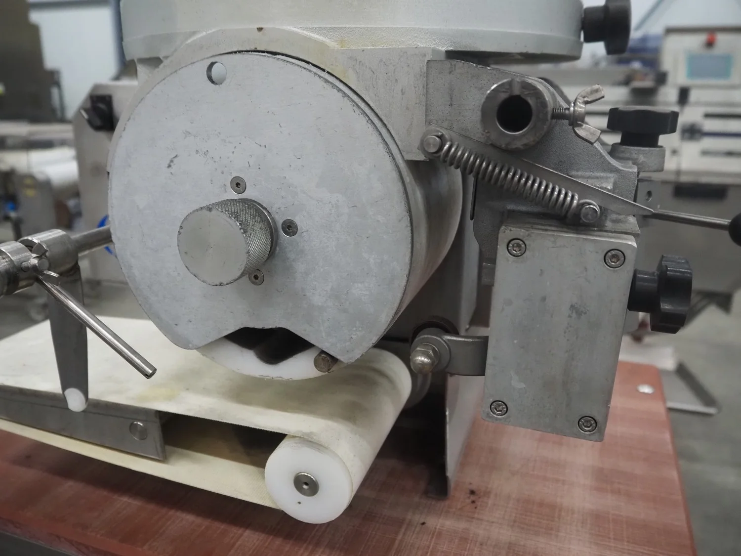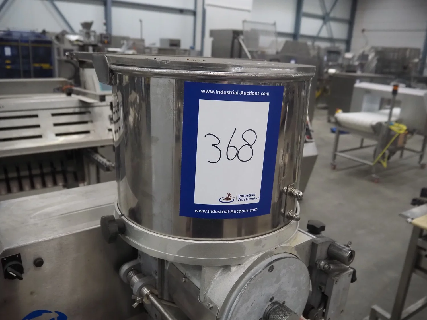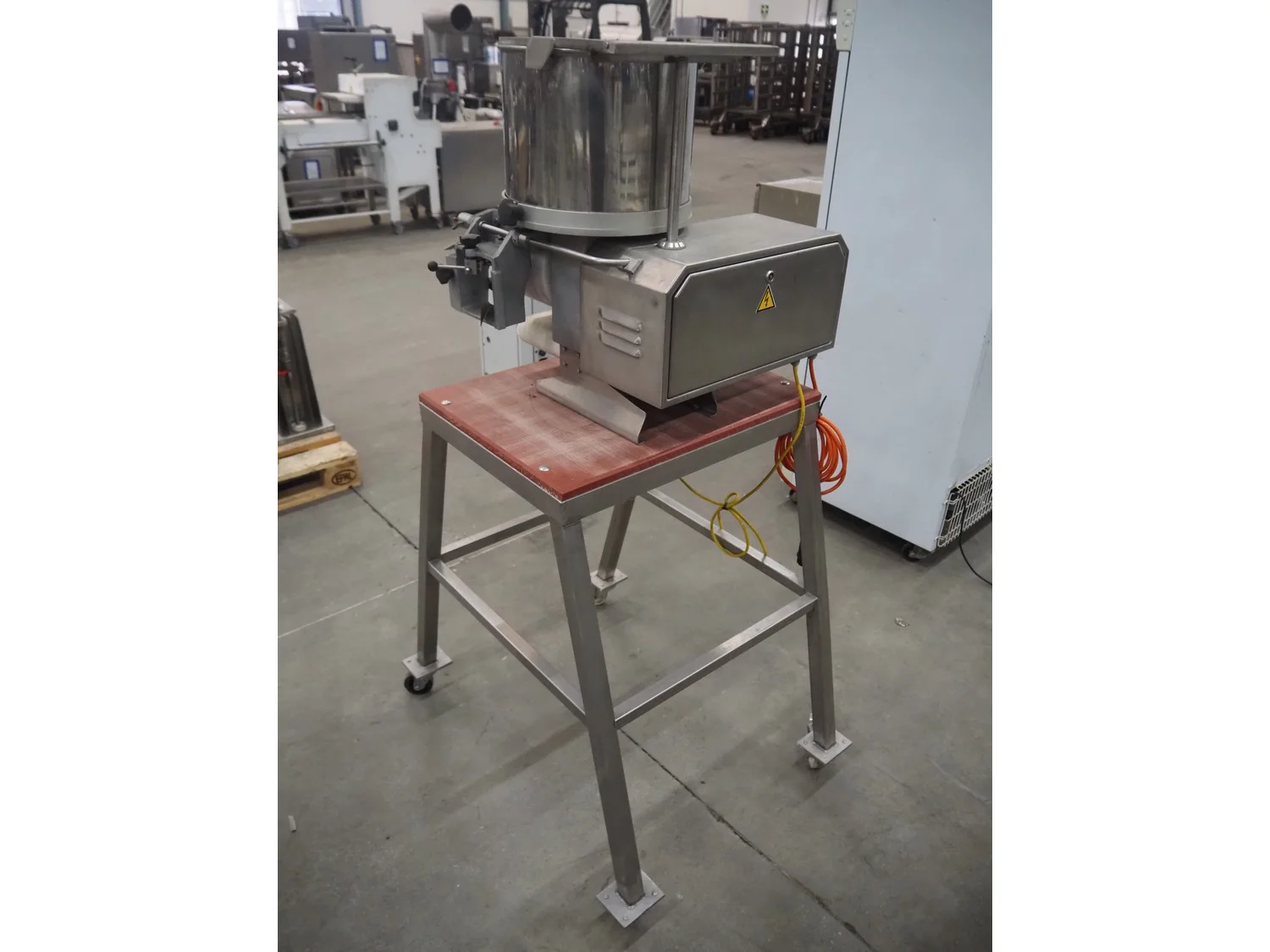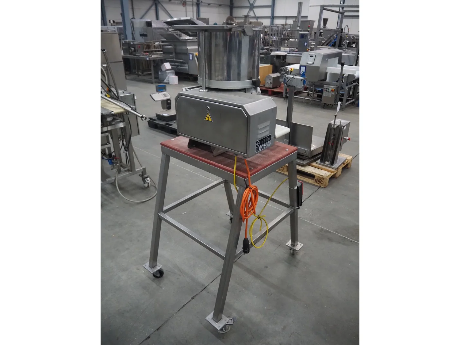 C.R.M. srl mobile hamburger forming machine on s/s trolley with plastic top, machine type: PLANUS H 200/94, serial number: 260, year of construction: 06-1997, 230 V, 0.37 kW, dye: 100 mm, belt width: 150 mm, total dimensions: 970 mm x 740 mm x 1630 mm.