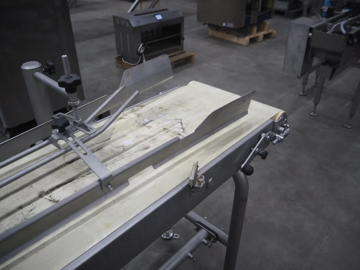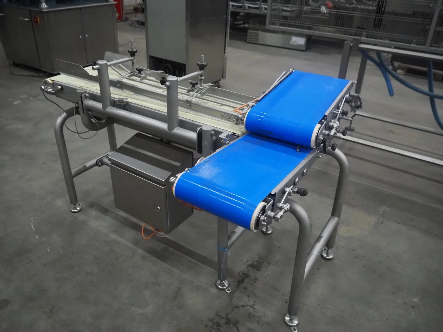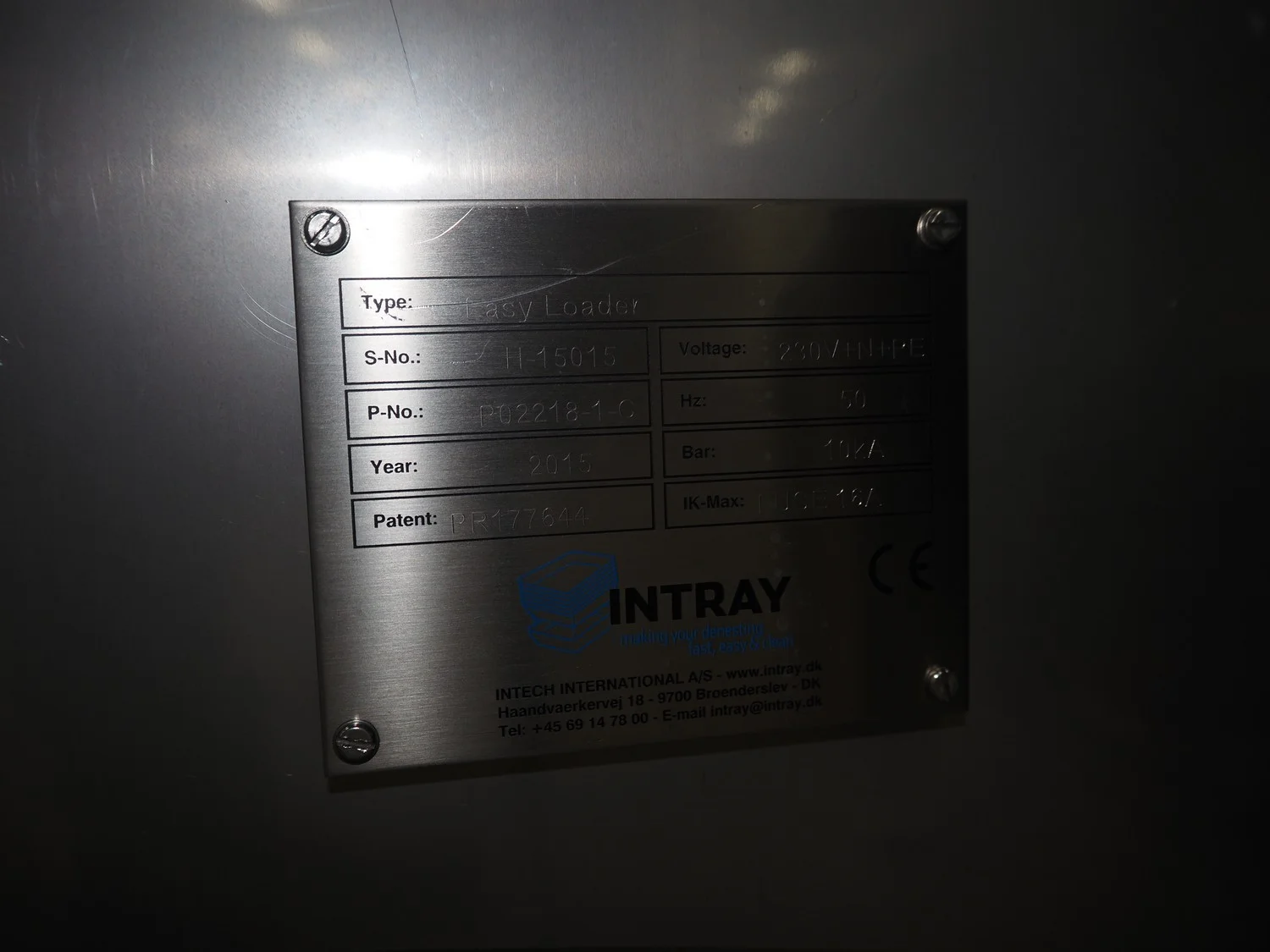 Intray placing belt, type: easy loader, serial number: H-15015, year of construction: 2015, 230 V, 50 Hz, s/s frame, plastic belt, belt width: 370 mm and 375 mm, total dimensions: 1750 mm x 950 mm x 1080 mm.