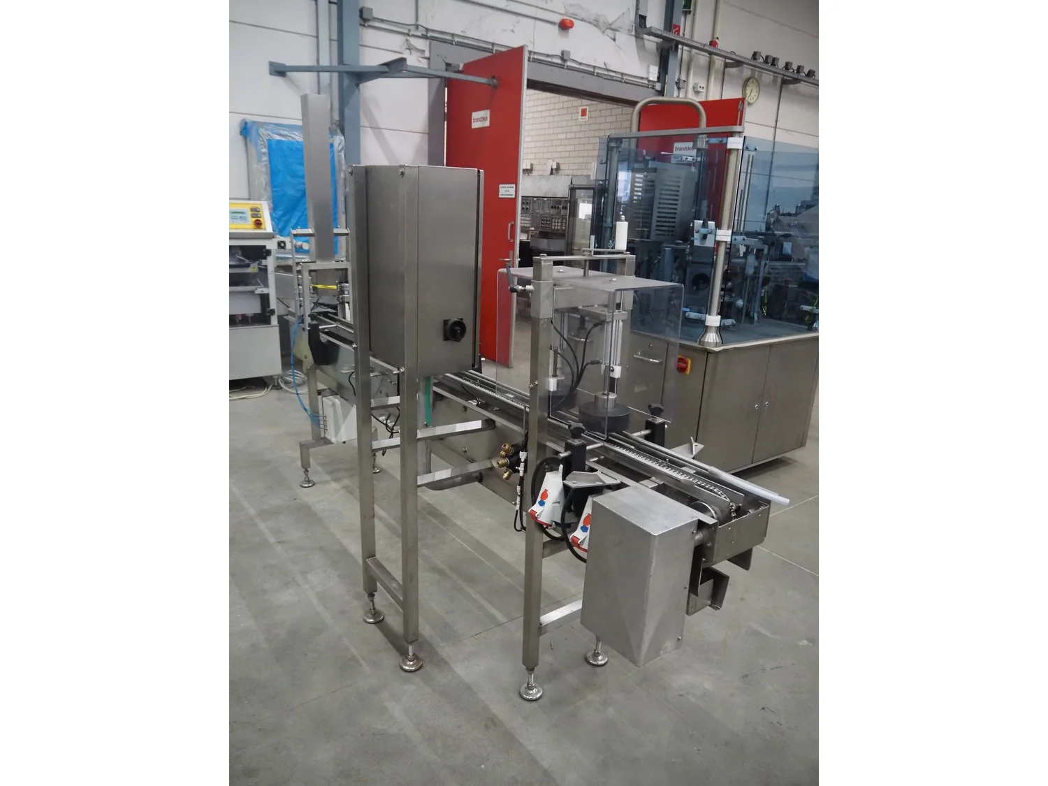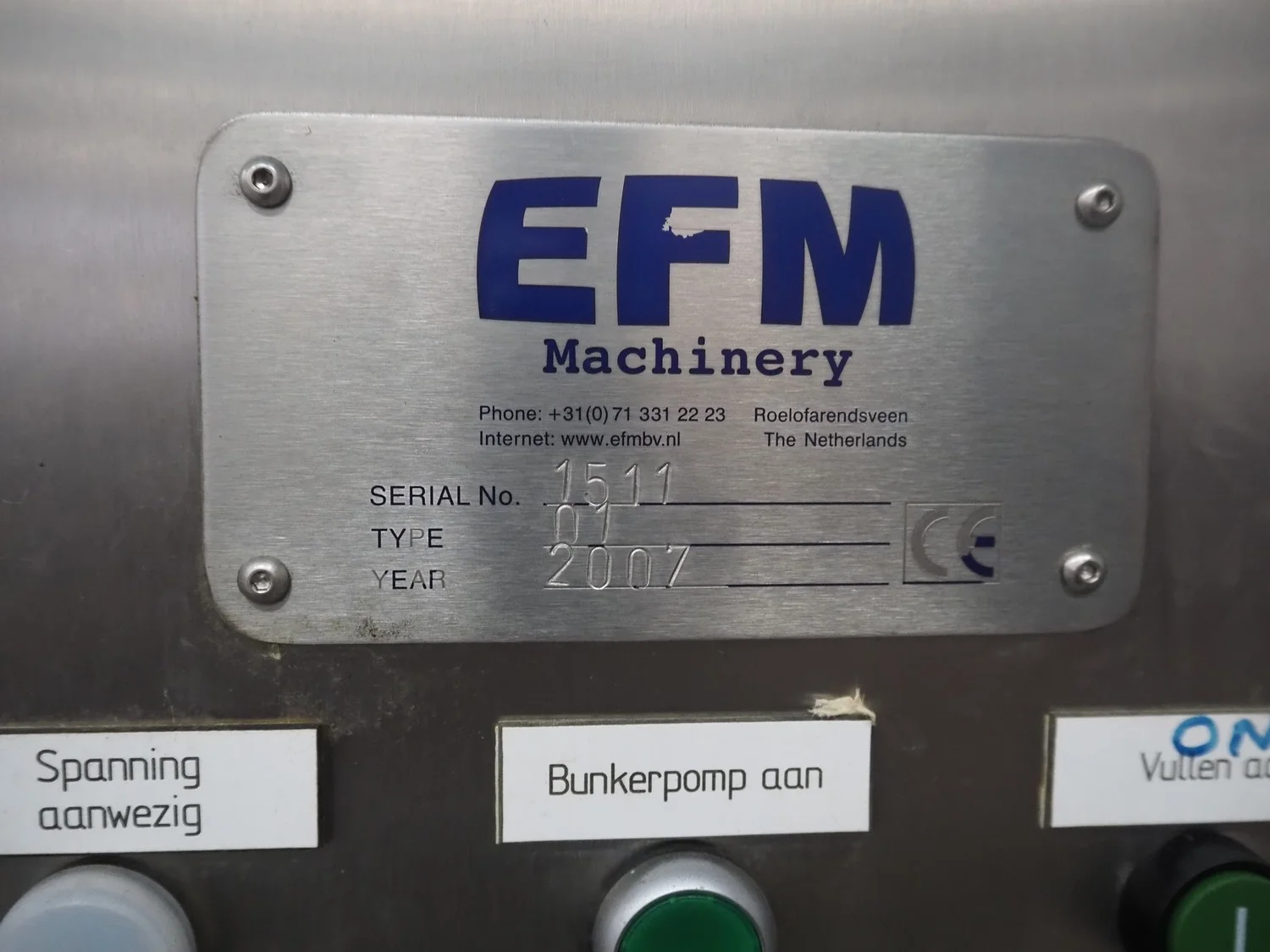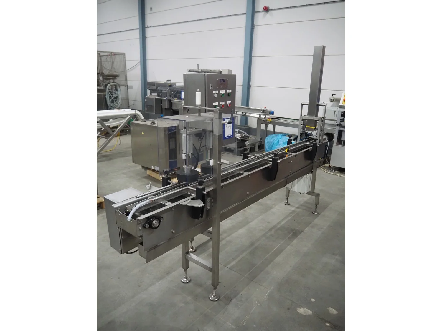 EFM machinery filling and lid closing machine, type: 01, serial number: 1511, year of construction: 2007, chain belt, belt width: 40 mm, lid diameter: 80 mm, total dimensions: 3100 mm x 750 mm x 2050 mm.