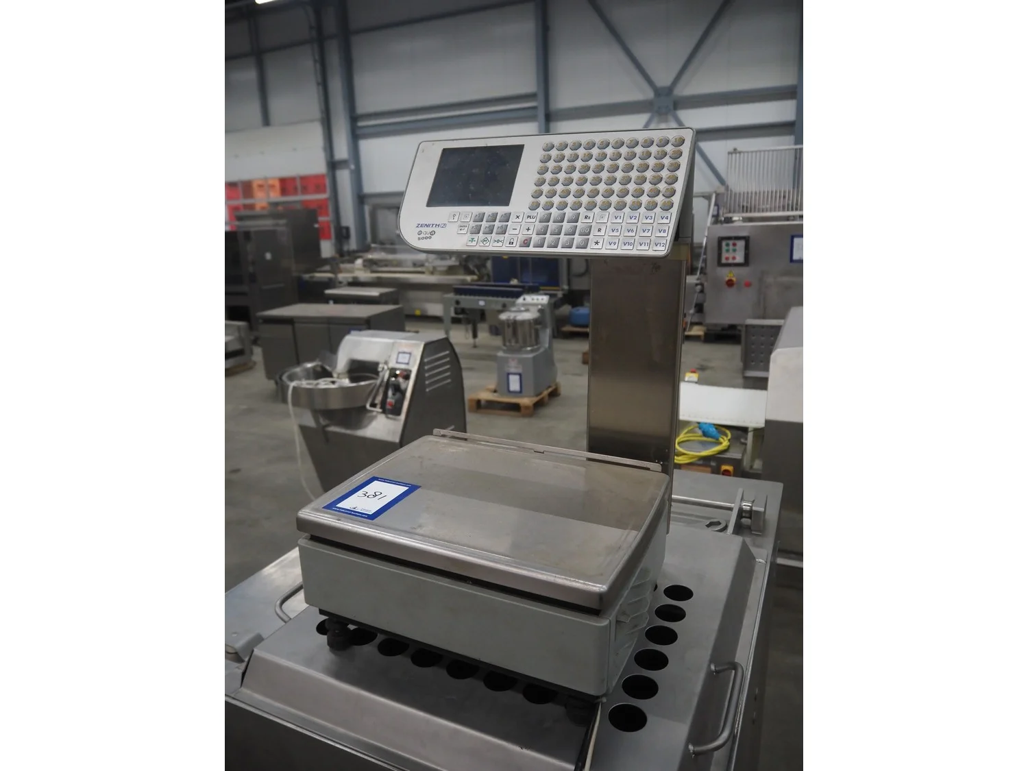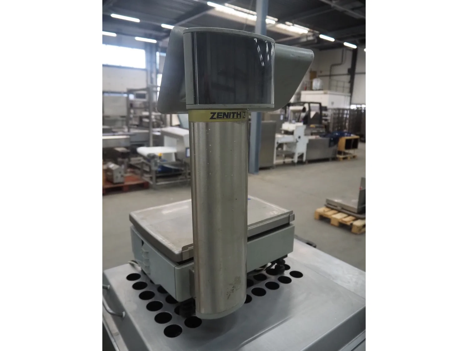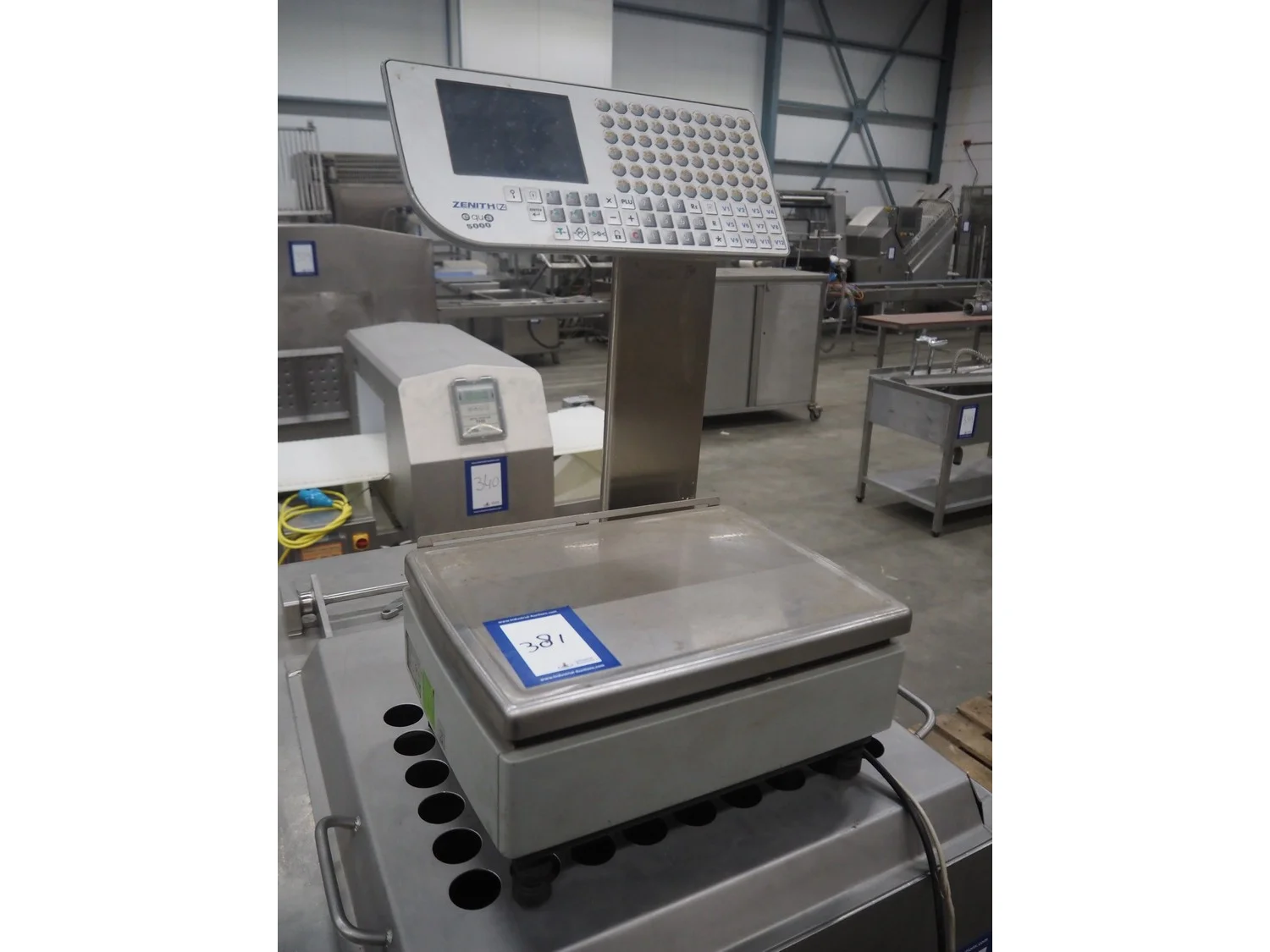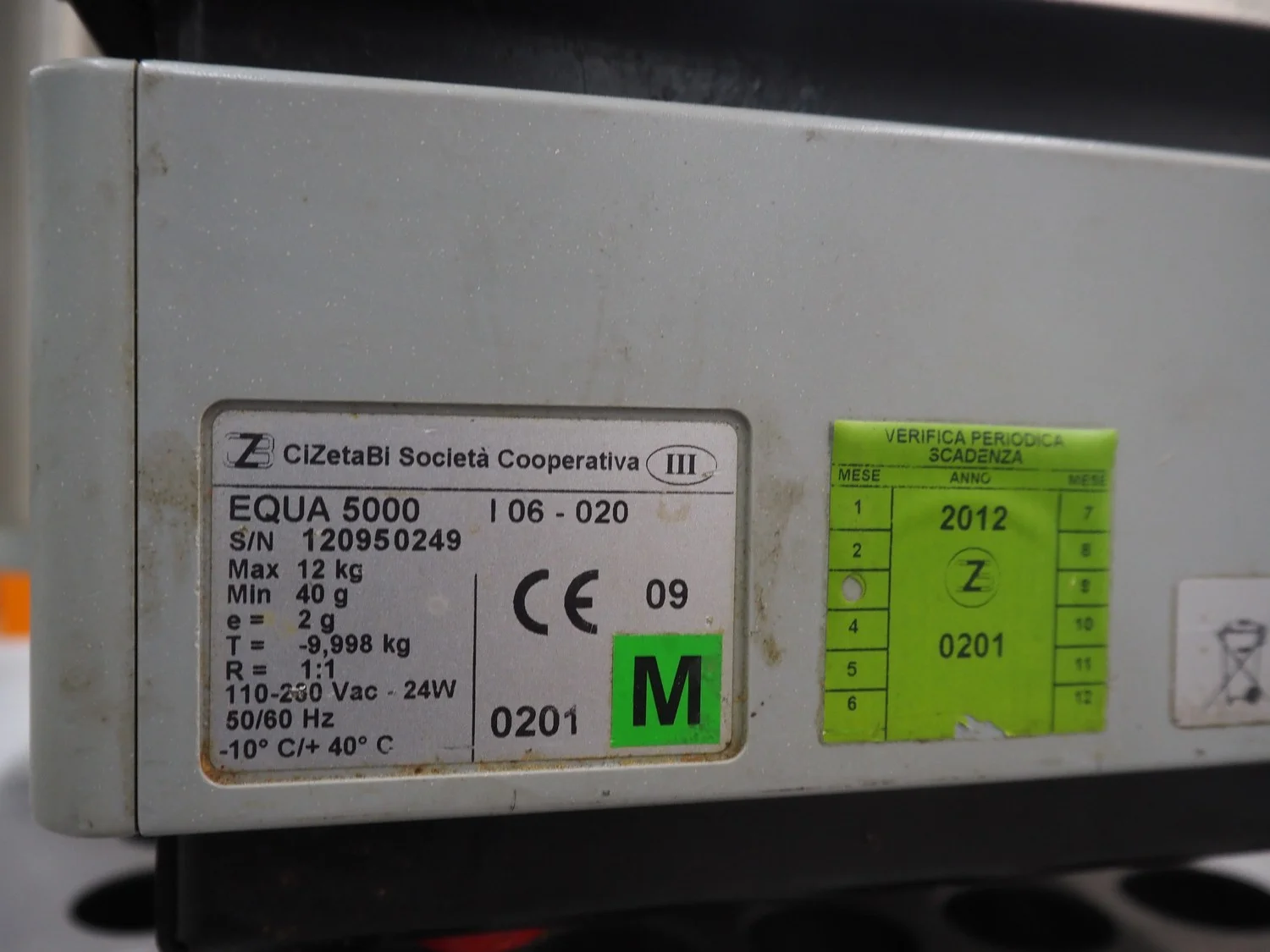 CZB weighing scale with label printer, model: EQUA 5000, serial number: 120950249, 110/230 V, 50/60 Hz, 24 W, maximum capacity: 12 kg, minimum capacity: 40 g, e= 2 g, T = -9.998 kg, dimensions: 500 mm x 360 mm x 480 mm.