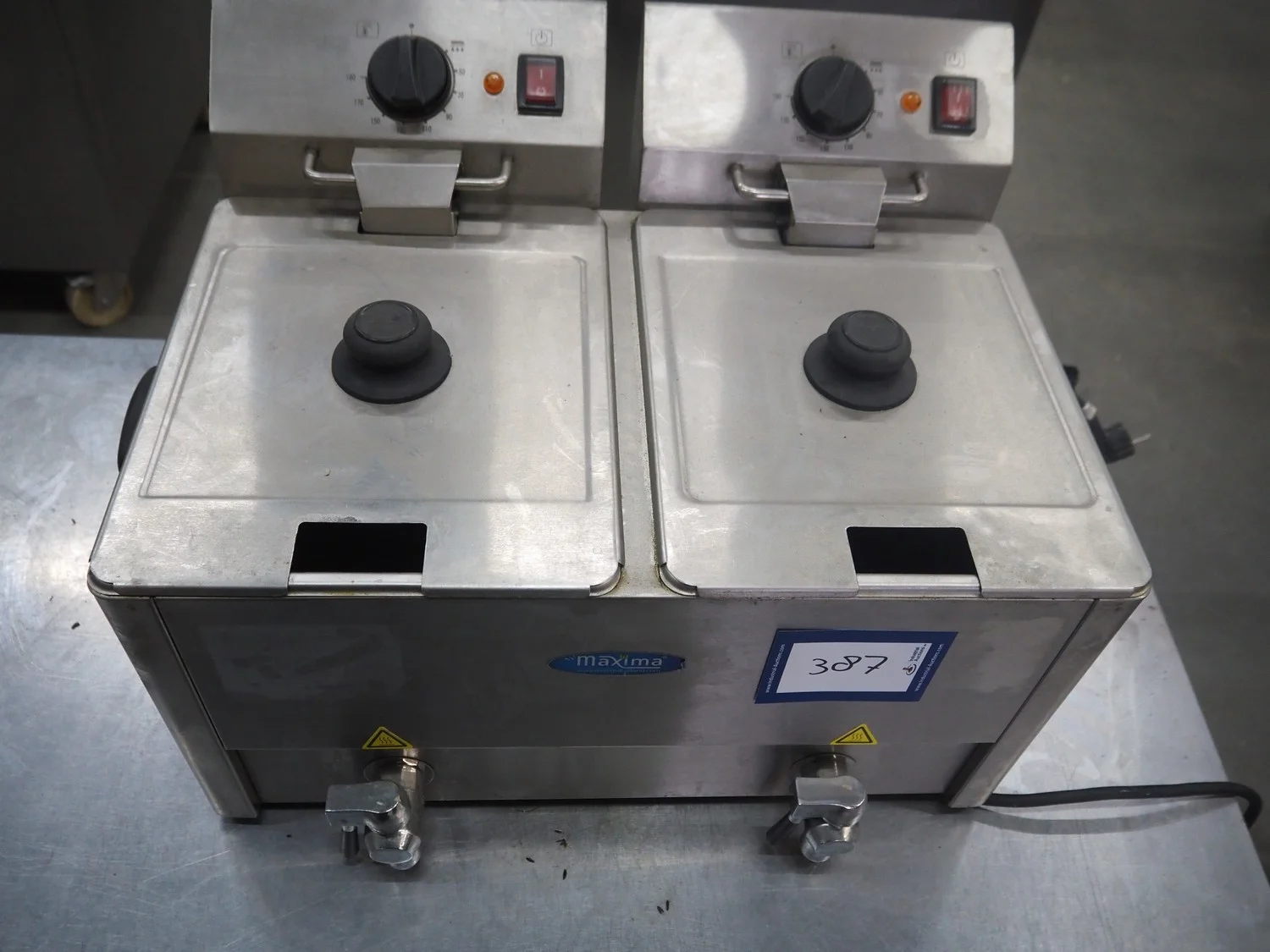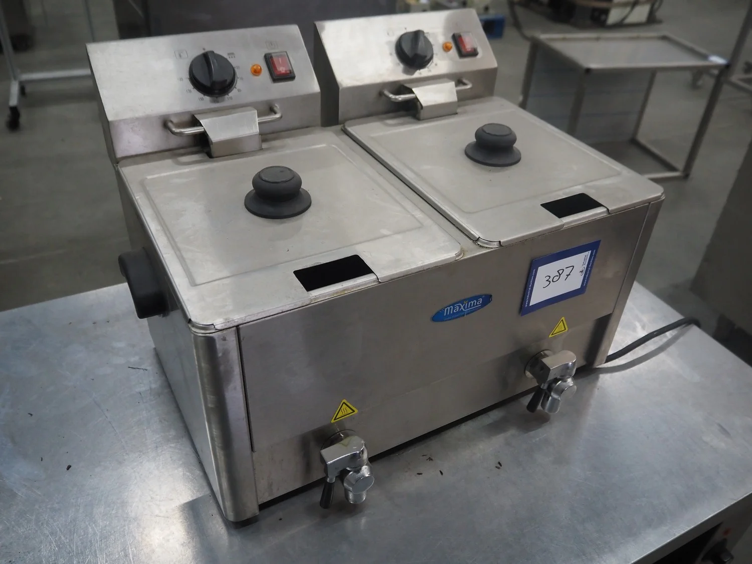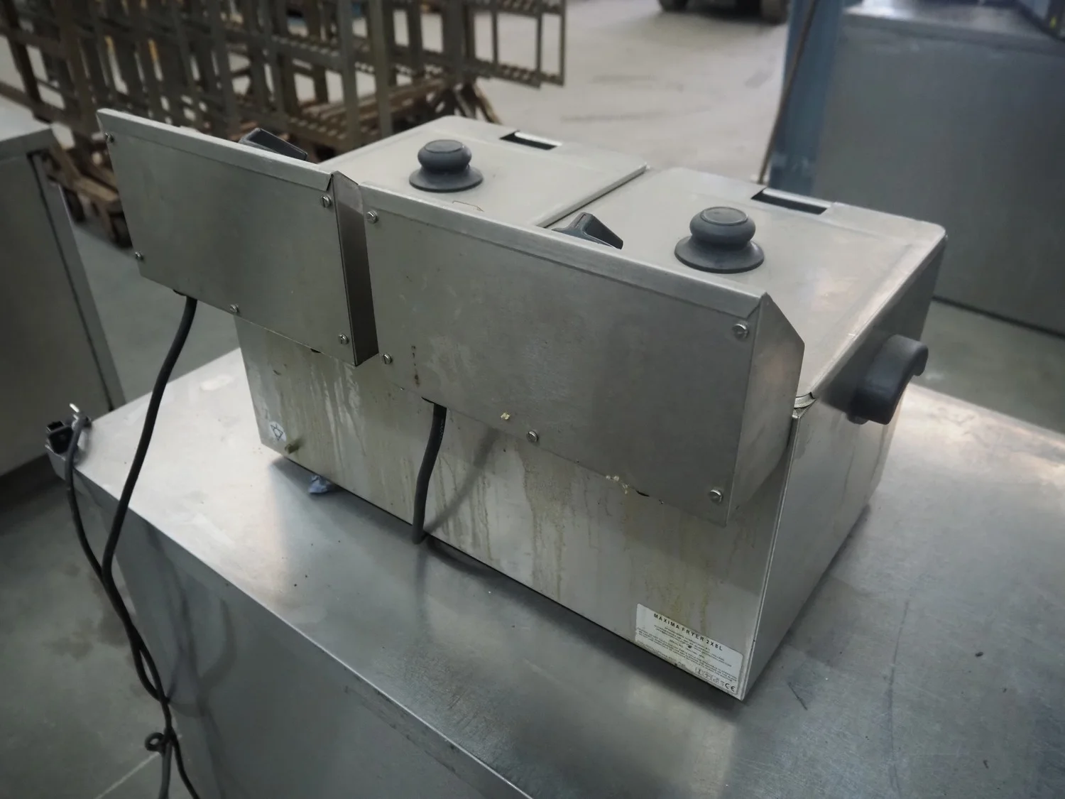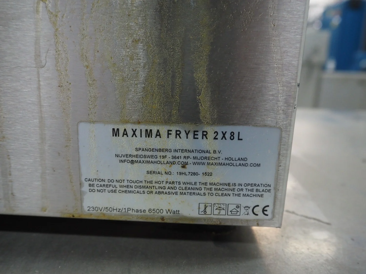 Maxima double fryer, 230 V, 1 Ph, 50 Hz, 6500 Watt, volume: (2x) 8 liter, dimensions: 600 mm x 450 mm x 400 mm.