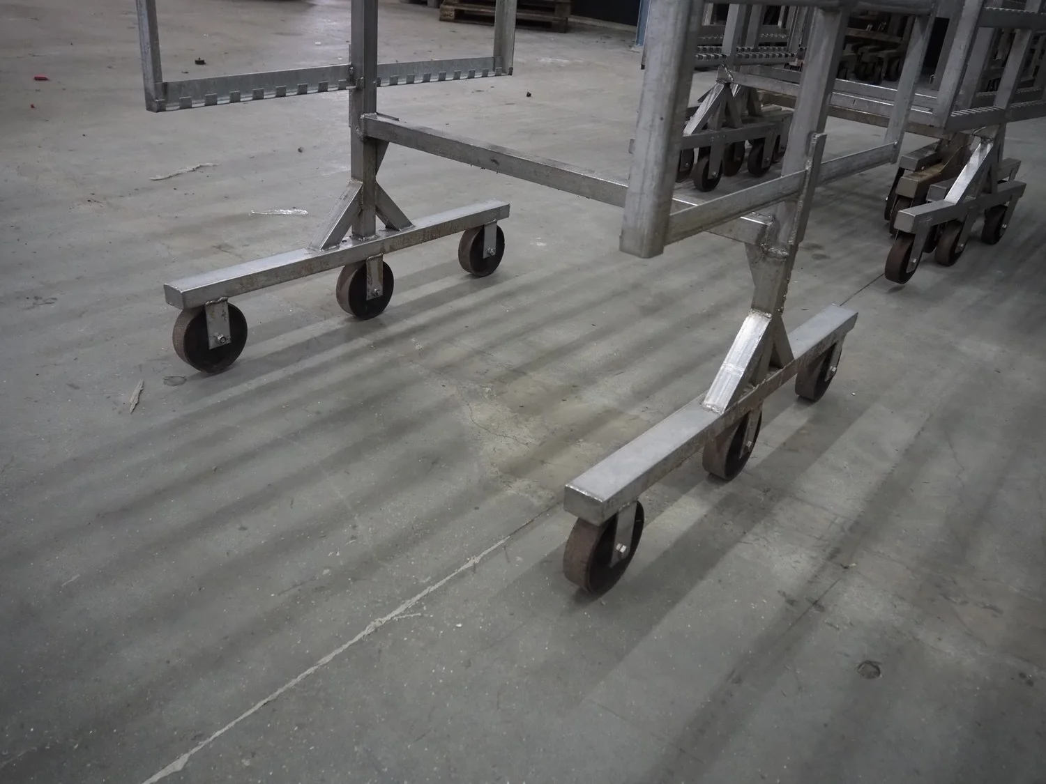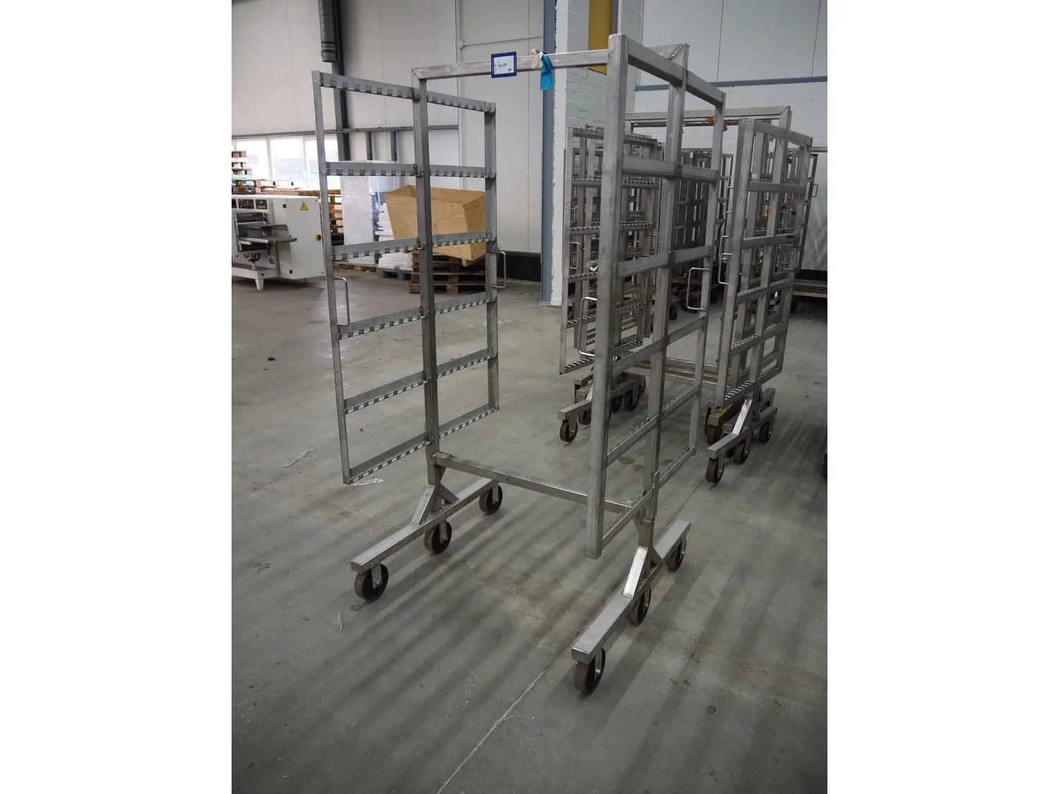 5 s/s smoke trolleys, 6 floors, floor dimensions: 1010 mm x 1000 mm, total dimensions: (5x) 1020 mm x 1000 mm x 1980 mm.
