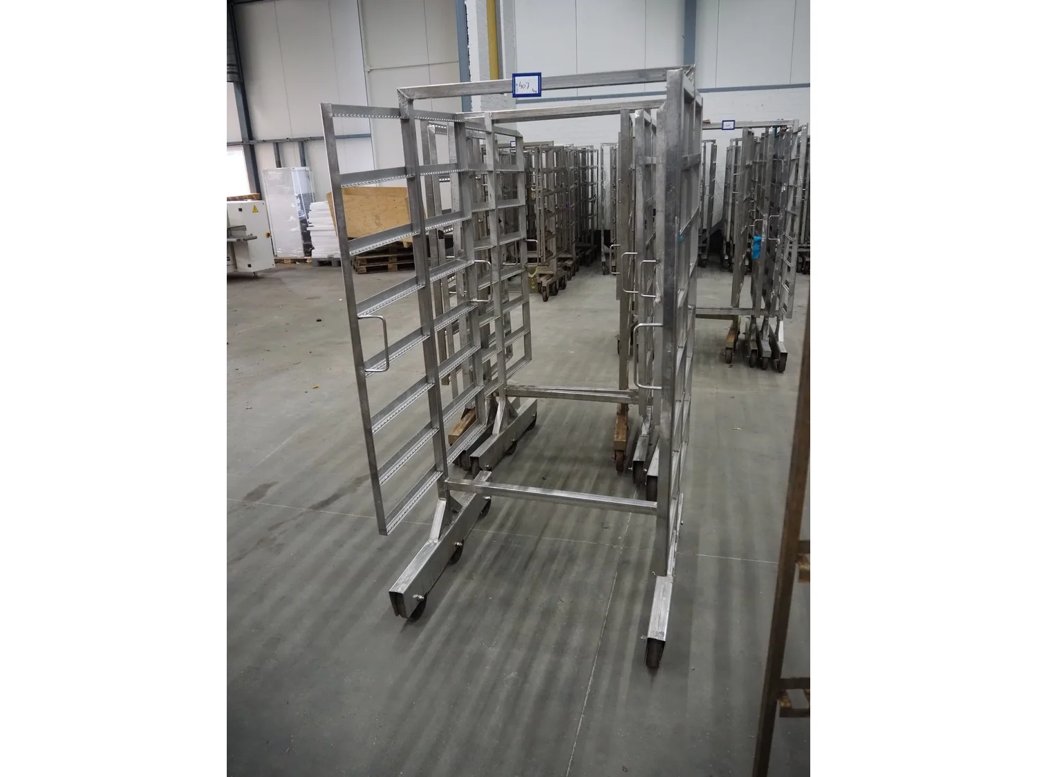 4 s/s smoke trolleys, 8 floors, floor dimensions: 1010 mm x 1000 mm, total dimensions: (4x) 1020 mm x 1000 mm x 1960 mm.