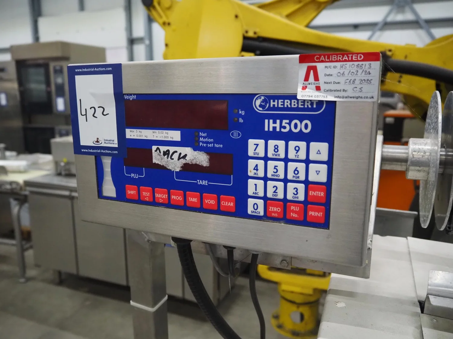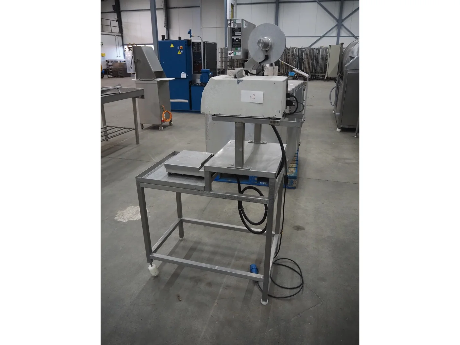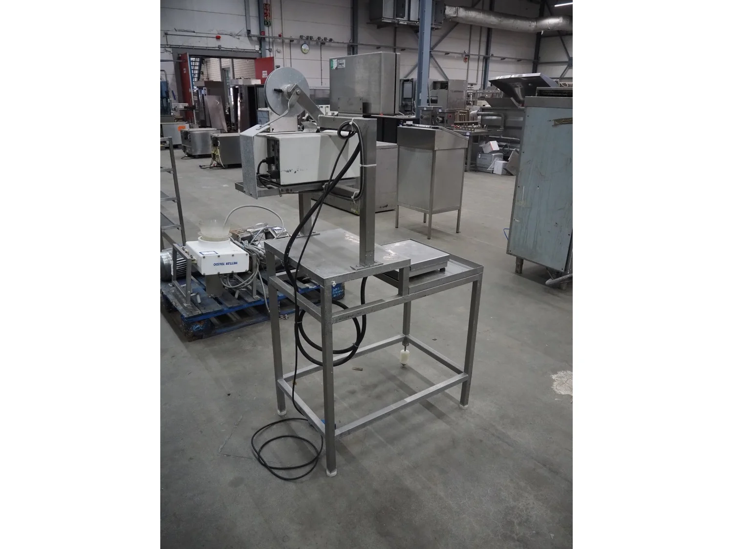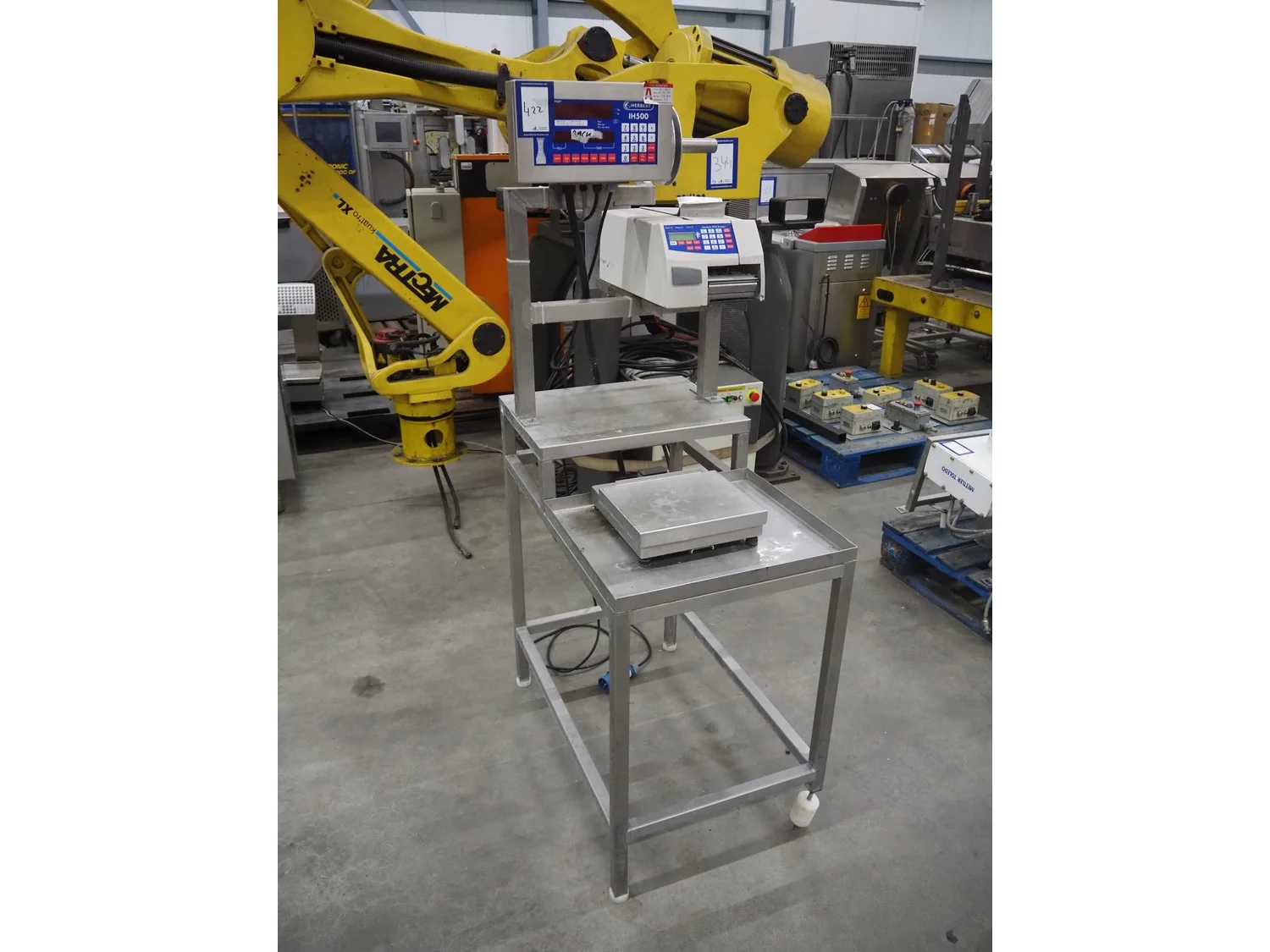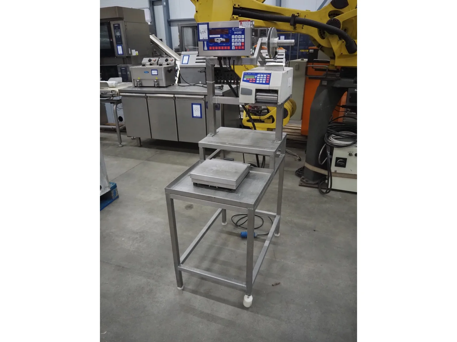 Herbert weighing machine with labeller, type: IH500, maximum: 3 kg, minimum weight: 0.02 kg, e= 0.001 kg, T = -1.000 kg, dimensions: 900 mm x 550 mm x 1600 mm.