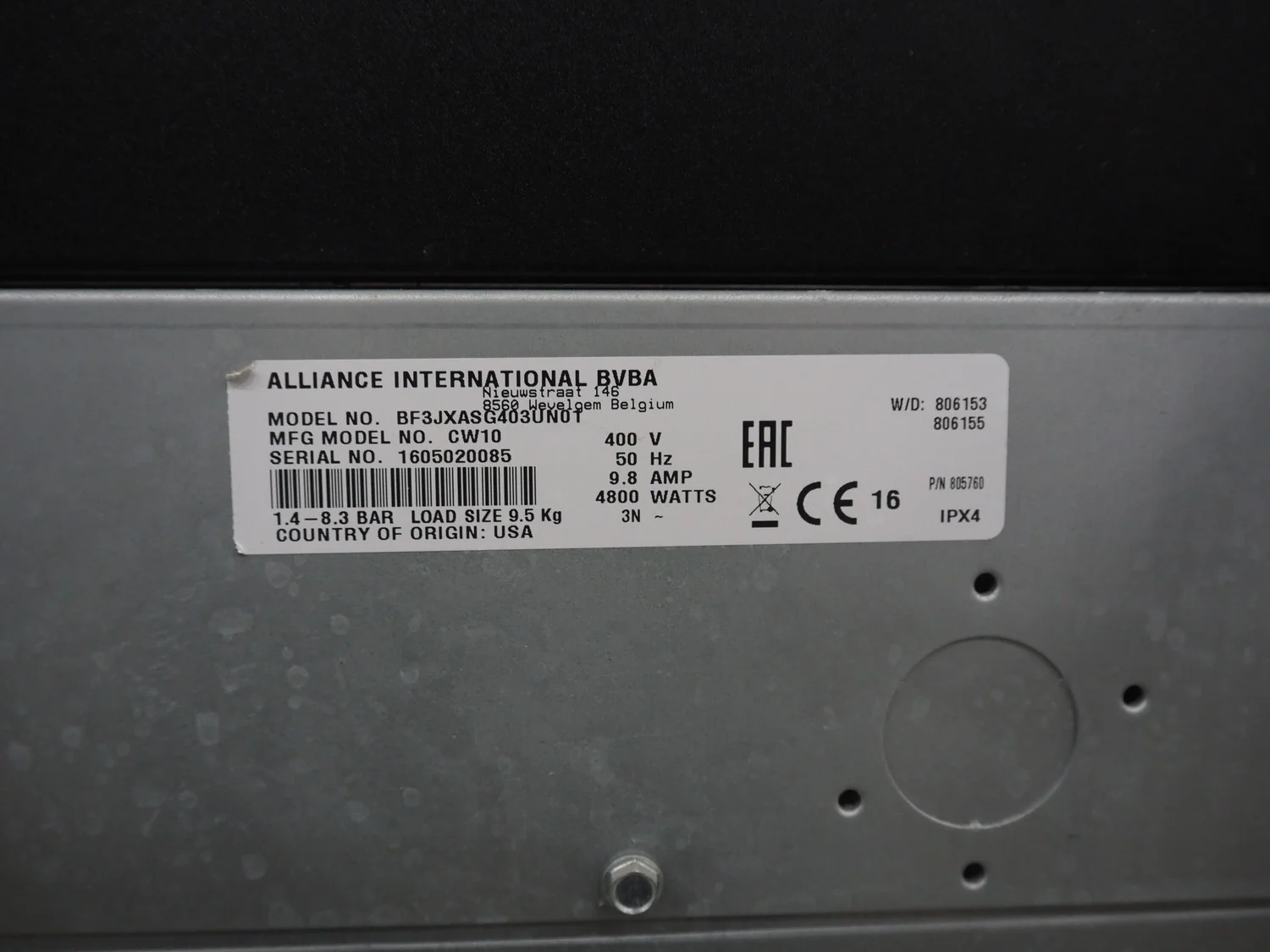 IPSO washing machine, model: BF3JXASG403EN01, serial number: 1605020085, 400 V, 3 Ph, 50 Hz, 9.8 A, 4800 Watt, dimensions: 730 mm x 680 mm x 1110 mm.