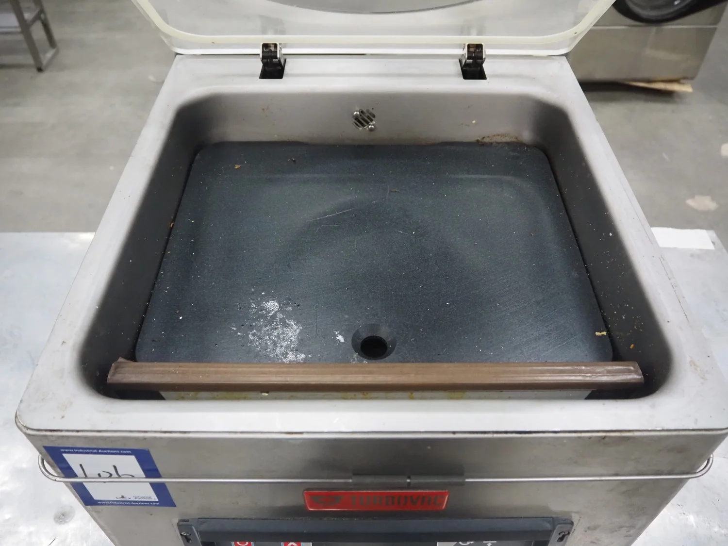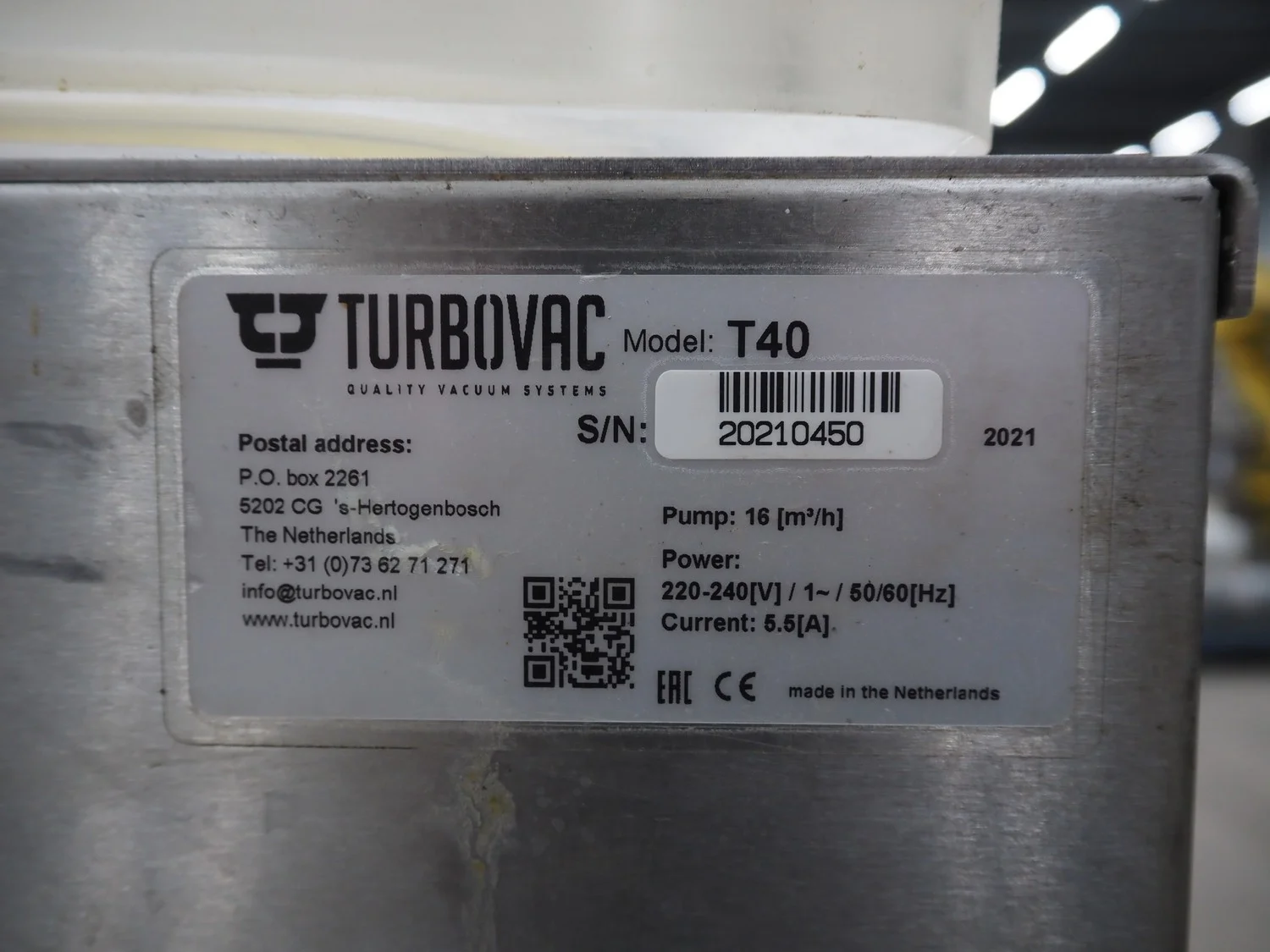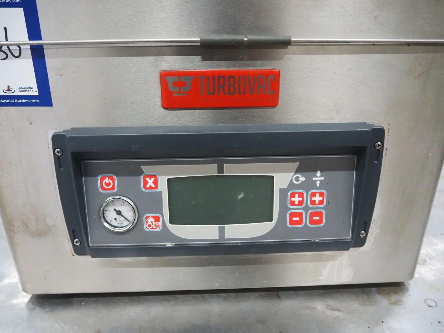 Turbovac vacuum machine, model: T40, serial number: 20210450, year of construction: 2010, 220-240 V, 1 Ph, 50/60 Hz, seal length: 430 mm, chamber dimensions: 450 mm x 400 mm, Busch vacuum pump, type: KB 0016 E, capacity: 19 m³ per hour, total dimensions: 550 mm x 500 mm x 430 mm.