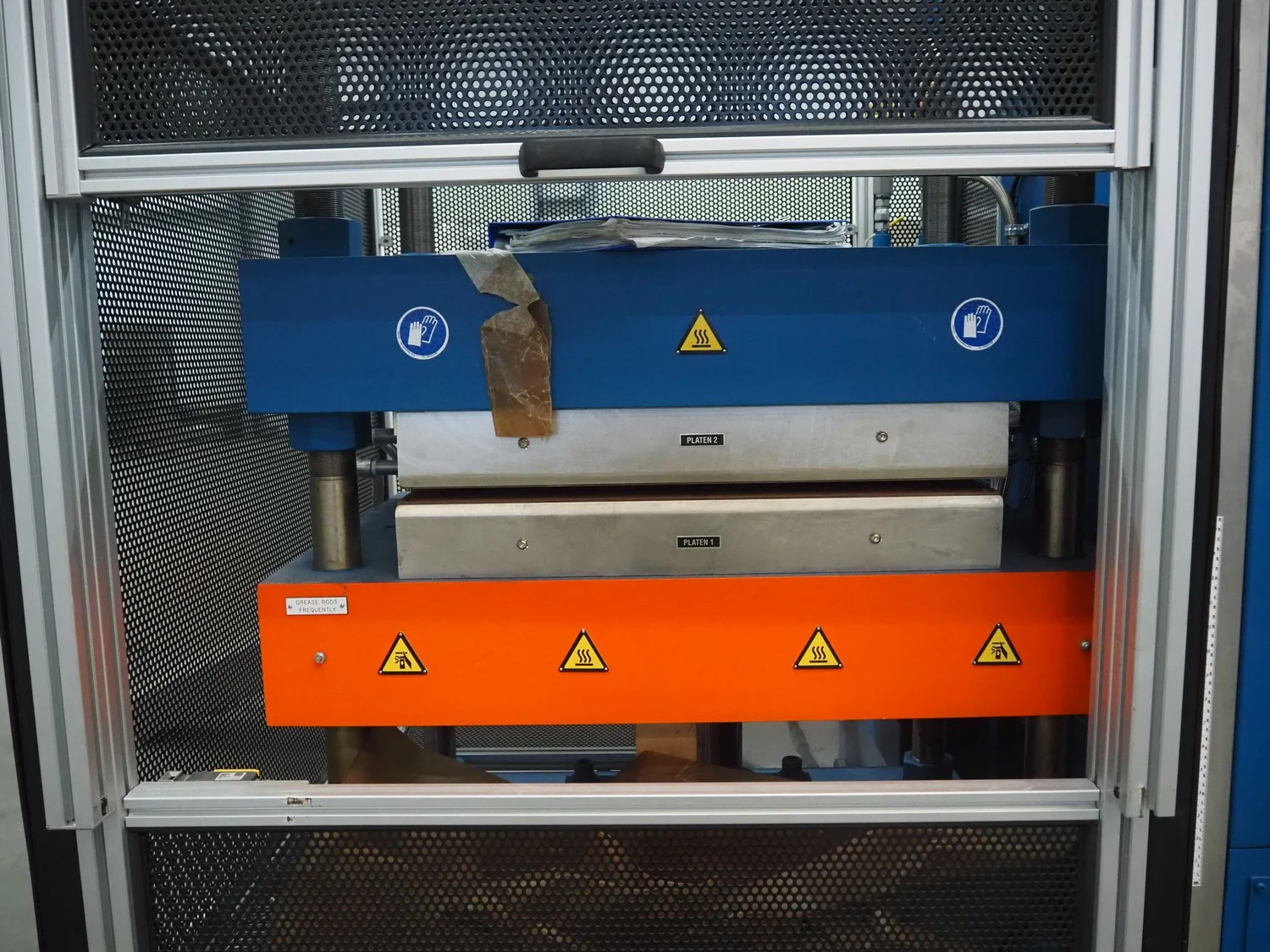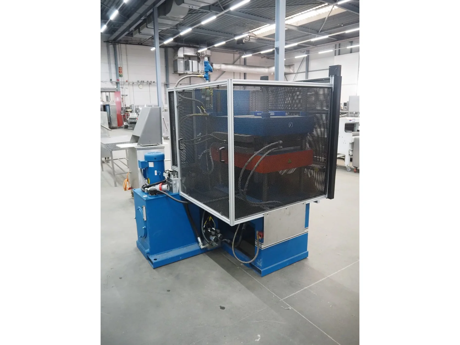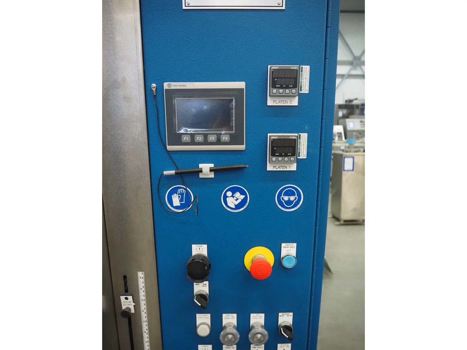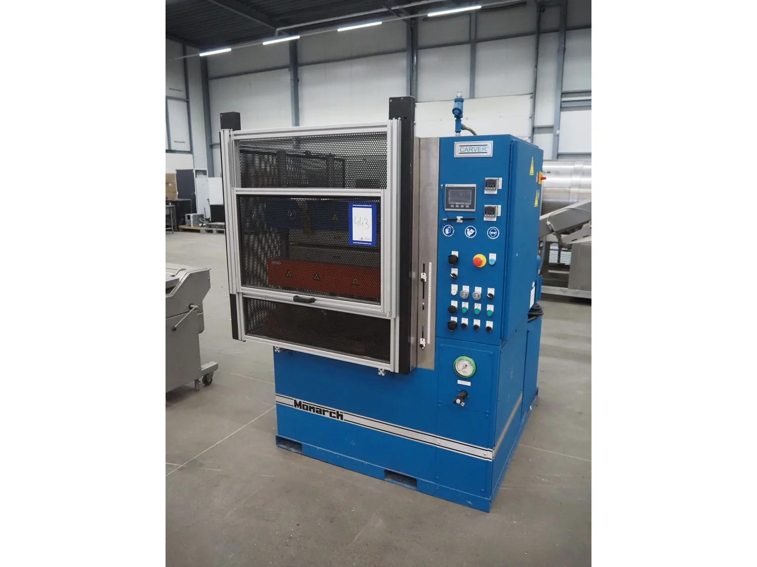 Carver compression molding press, model: CMG75H-24-CX-CE, serial number: 210499, year of construction: 02-2022, 415 V, 3 Ph, 50 Hz, 15000 Watt per plate, weight: 3036 kg, dimensions: 1550 mm x 1550 mm x 2000 mm.